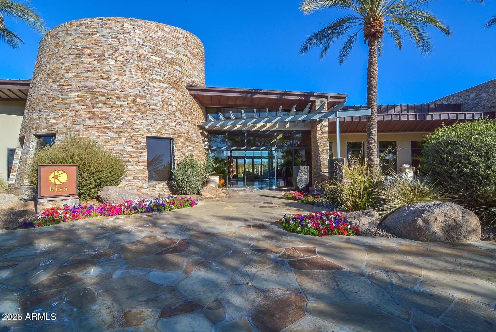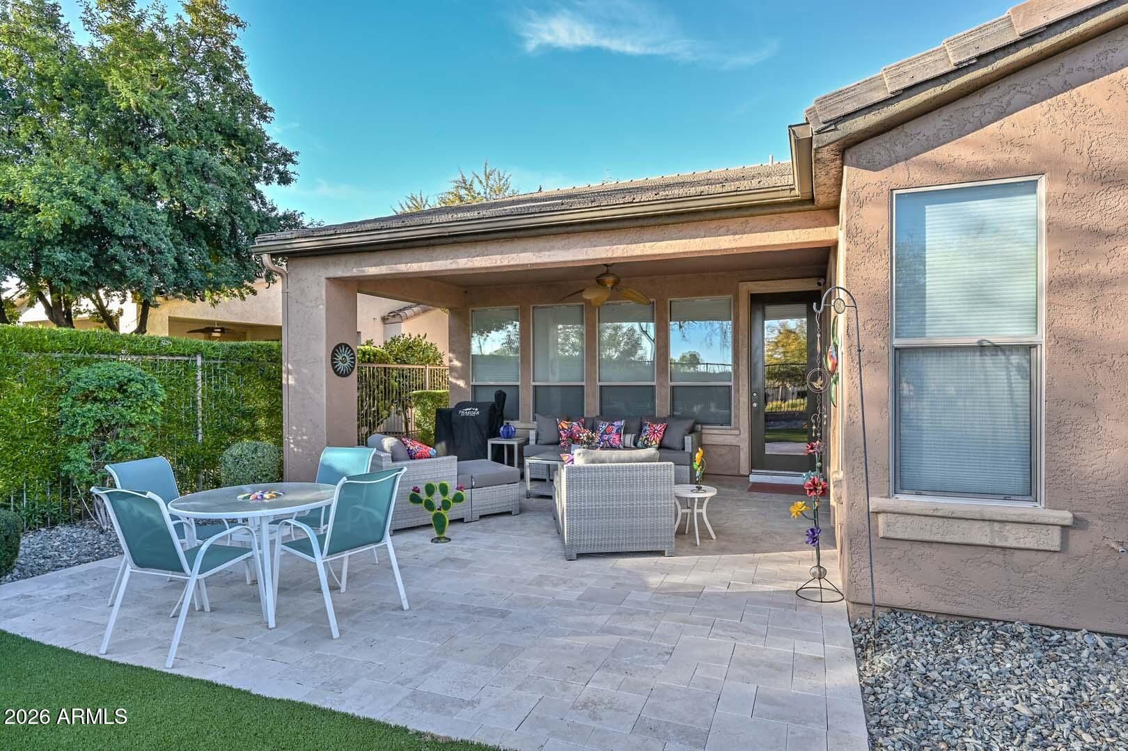 Gorgeous former model home located on Model Row, just steps from the Kiva Club and world-class amenities! This highly sought-after Flora floor plan sits on a private homesite with view fencing and a tranquil greenbelt backdrop. Enjoy outdoor living with a beautiful paver front courtyard, an extended tiled back patio and new artificial turf added to both front and back yards for low maintenance. Inside, the home showcases new luxury vinyl flooring, plantation shutters throughout, and a bright gourmet kitchen with a slider opening to the private courtyard. The kitchen was completely remodeled in 2024 with new designer cabinets to include cabinet pull out drawers, quartz countertops, full backsplash, enlarged kitchen island, and all-new high end black appliances with touches of... elegance throughout. The Great Room includes built-in surround sound speakers, perfect for entertaining. The den/office has been enhanced with an added closet and double doors, allowing it to function as a true third bedroom. The Owner's Suite features a private slider to the covered patio and a fully remodeled primary bathroom with new vanity, quartz countertops, tiled shower and new toilet. Updated guest bathroom includes new vanity, quartz counter top and toilet. Additional upgrades include new luxury plank vinyl flooring, a new AC unit (2024), new exterior paint 2024, and added cabinetry in the garage. Location, location, locationthis move-in-ready home combines luxury upgrades, privacy, and unbeatable proximity to amenities.