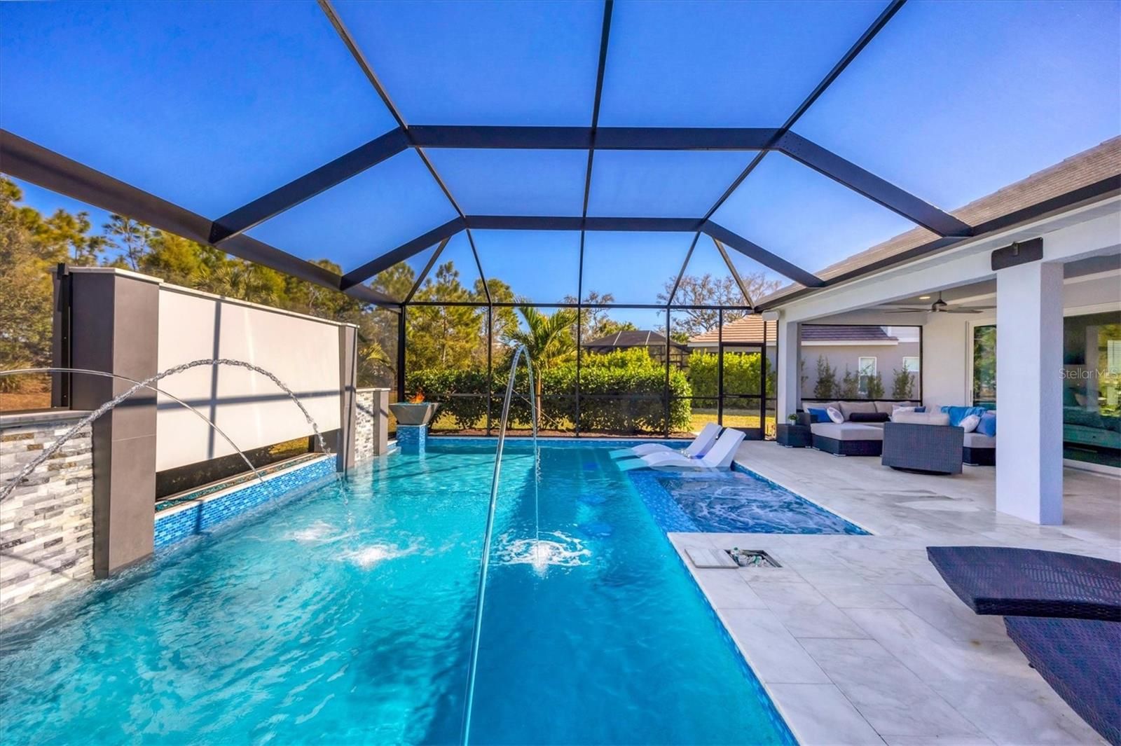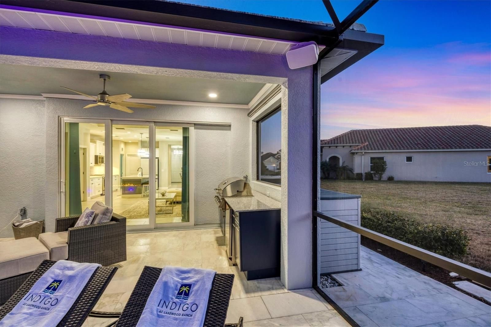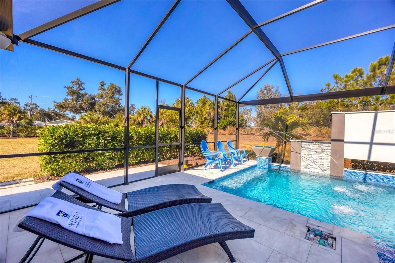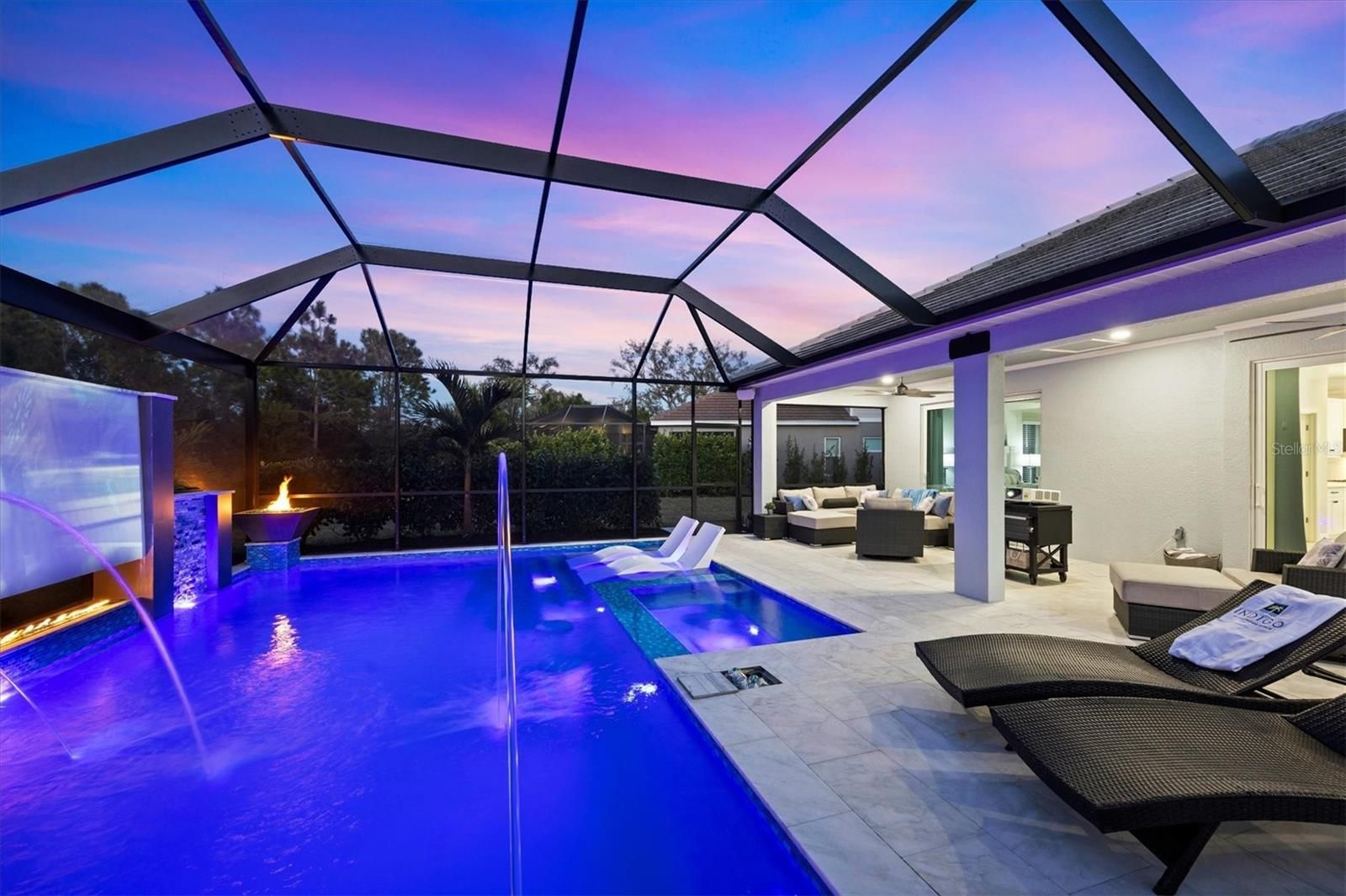Wait till you see this "Heritage" floorplan with its modern features, impeccable condition AND private pie shaped lot on a cul-de-sac road! This expansive home boasts 4 bedrooms, a LARGE loft area, 3 bathrooms, 2-car garage and a breathtaking covered lanai space with a one off ultra premium saltwater pool spa! Rest assured your new home is built strong and safe with its HURRICANE IMPACT rated glass throughout, cinder block construction, concrete tile roof, ''Guardian'' home alarm system and is located in the highly desirable X floodzone. Throughout the interior you will find 5 1/4" deco baseboards, multiple trey ceilings, LED recessed lighting, high level quartz countertops throughout, custom cabinetry in closets and much more! This home will continue to surprise you with it's private pet room located under the staircase, with its easy access and private location, your beloved pet (s) will be overjoyed to have their own space to relax. The great room with its expansive tray ceiling showcases a spacious environment with more than enough room to entertain guests. For all you kitchen enthusiasts, you will surely gravitate to this custom kitchen featuring a large Island with breakfast bar, upgraded porcelain backsplash, shaker cabinetry with LED undermount lighting that complements the high-level quartz countertops, and an oversized walk-in pantry. The exterior of this home sits very well with its larger than normal lot size, super private rear setting, and brand-new professionally installed landscaping throughout which further sets this home apart from the others! Open up the three paneled HURRICANE IMPACT rated POCKET sliders and prepare to be absolutely amazed! As you walk on the premium marble flooring upon entering the lanai, you'll be in absolute awe of the custom built-in kitchenette with "Bull" stainless steel gas grill with a matching fridge AND one of the most desirable pools seen in a residential home. This expansive fully optioned pool has: numerous water features, movie wall with "Sonos" outdoor sound system with underground subwoofer, TWO fire bowls with a fire trey under movie wall, multi-color LED lighting for pool/spa/barstoools with vertically mounted wall lights, "PebbleTec' with luminous glass blend and shimmering seas abalone, gas and electric heating, salt chlorinator w/Ph monitoring AND integrated dosing system, sunshelf w/umbrella sleeve, built-in deck drink cooler right next to your LARGE SIX person spa with DUAL QUAD therapeutic jet system all ran off its own dedicated jet pump. ALL of this can be operated from your smart device! WOW is right..Indigo is an active community that features a full time on-site manager as well as a full time activities director that manages an extensive calendar of activities for all ages. A-Rated Gullett Elementary AND Mona Jain Middle school are right outside our gates too! You can also expect sidewalks on both sides of the street, ''Oasis'' pool/spa, resort style heated community pool/spa at the main clubhouse where you will find 5 cabanas with an abundance of seating, 4 pickleball courts, 2 bocce ball courts, 24-hour exercise gym, meeting room/banquet room and playground. Indigo is not only a community that takes care of all ground maintenance to include mowing, fertilizing, irrigation, shrubs and mulch but is right around the corner to a plethora of dining, banking, entertainment, public transportation and MORE!