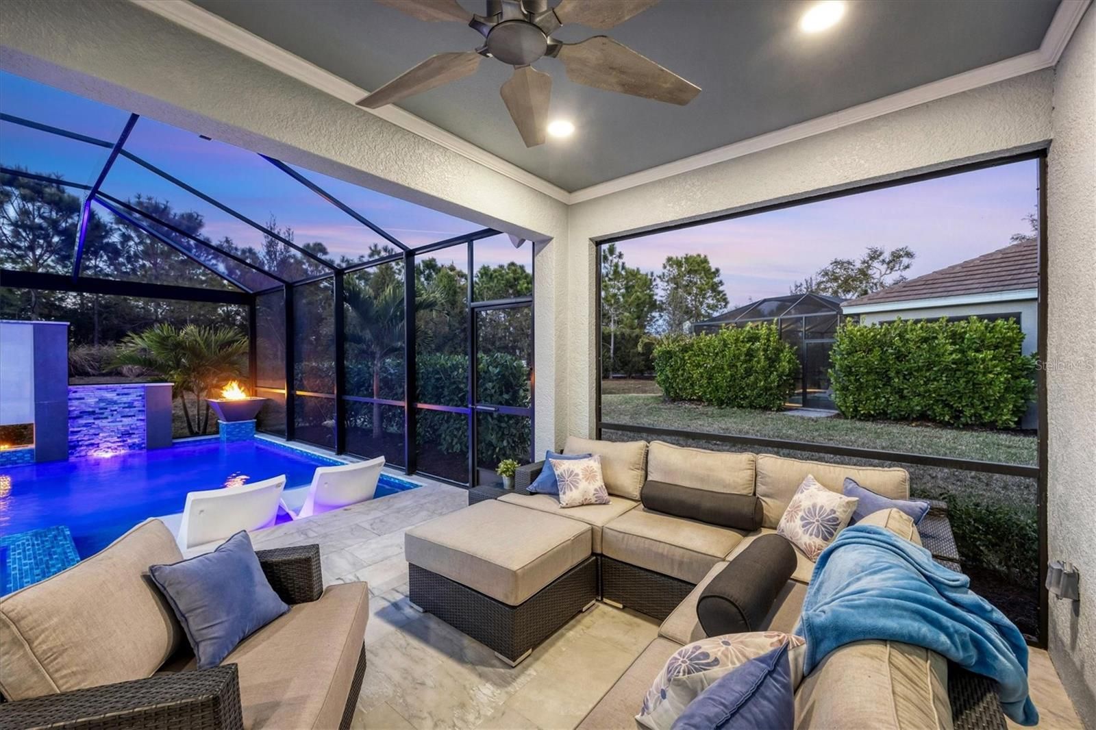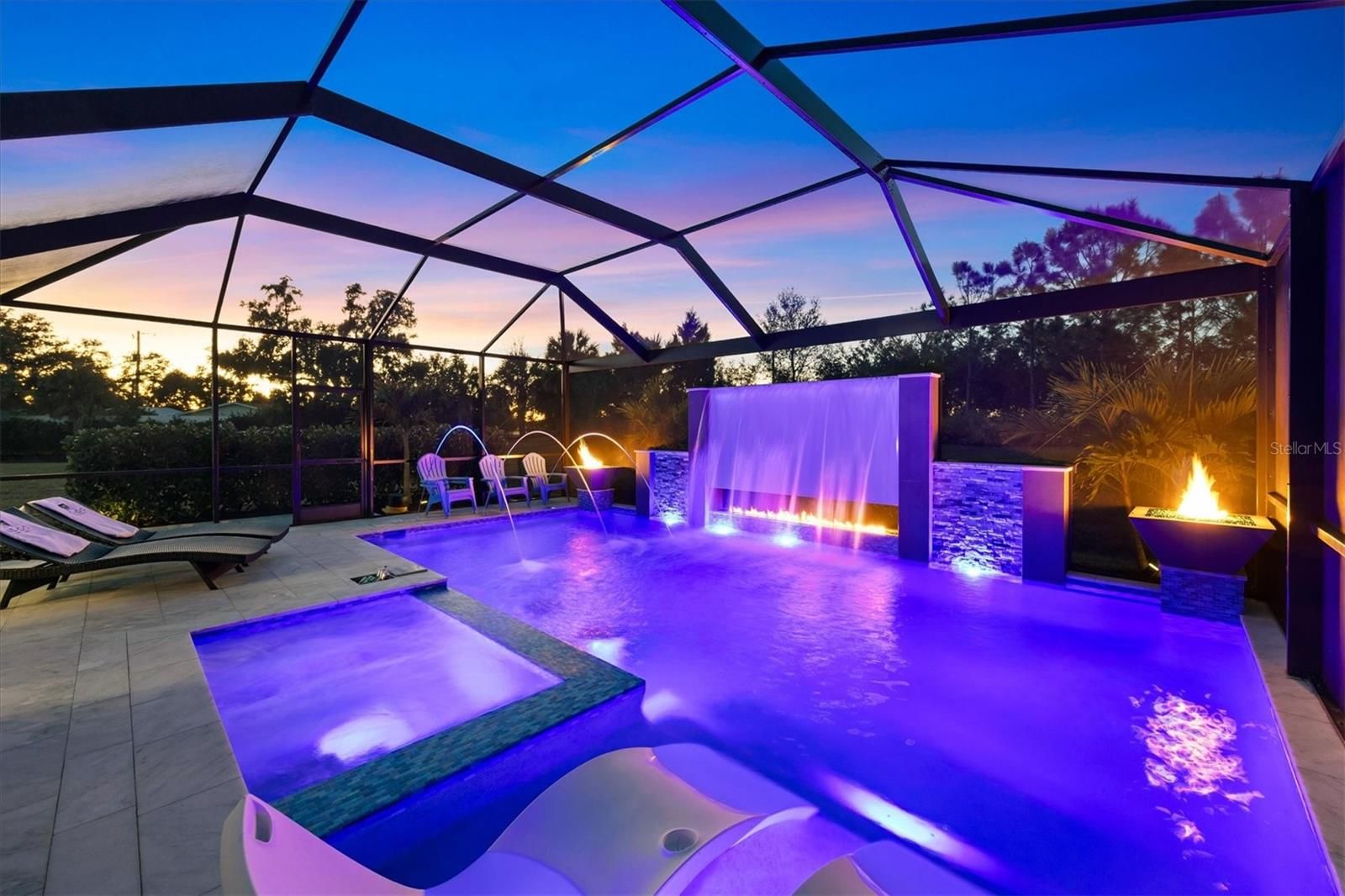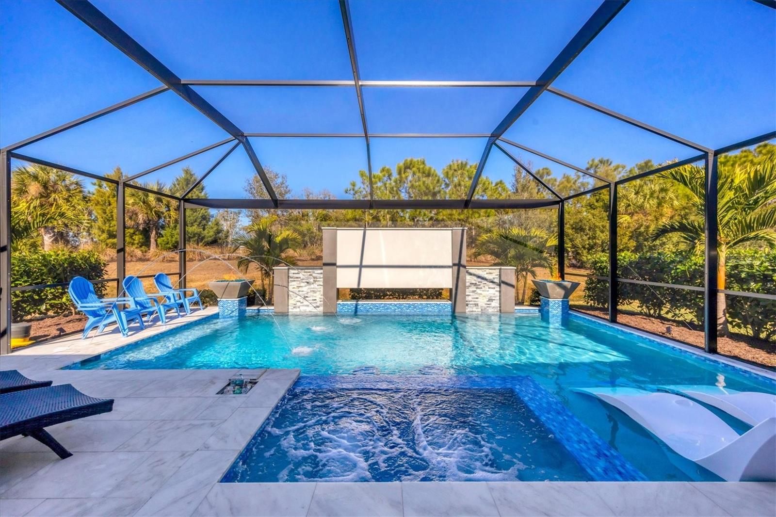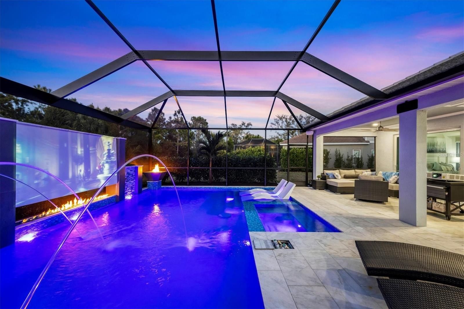 Wait till you see this "Heritage" floorplan with its modern features, impeccable condition AND private pie shaped lot on a cul-de-sac road! This expansive home boasts 4 bedrooms, a LARGE loft area, 3 bathrooms, 2-car garage and a breathtaking covered lanai space with a one off ultra premium saltwater pool spa! Rest assured your new home is built strong and safe with its HURRICANE IMPACT rated glass throughout, cinder block construction, concrete tile roof, ''Guardian'' home alarm system and is located in the highly desirable X floodzone. Throughout the interior you will find 5 1/4" deco baseboards, multiple trey ceilings, LED recessed lighting, high level quartz countertops throughout, custom cabinetry in closets and much more! This home will continue to surprise you with it's private pet room located under the staircase, with its easy access and private location, your beloved pet (s) will be overjoyed to have their own space to relax. The great room with its expansive tray ceiling showcases a spacious environment with more than enough room to entertain guests. For all you kitchen enthusiasts, you will surely gravitate to this custom kitchen featuring a large Island with breakfast bar, upgraded porcelain backsplash, shaker cabinetry with LED undermount lighting that complements the high-level quartz countertops, and an oversized walk-in pantry. The exterior of this home sits very well with its larger than normal lot size, super private rear setting, and brand-new professionally installed landscaping throughout which further sets this home apart from the others! Open up the three paneled HURRICANE IMPACT rated POCKET sliders and prepare to be absolutely amazed! As you walk on the premium marble flooring upon entering the lanai, you'll be in absolute awe of the custom built-in kitchenette with "Bull" stainless steel gas grill with a matching fridge AND one of the most desirable pools seen in a residential home. This expansive fully optioned pool has: numerous water features, movie wall with "Sonos" outdoor sound system with underground subwoofer, TWO fire bowls with a fire trey under movie wall, multi-color LED lighting for pool/spa/barstoools with vertically mounted wall lights, "PebbleTec' with luminous glass blend and shimmering seas abalone, gas and electric heating, salt chlorinator w/Ph monitoring AND integrated dosing system, sunshelf w/umbrella sleeve, built-in deck drink cooler right next to your LARGE SIX person spa with DUAL QUAD therapeutic jet system all ran off its own dedicated jet pump. ALL of this can be operated from your smart device! WOW is right..Indigo is an active community that features a full time on-site manager as well as a full time activities director that manages an extensive calendar of activities for all ages. A-Rated Gullett Elementary AND Mona Jain Middle school are right outside our gates too! You can also expect sidewalks on both sides of the street, ''Oasis'' pool/spa, resort style heated community pool/spa at the main clubhouse where you will find 5 cabanas with an abundance of seating, 4 pickleball courts, 2 bocce ball courts, 24-hour exercise gym, meeting room/banquet room and playground. Indigo is not only a community that takes care of all ground maintenance to include mowing, fertilizing, irrigation, shrubs and mulch but is right around the corner to a plethora of dining, banking, entertainment, public transportation and MORE!