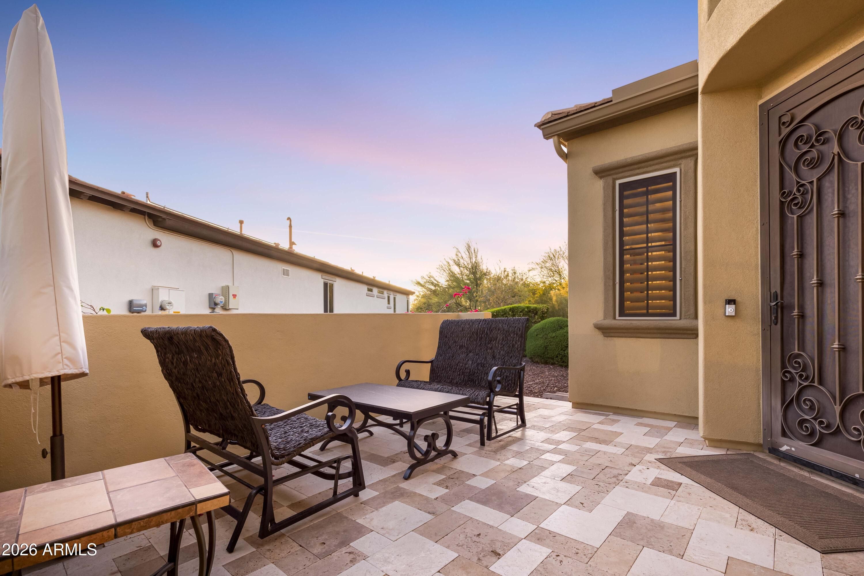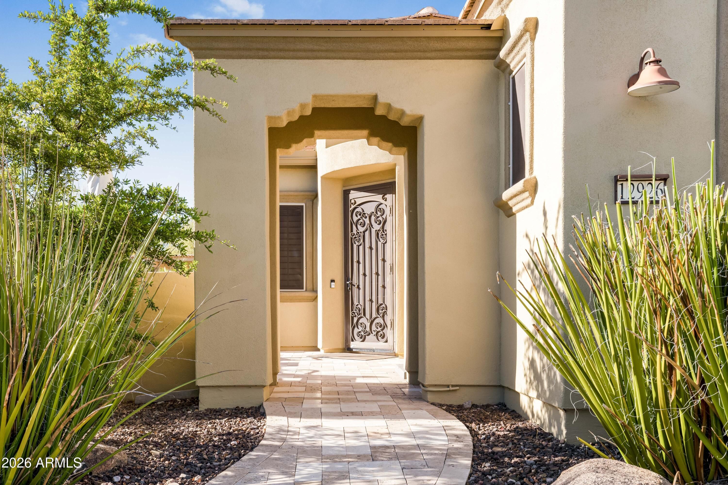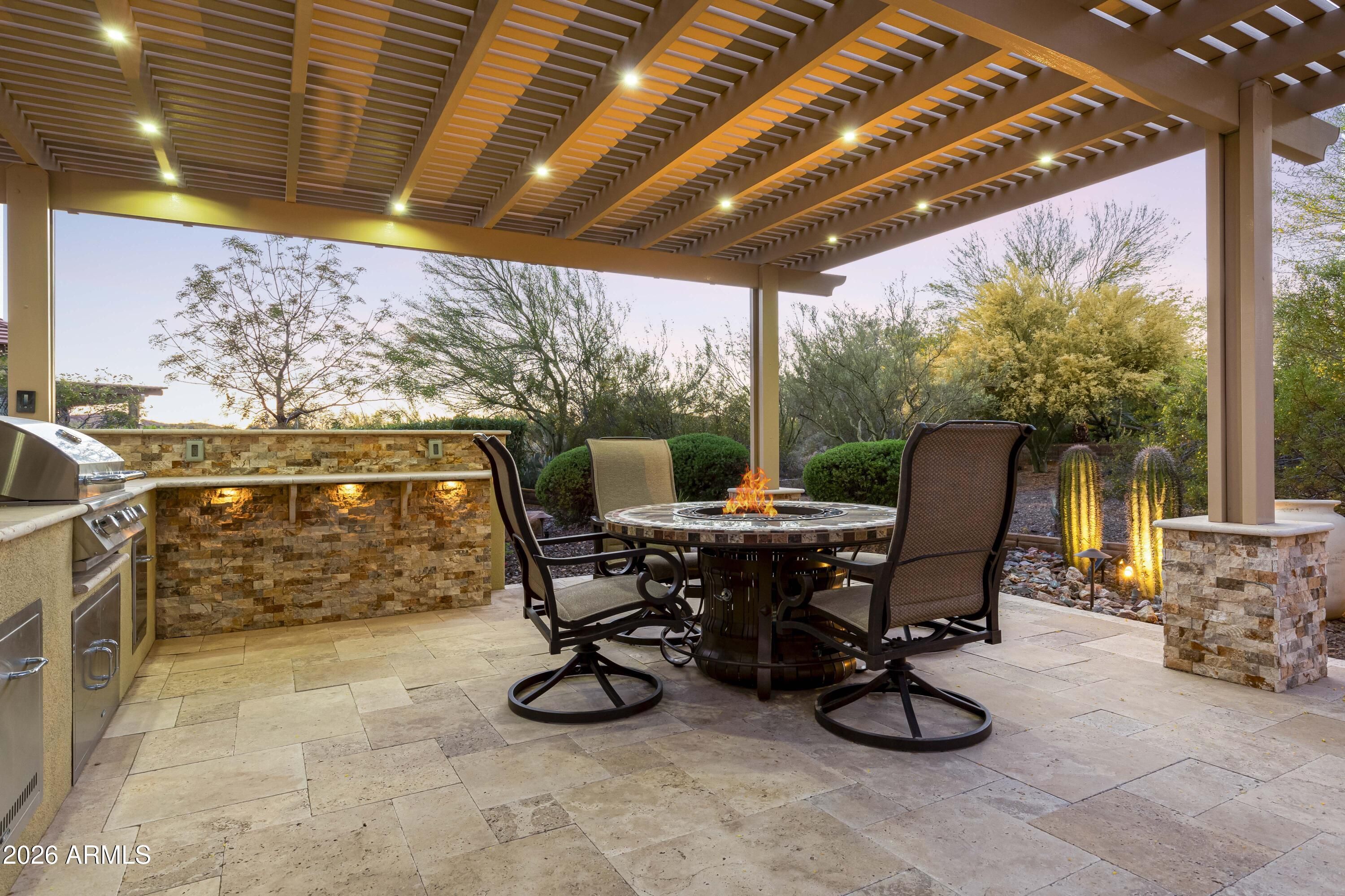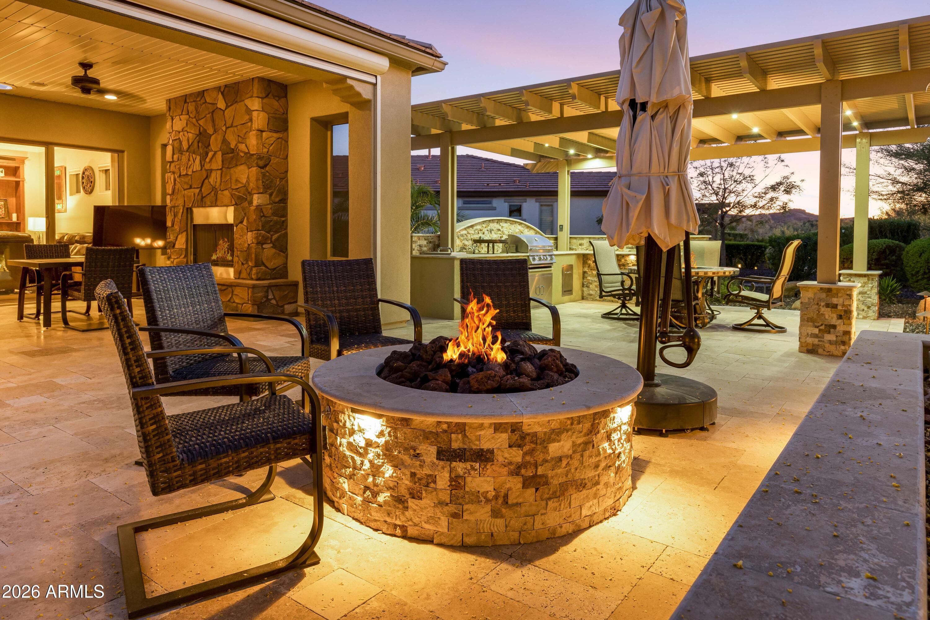 This stunning Genova model (built in 2011) is truly spectacular! Situated on an oversized lot in close proximity to the Kiva Club, the home offers breathtaking mountain views and exceptional curb appeal, complete with a travertine walkway, charming courtyard, and mature landscaping. Step through the impressive rotunda entry and experience custom finishes throughout. The gourmet kitchen is a chef's dream, featuring granite countertops, high-end cabinetry with rollout drawers, under- and over-cabinet lighting, pendant lighting, and gas appliances. The versatile den/office includes a built-in Murphy bed, and the extended guest suite with its own upgraded private bathroom--perfect for hosting visitors. You'll love the extensive built-ins & crown molding, 10ft ceilings & window treatements throughout the home. The great room is designed for entertaining with a custom entertainment wall, surround sound, and a rolling wall of glass that seamlessly blends indoor and outdoor living. Adjacent to the kitchen and great room, the dining area features a built-in server and large picture windows, creating a bright and elegant space for gatherings. The Smart Space offers incredible functionality with two built-in desks, a large pantry, and an abundance of cabinetry for storage. The luxurious primary suite showcases designer touches including barn door, stone countertops, framed mirrors, a tiled walk-in shower, and a relaxing soaking tub. Step outside to your private backyard oasis--an entertainer's dream. Enjoy a stone fireplace off the patio, an extended travertine patio, and a motorized drop-down shade that fully encloses the covered patio for year-round comfort. The outdoor space also features a fire pit, built-in BBQ bar/island with pergola, and extensive lighting, creating the perfect setting for relaxing or hosting guests. Additional upgrades include water softener, reverse osmosis system, wood plantation shutters, sunscreens , upgraded flooring, ceiling fans and lighting, iron screen door, and an oversized garbage enclosure with a lighted paver path. The garage is equally impressive with built-in cabinetry and epoxy floors, and the extended guest suite includes its own additional A/C unit for optimal comfort. NEWER Tankless Hot Water Heater, AC Unit and Irrigation Systems ! This home truly has it all--luxury, functionality, and exceptional indoor-outdoor living.