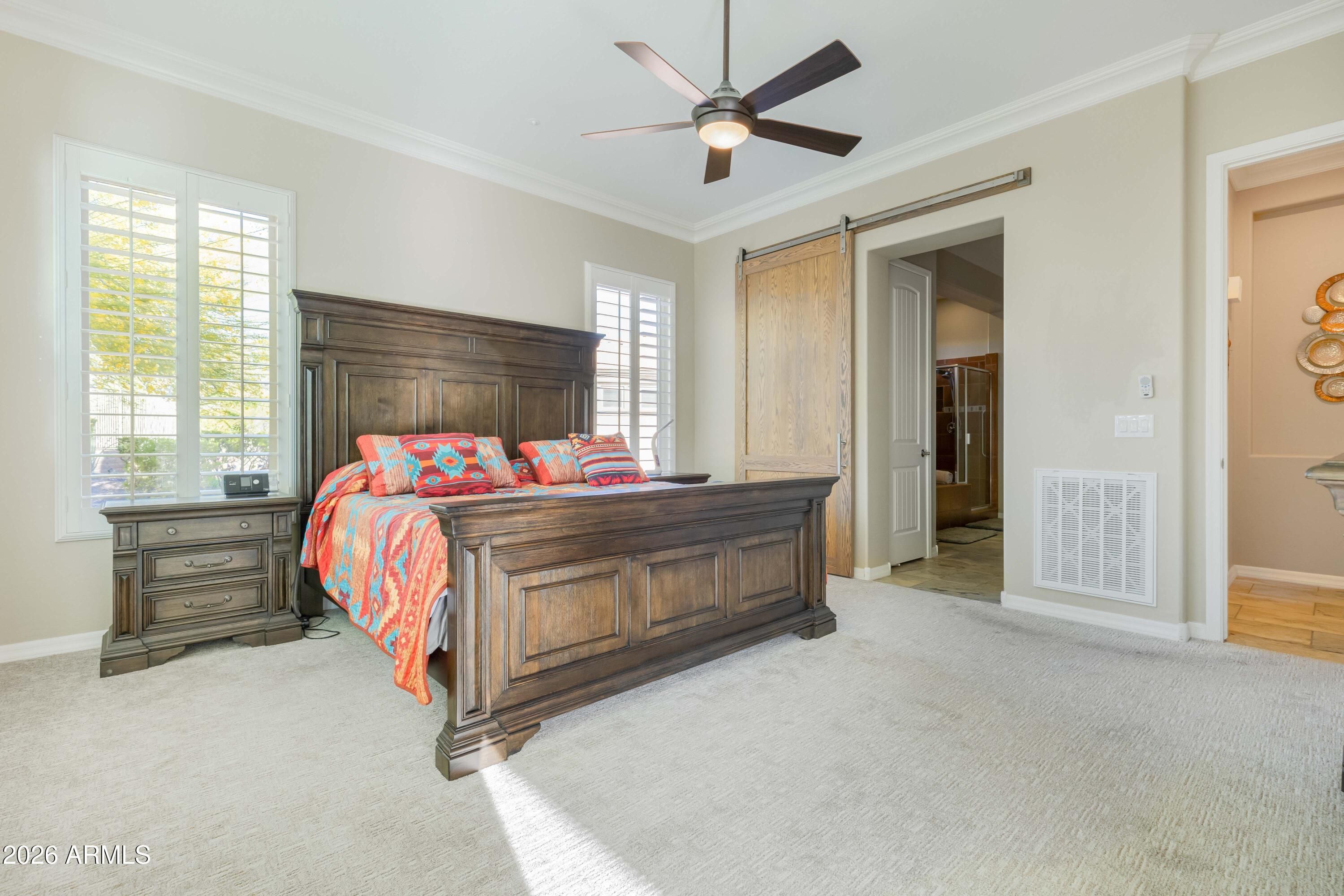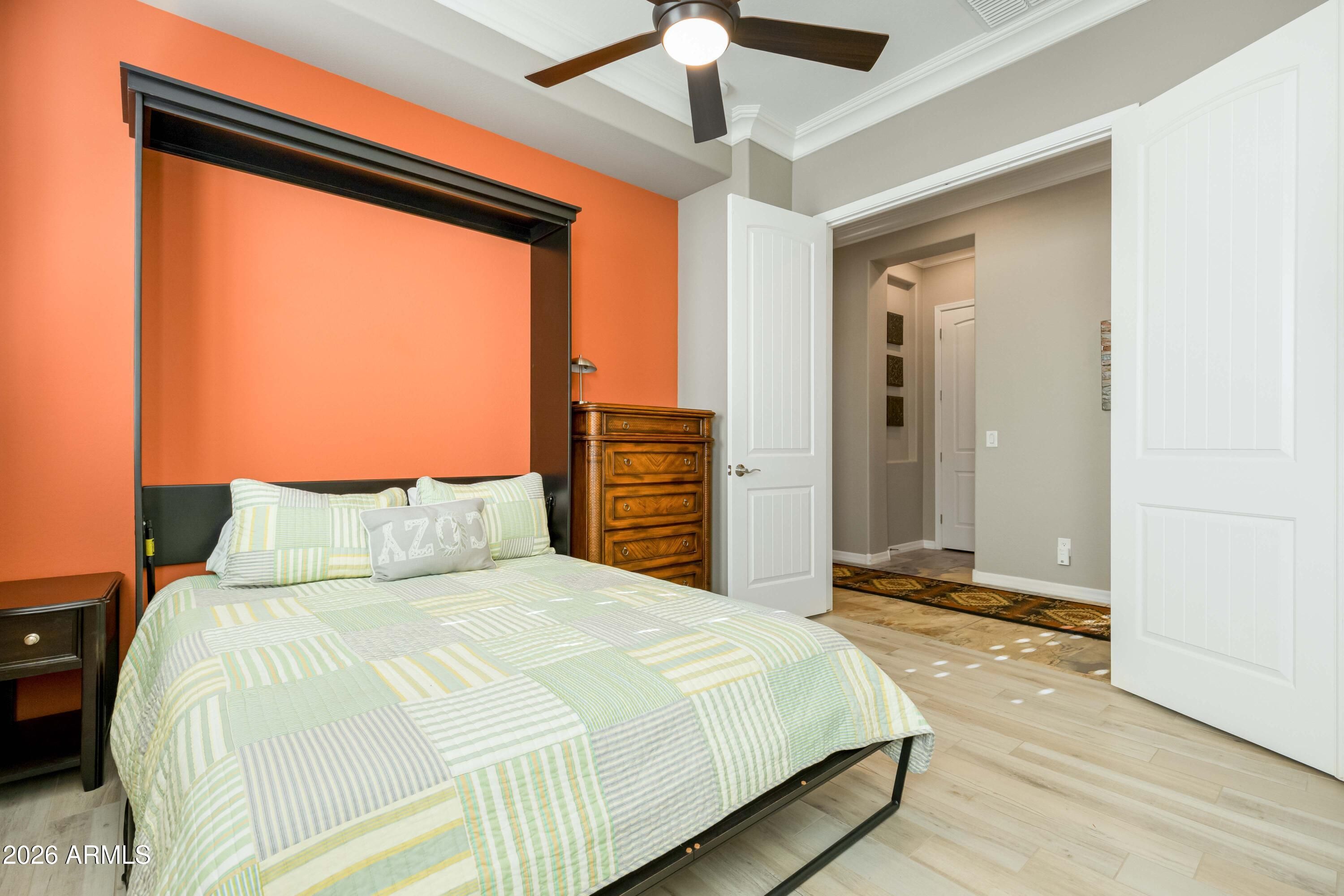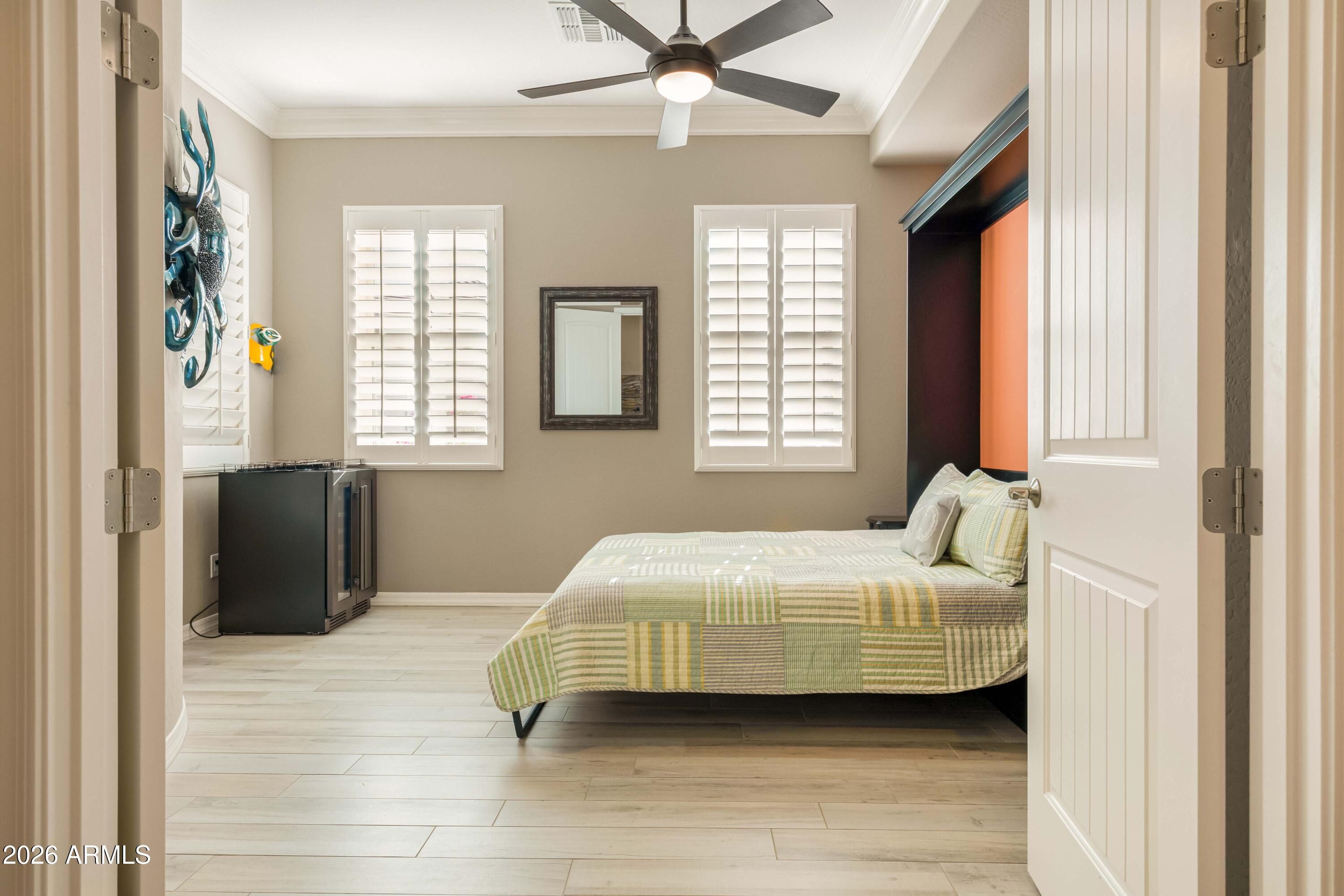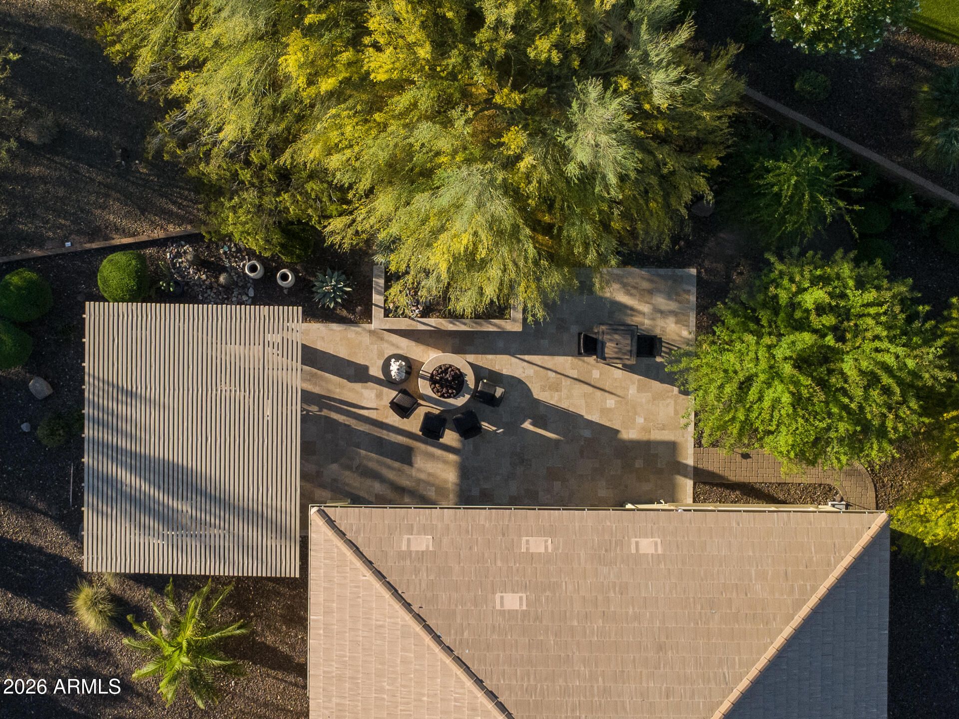 This stunning Genova model (built in 2011) is truly spectacular! Situated on an oversized lot in close proximity to the Kiva Club, the home offers breathtaking mountain views and exceptional curb appeal, complete with a travertine walkway, charming courtyard, and mature landscaping. Step through the impressive rotunda entry and experience custom finishes throughout. The gourmet kitchen is a chef's dream, featuring granite countertops, high-end cabinetry with rollout drawers, under- and over-cabinet lighting, pendant lighting, and gas appliances. The versatile den/office includes a built-in Murphy bed, and the extended guest suite with its own upgraded private bathroom--perfect for hosting visitors. You'll love the extensive built-ins & crown molding, 10ft ceilings & window treatements throughout the home. The great room is designed for entertaining with a custom entertainment wall, surround sound, and a rolling wall of glass that seamlessly blends indoor and outdoor living. Adjacent to the kitchen and great room, the dining area features a built-in server and large picture windows, creating a bright and elegant space for gatherings. The Smart Space offers incredible functionality with two built-in desks, a large pantry, and an abundance of cabinetry for storage. The luxurious primary suite showcases designer touches including barn door, stone countertops, framed mirrors, a tiled walk-in shower, and a relaxing soaking tub. Step outside to your private backyard oasis--an entertainer's dream. Enjoy a stone fireplace off the patio, an extended travertine patio, and a motorized drop-down shade that fully encloses the covered patio for year-round comfort. The outdoor space also features a fire pit, built-in BBQ bar/island with pergola, and extensive lighting, creating the perfect setting for relaxing or hosting guests. Additional upgrades include water softener, reverse osmosis system, wood plantation shutters, sunscreens , upgraded flooring, ceiling fans and lighting, iron screen door, and an oversized garbage enclosure with a lighted paver path. The garage is equally impressive with built-in cabinetry and epoxy floors, and the extended guest suite includes its own additional A/C unit for optimal comfort. NEWER Tankless Hot Water Heater, AC Unit and Irrigation Systems ! This home truly has it all--luxury, functionality, and exceptional indoor-outdoor living.