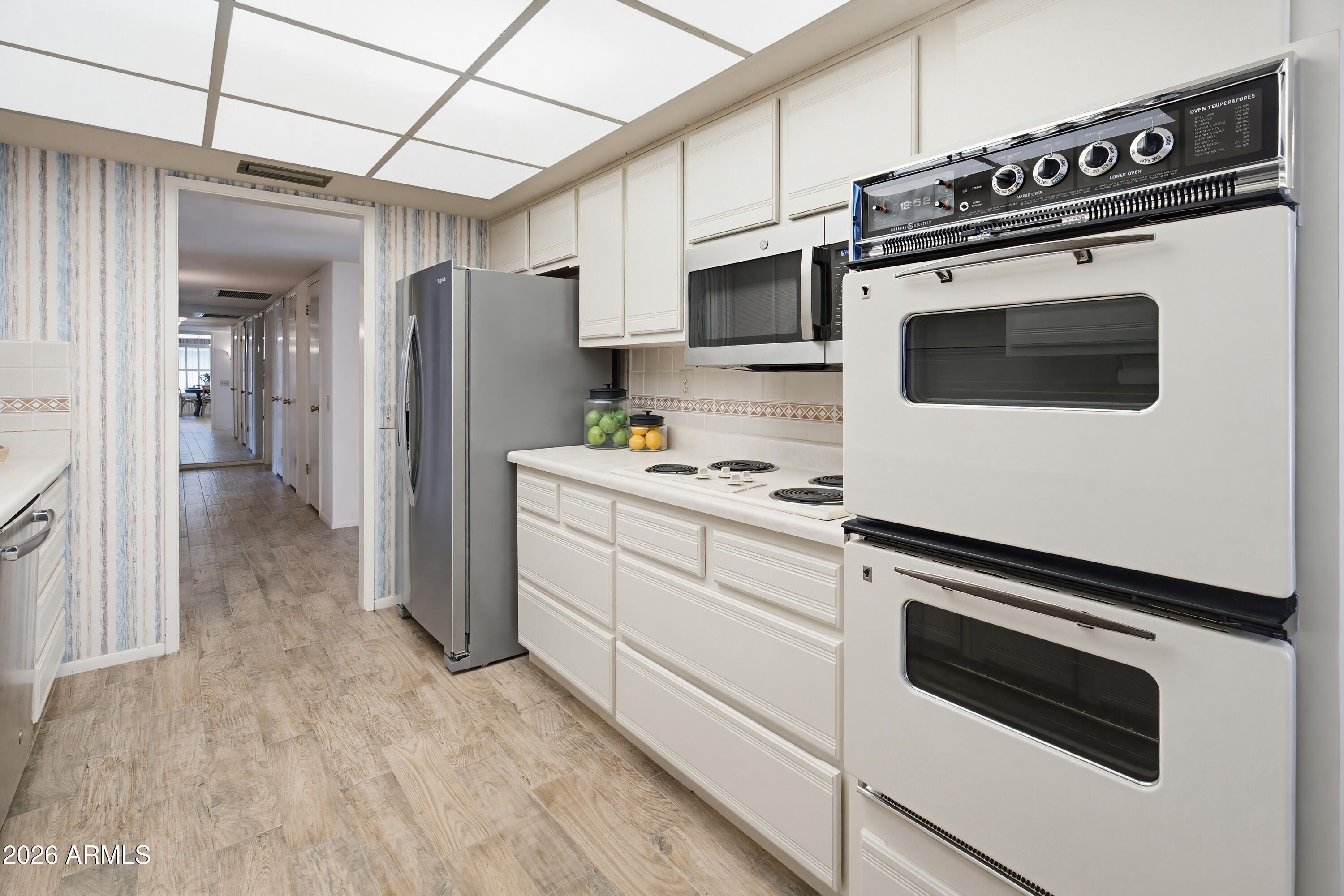Enter through a charming iron-gated private courtyard that sets the tone for this beautifully inviting Gemini home in Sun City West, then step through grand double doors into a light-filled open floorplan that feels both spacious and welcoming. Gorgeous wood plank tile flooring guides you through the entry, kitchen, and hallways, while skylights pour sunshine into the expansive living area that flows seamlessly into an elegant formal dining space — perfect for entertaining or quiet evenings at home. The kitchen is thoughtfully designed with a double oven, built-in microwave, stainless steel dishwasher and refrigerator, and a cheerful eat-in breakfast nook ideal for morning coffee. Guests will appreciate the generously sized bedroom with walk-in closet, while the primary suite offers a peaceful retreat complete with private bath and its own walk-in closet. Relax and unwind with tranquil views of the lush common area or enjoy the flexible Arizona room, perfect for hobbies, reading, or additional entertaining space. A 2-car garage with abundant storage adds everyday convenience. All of this is nestled in Sun City West's renowned active adult community, where golf, swimming, pickleball, recreation centers, clubs, and endless social activities create a true resort-style lifestyle.