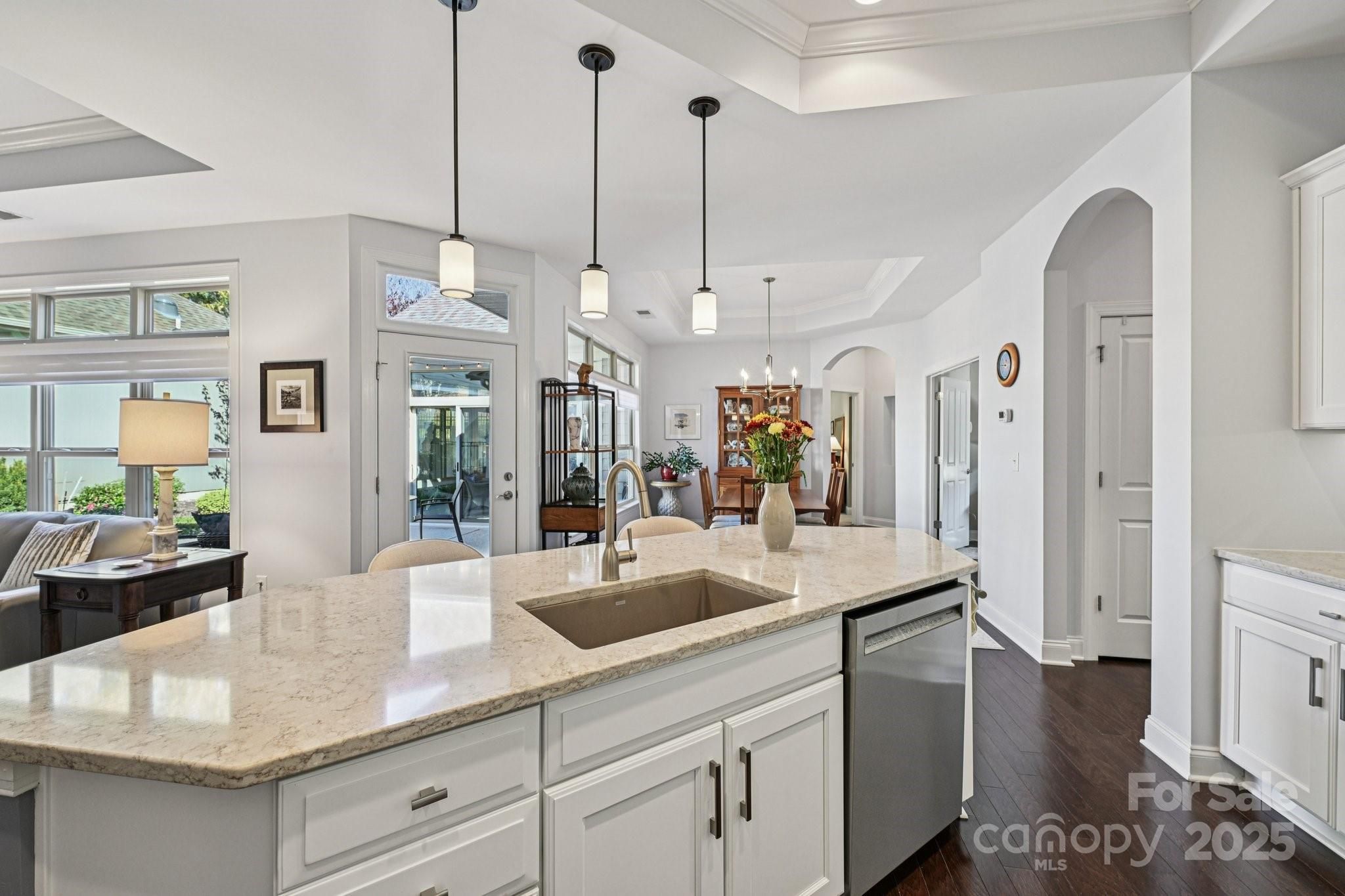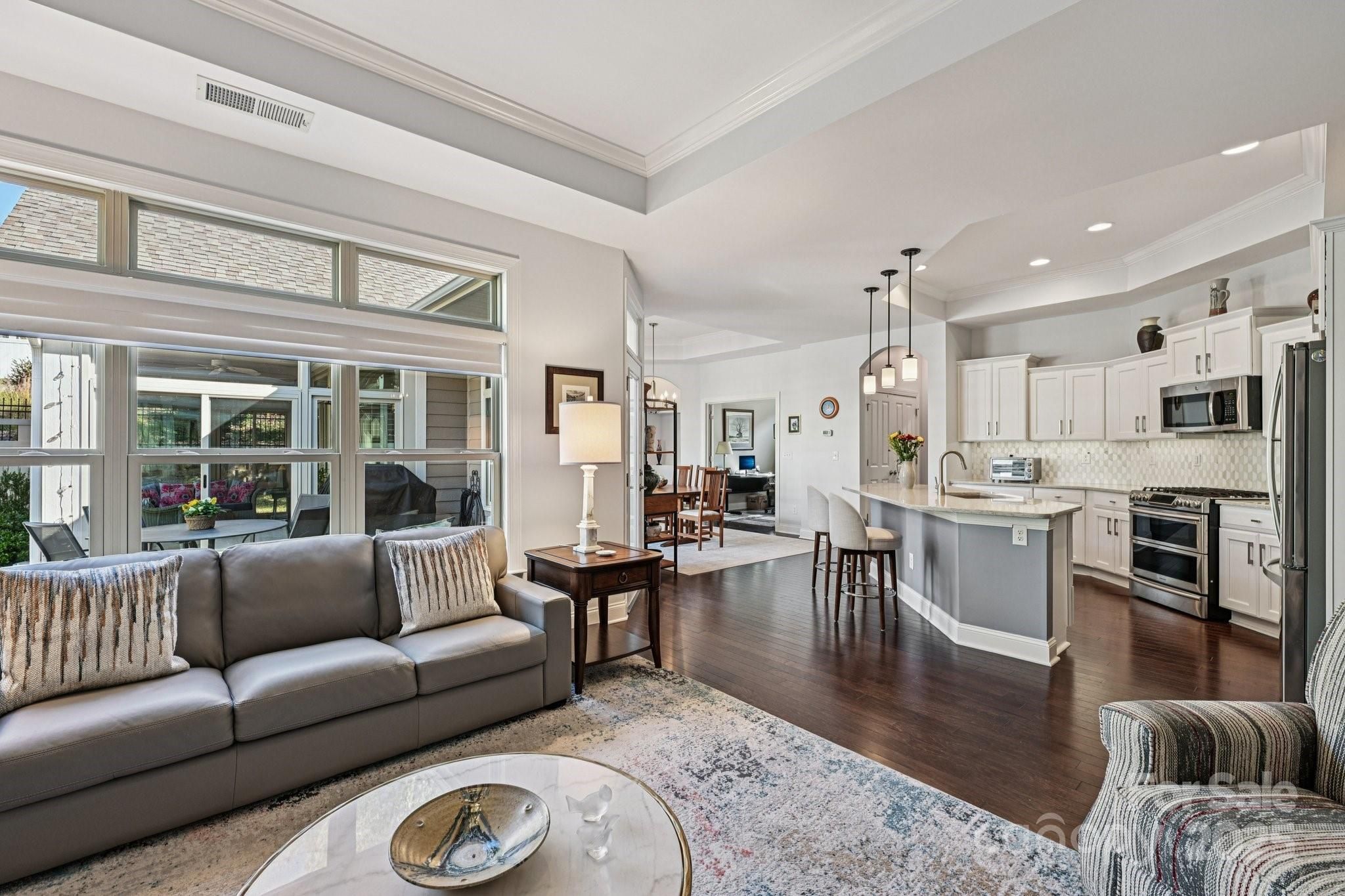 Discover effortless luxury in this beautifully upgraded 2-bedroom, 2-bath ranch in The Courtyards of Marvin—one of the Waxhaw and Charlotte area’s premier 55+ communities. Bright and open, windows everywhere bringing the outside in! This home features hardwood floors, recessed lighting and inviting living room with custom shades and dining area. The modern kitchen shines with quartz countertops, updated lighting, stainless steel apps, lovely white painted cabinetry with custom tile backsplash and a large island—perfect for everyday living or entertaining. A French-door den offers flexible space for work or relaxation. The serene primary suite impresses with a spacious bath featuring skylight, dual vanities and a zero-entry tile shower, plus generous walk-in closet. From the Primary suite, direct access to the lovely added Sunroom- what a treat to enjoy the outdoors protected and in privacy. Sizeable second bedroom and full bath provide ideal guest or hobby space. Outdoor living is effortless with a professionally coated anti-slip patio—complete with paver walk-ways and lush landscape, perfect for morning coffee or gatherings. Tons of storage available, interior storage closet and in the 2 car garage. Best of all, move-in ready with refrigerator, washer and dryer to remain! HOA-included lawn care means low-maintenance living at its finest. Enjoy the perfect blend of elegance, comfort, and convenience in this exceptional Courtyards of Marvin home.