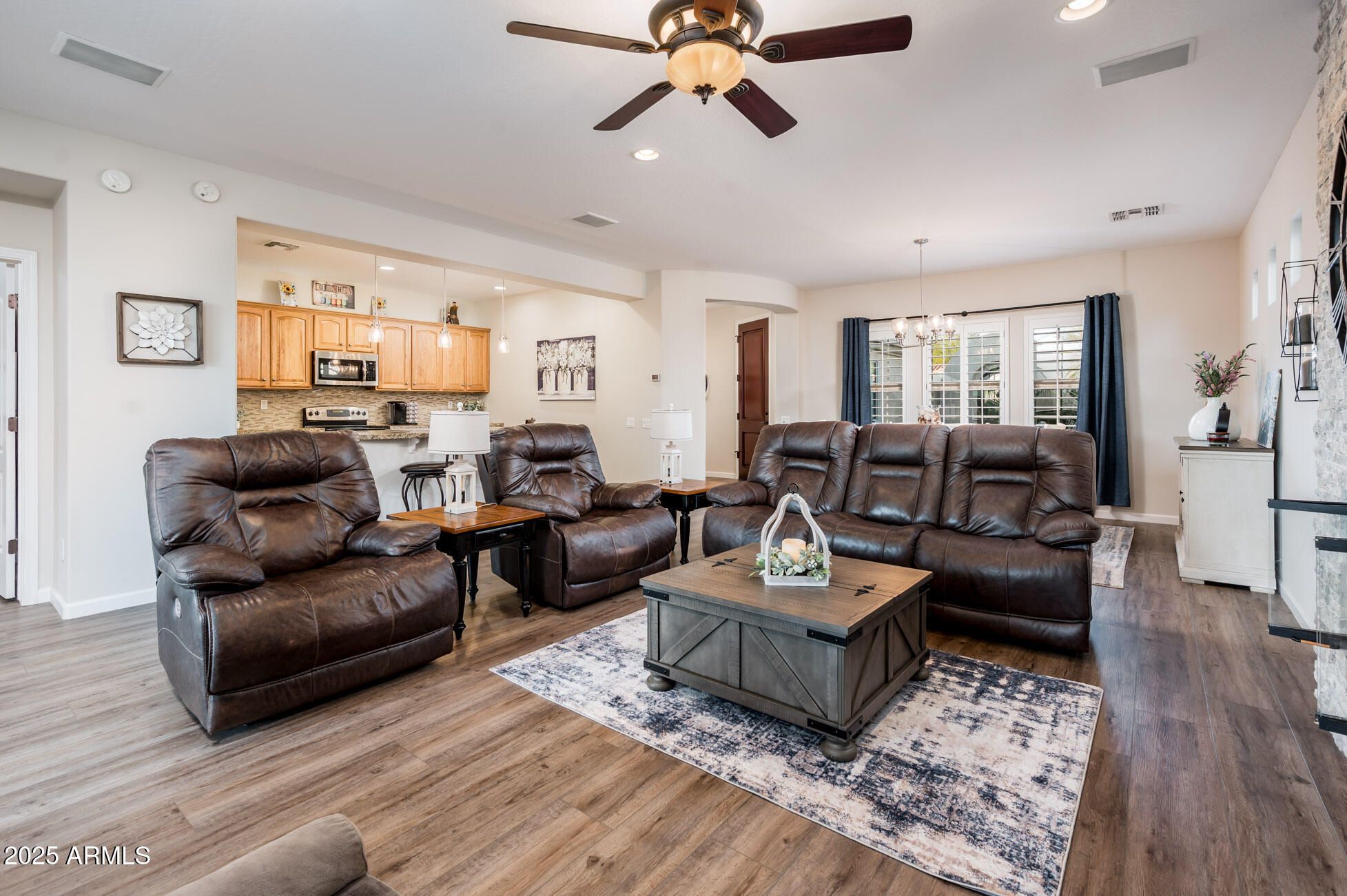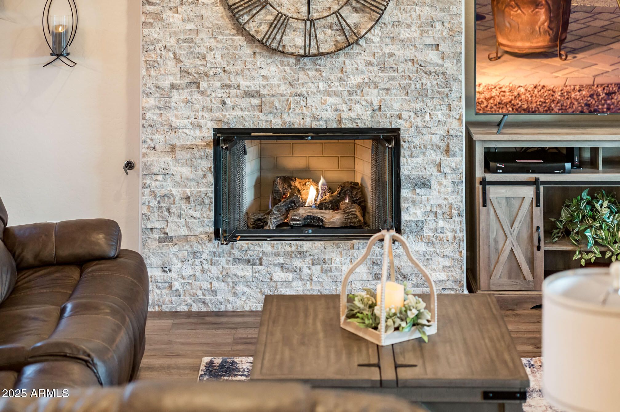 A refined blend of space, style, and sophistication awaits in this beautifully enhanced San Marco Model, ideally situated in a prime central location within the gated community of Corte Bella. Offering 1,904 sq ft of thoughtfully designed living space, this residence features 2 bedrooms, a den, 2 bathrooms, and an expanded garage—crafted for comfort and elevated living. Enter through a charming front courtyard into a dramatic foyer, where you'll find 2023-installed Luxury Vinyl Plank flooring throughout, elegant Plantation Shutters, a striking 2022 Stack Stone Fireplace, and fully remodeled primary and guest bathrooms completed in 2022. The kitchen showcases upgraded granite countertops, upper and lower cabinet lighting, stylish pendant fixtures, and a new dining chandelier, creating a warm and inviting culinary space. Recent mechanical upgrades include a 2025 Trane 5 Ton Split Attic A/C and Furnace system, along with a newer hot water tank, ensuring peace of mind and energy efficiency. The expansive, fenced backyard sits on a generous lot perfectly suited for a future pool, gourmet outdoor kitchen, or a full alfresco living retreat. From curb appeal to interior finishes, this San Marco model checks all the boxes discerning buyers seek. Whether you're looking for a full-time residence or a seasonal escape, this home offers exceptional comfort, timeless style, and enduring value in one of the West Valley's most coveted communities.