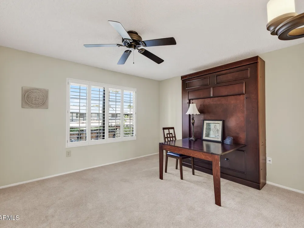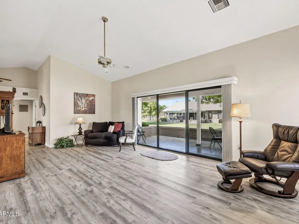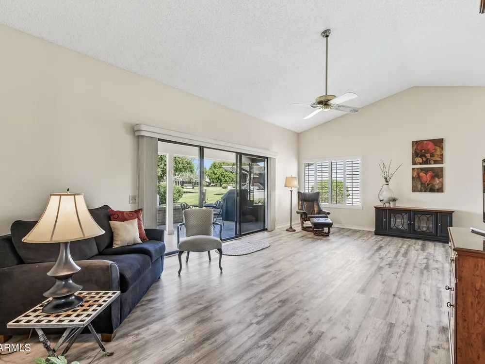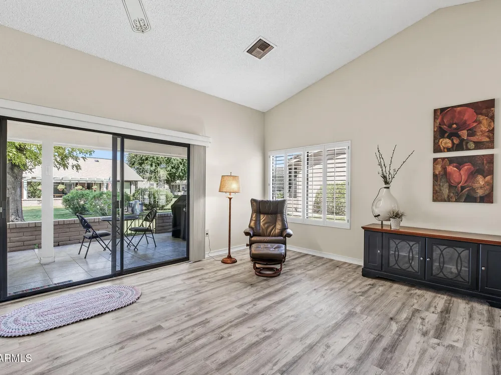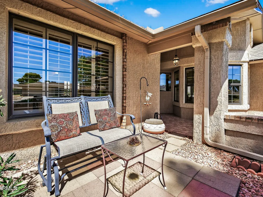 Bright, tasteful, and tidy—this updated 2bed/2bath Pima plan is move-in ready and furnished if desired! With 1,635sq ft of living space, vaulted ceilings, and an open feel, it's perfect for entertaining or relaxing in style. Enjoy your morning coffee on the charming front patio, or unwind on the sunset-facing back patio with lush greenbelt views—fully maintained by the HOA. Inside, you'll find granite counters, plantation shutters, updates to the kitchen and baths, newer lighting and plumbing fixtures, 2022 roof/HVAC, neutral tile/LVP/carpet throughout, fresh interior paint, and a flexible 2nd bedroom with clever Murphy bed/desk combo. The spacious laundry room even doubles as an office or craft area! Pets OK within the HOA guidelines. Come see it today!