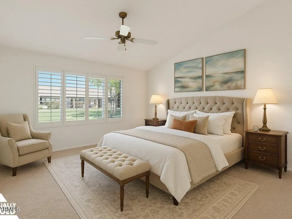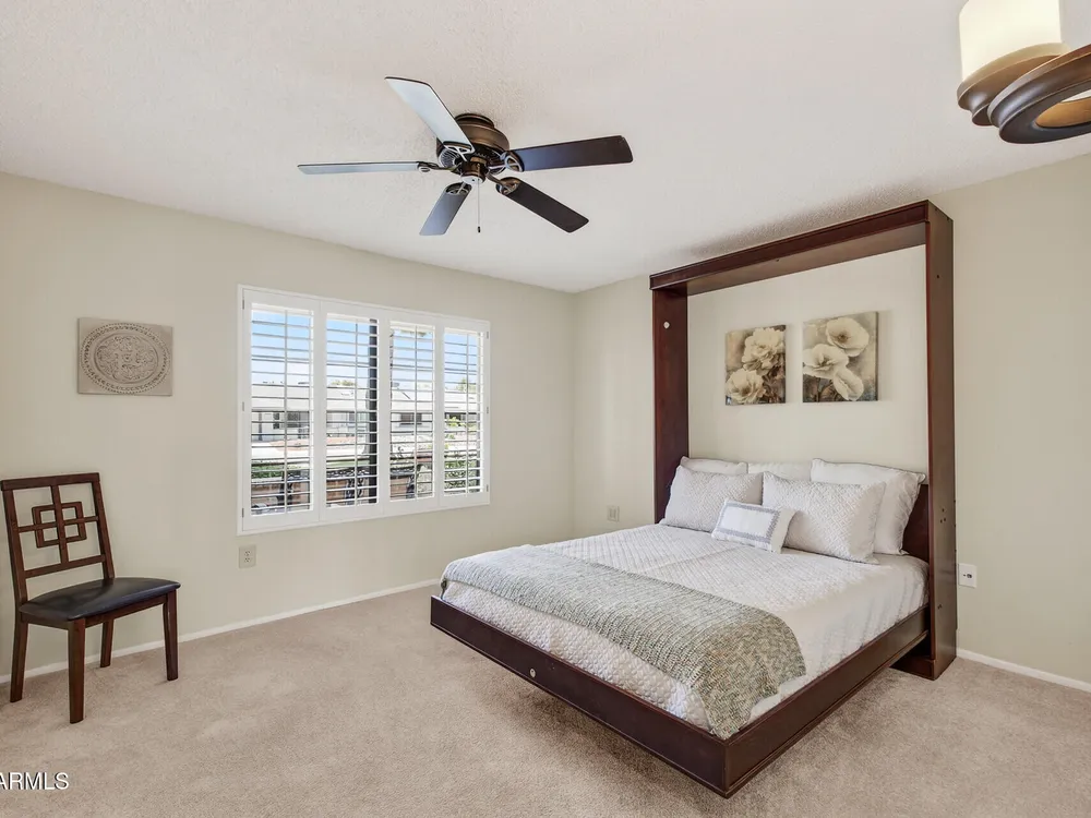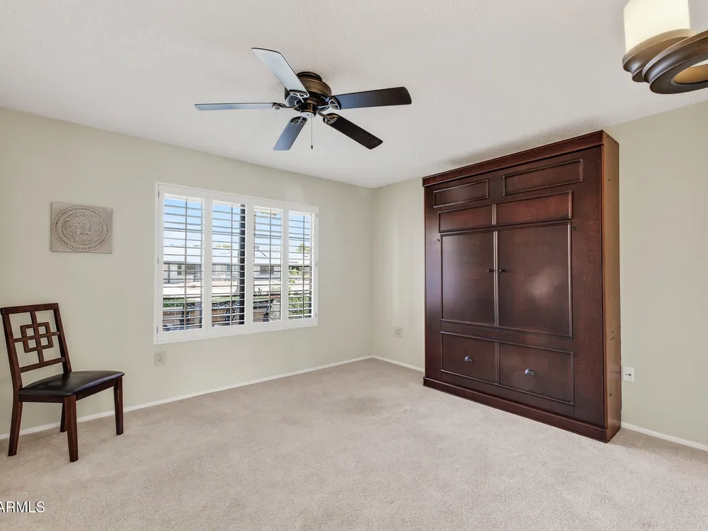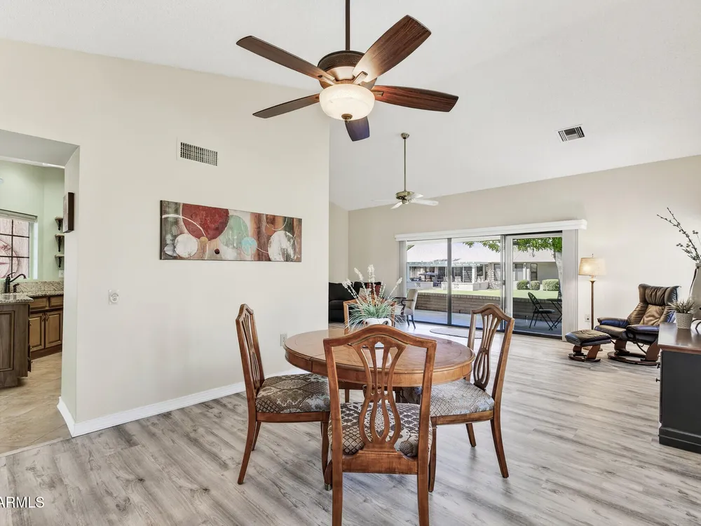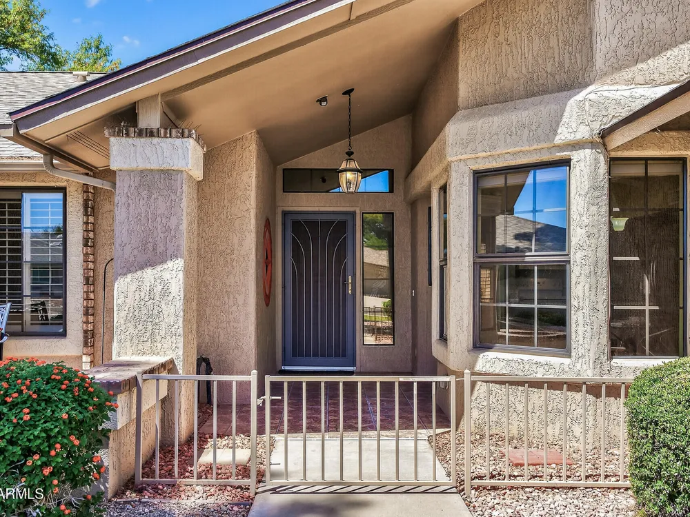 Bright, tasteful, and tidy—this updated 2bed/2bath Pima plan is move-in ready and furnished if desired! With 1,635sq ft of living space, vaulted ceilings, and an open feel, it's perfect for entertaining or relaxing in style. Enjoy your morning coffee on the charming front patio, or unwind on the sunset-facing back patio with lush greenbelt views—fully maintained by the HOA. Inside, you'll find granite counters, plantation shutters, updates to the kitchen and baths, newer lighting and plumbing fixtures, 2022 roof/HVAC, neutral tile/LVP/carpet throughout, fresh interior paint, and a flexible 2nd bedroom with clever Murphy bed/desk combo. The spacious laundry room even doubles as an office or craft area! Pets OK within the HOA guidelines. Come see it today!