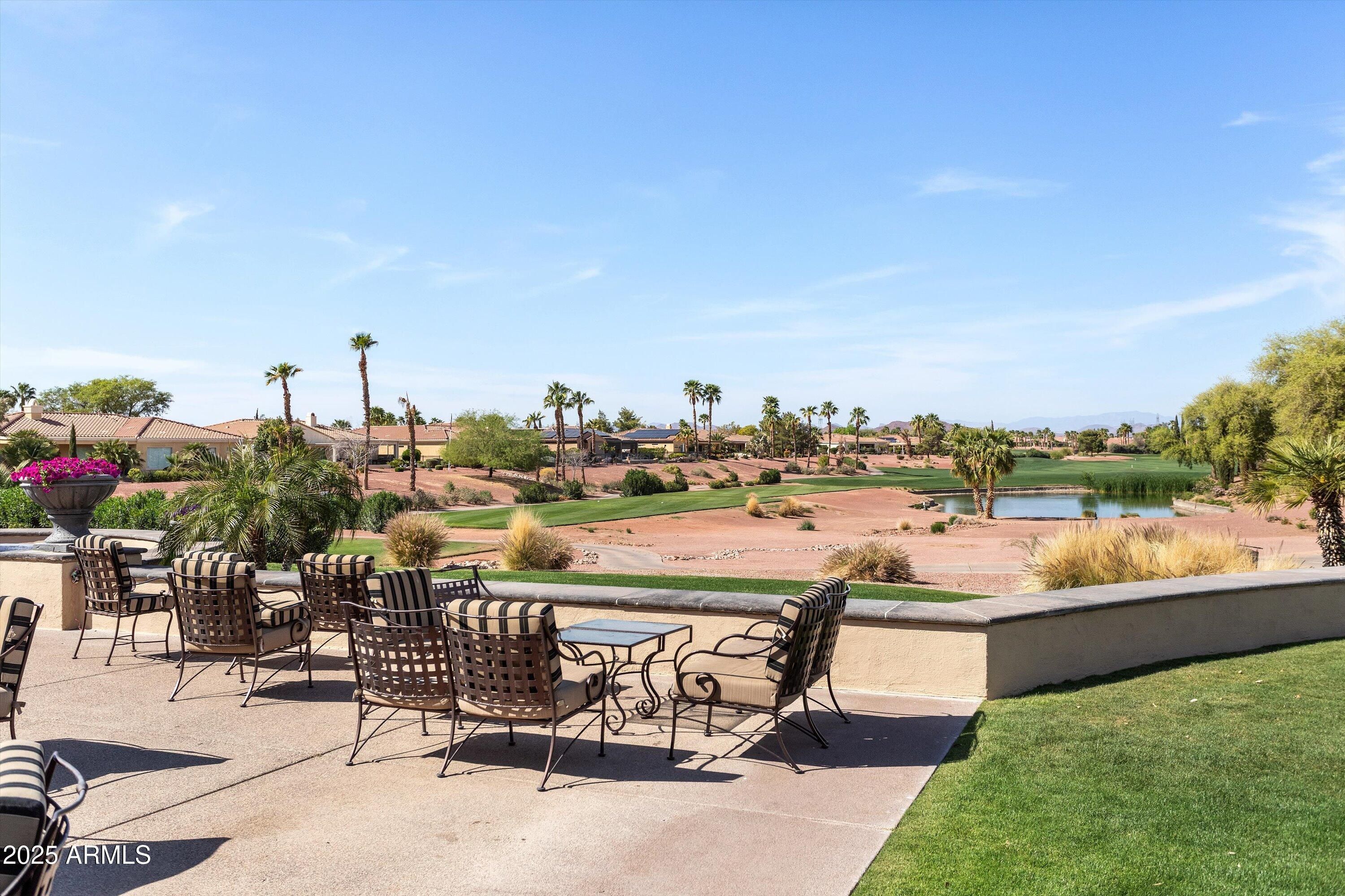 Exquisite San Marco Model on the 7th Fairway. Imagine waking up to breathtaking golf course views from your primary bedroom, hosting friends in your spacious backyard oasis, or unwinding by the cozy fireplace after a day on the links. Exclusive Outdoor Living & Entry shows off a rare oversized, gated courtyard providing unmatched privacy and versatility, perfect for entertaining or relaxing outdoors. Pavers lead from the sidewalk into your private oasis, offering flexible space to suit any occasion. The meticulously landscaped backyard features south-facing views, a large open area, covered patio, sunshades, and elegant pavers setting the scene for unforgettable gatherings and tranquil nights under the stars. Inviting Interior Spaces - Step inside to elegant 18x18 smooth surface tile. The great room is designed to maximize comfort and views, with sightlines to the backyard and gated courtyard, complemented by a gas fireplace that adds warmth and ambiance. Primary Suite boasts panoramic golf course views and an oversized closet, while the bathroom features abundant counter space and cabinetry for ultimate convenience. Both the master suite and guest bedroom are finished with plush carpeting for added comfort. The kitchen shines with white cabinetry, granite counters, center Island and a stylish stone backsplash. The versatile den offers endless possibilities transform it into a guest room for visitors, a private home office, or a creative studio to suit your lifestyle. Garage & Parking Features - The extended 2.5-car garage is a true standout feature, offering generous space for two vehicles, a golf cart, and additional storage ideal for golf enthusiasts who need room for their equipment and more. The laundry room is equipped with cabinets and space for a wine refrigerator. Additional Comforts include a water softener for added comfort throughout the home.