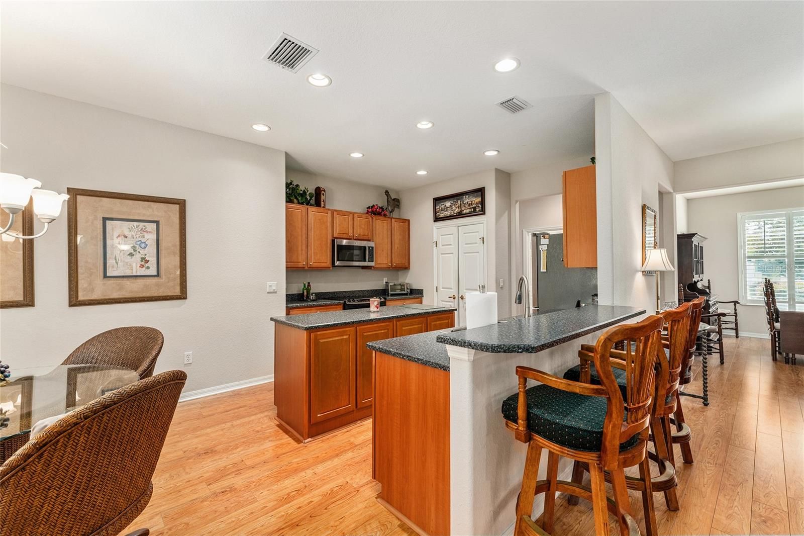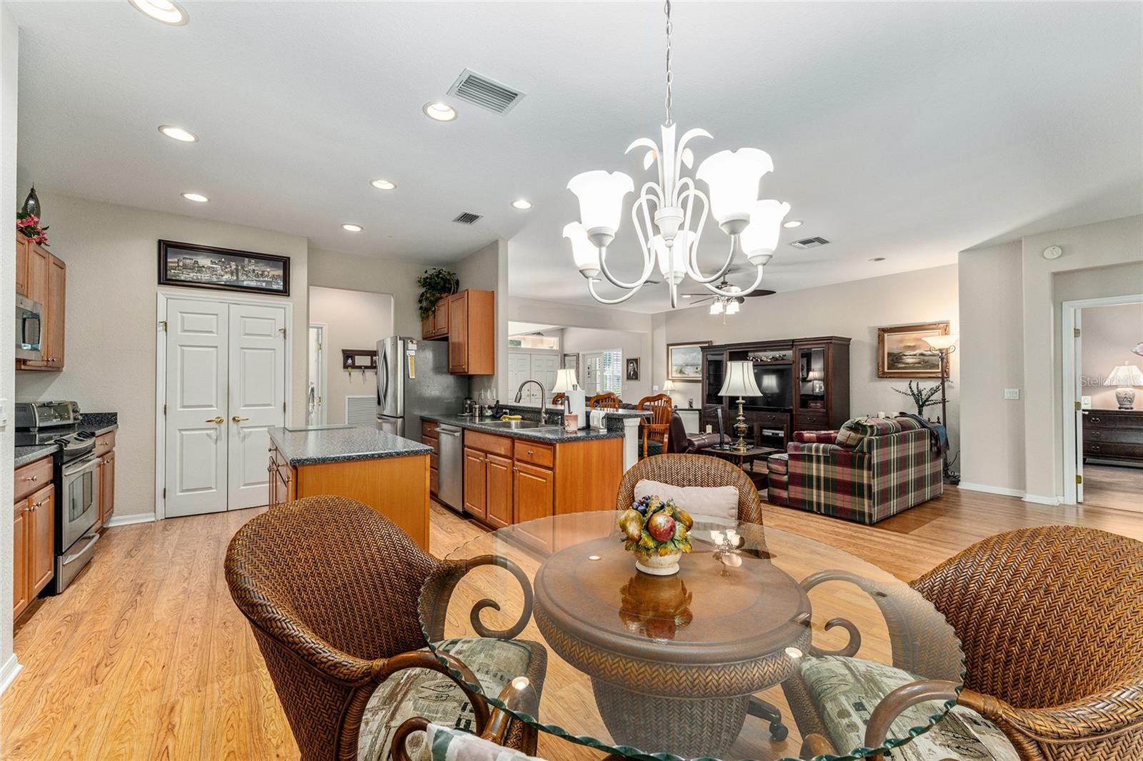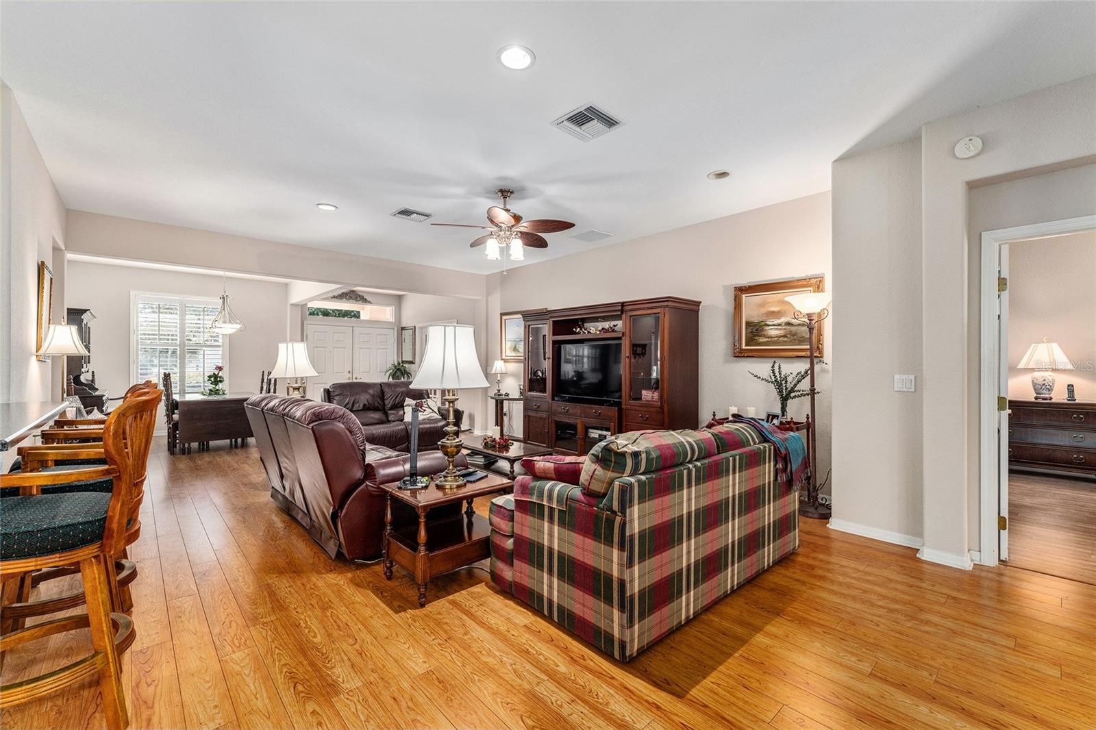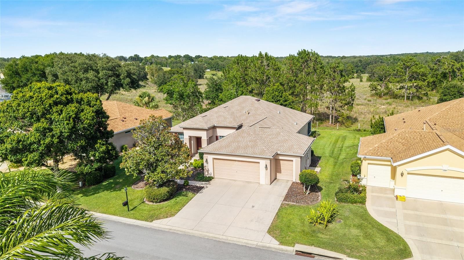 Privacy abounds in this rare and spacious 3-bedroom, 2-bath Johnstown model with a den, perfectly situated behind a preserve that can never be built on, offering ultimate seclusion and serenity. One of only two models ever built with this versatile layout, the home boasts an open floor plan and a beautifully appointed kitchen featuring engineered wood flooring, stainless steel appliances, and Wilsonart beveled-edge counters. The combined living and dining areas showcase plantation shutters and engineered wood flooring—no carpeting anywhere, with tile in the bathrooms and laundry room for easy maintenance. French doors open into the den, which also includes plantation shutters for added privacy. A split-bedroom layout provides comfort for guests, with secondary bedrooms located opposite the private primary suite. The enclosed lanai, under heat and air, allows for year-round relaxation and entertaining. The EXTENDED garage includes a GOLF CART GARAGE, overhead and door insulation, pull-down attic stairs with storage, a service door, and a utility sink. Major updates include a new roof (2023), HVAC (2018), and repiping for peace of mind. Located in a vibrant 55+ community withNO BONDS or CDDs, enjoy resort-style amenities including 36 holes of golf, pickleball, tennis, softball, three pools (including one indoor), a state-of-the-art fitness center, and a seemingly endless list of clubs and activities. Come see this exceptional home today!