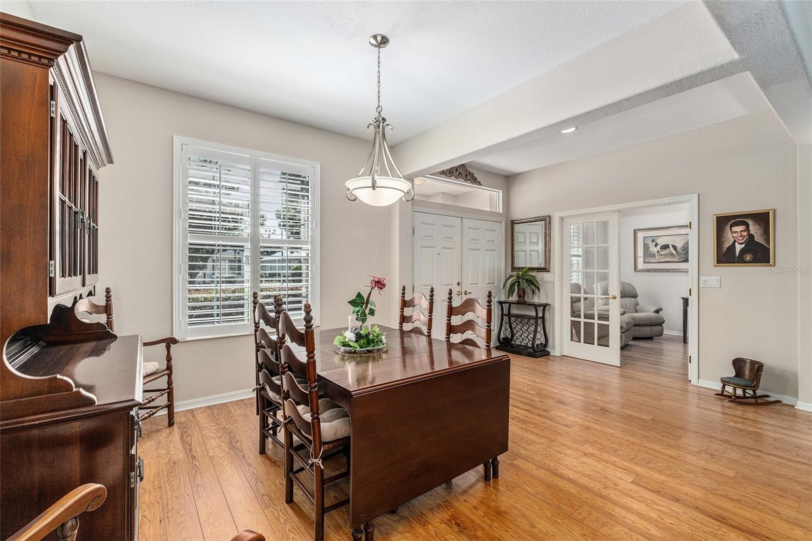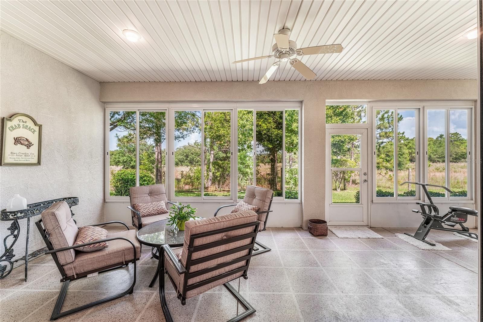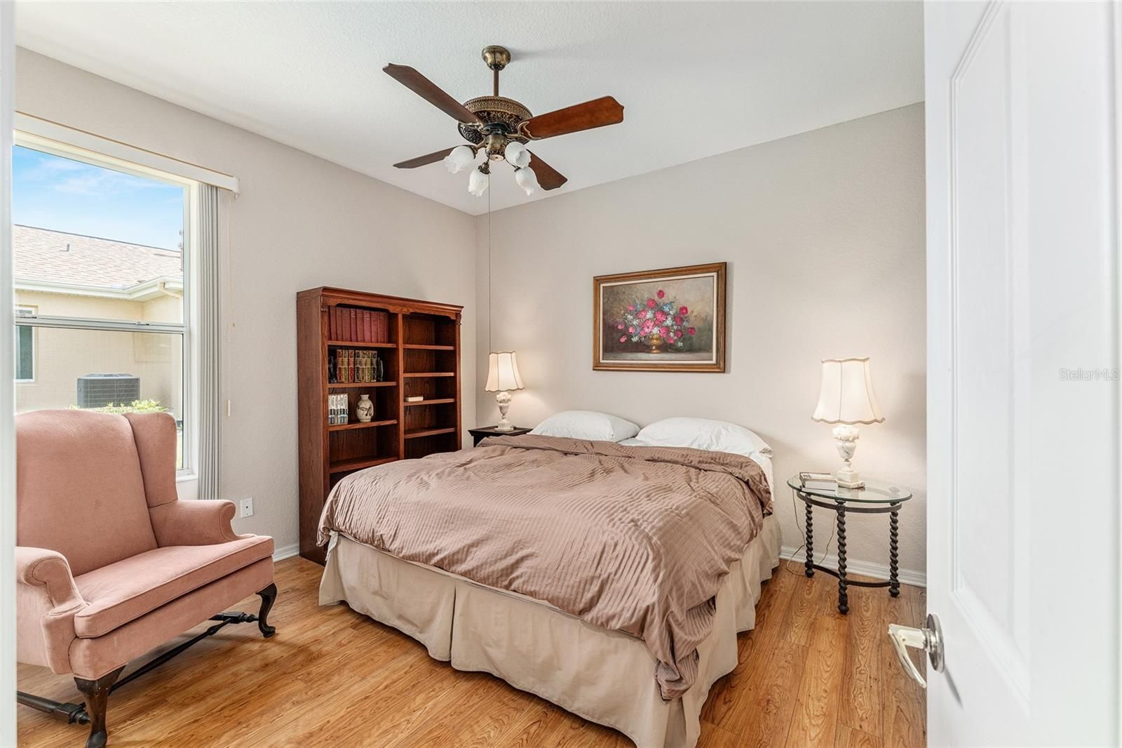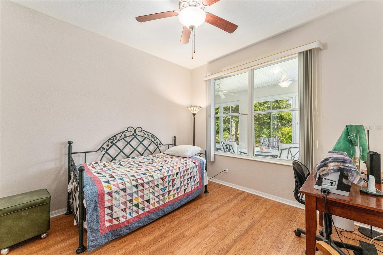 Privacy abounds in this rare and spacious 3-bedroom, 2-bath Johnstown model with a den, perfectly situated behind a preserve that can never be built on, offering ultimate seclusion and serenity. One of only two models ever built with this versatile layout, the home boasts an open floor plan and a beautifully appointed kitchen featuring engineered wood flooring, stainless steel appliances, and Wilsonart beveled-edge counters. The combined living and dining areas showcase plantation shutters and engineered wood flooring—no carpeting anywhere, with tile in the bathrooms and laundry room for easy maintenance. French doors open into the den, which also includes plantation shutters for added privacy. A split-bedroom layout provides comfort for guests, with secondary bedrooms located opposite the private primary suite. The enclosed lanai, under heat and air, allows for year-round relaxation and entertaining. The EXTENDED garage includes a GOLF CART GARAGE, overhead and door insulation, pull-down attic stairs with storage, a service door, and a utility sink. Major updates include a new roof (2023), HVAC (2018), and repiping for peace of mind. Located in a vibrant 55+ community withNO BONDS or CDDs, enjoy resort-style amenities including 36 holes of golf, pickleball, tennis, softball, three pools (including one indoor), a state-of-the-art fitness center, and a seemingly endless list of clubs and activities. Come see this exceptional home today!