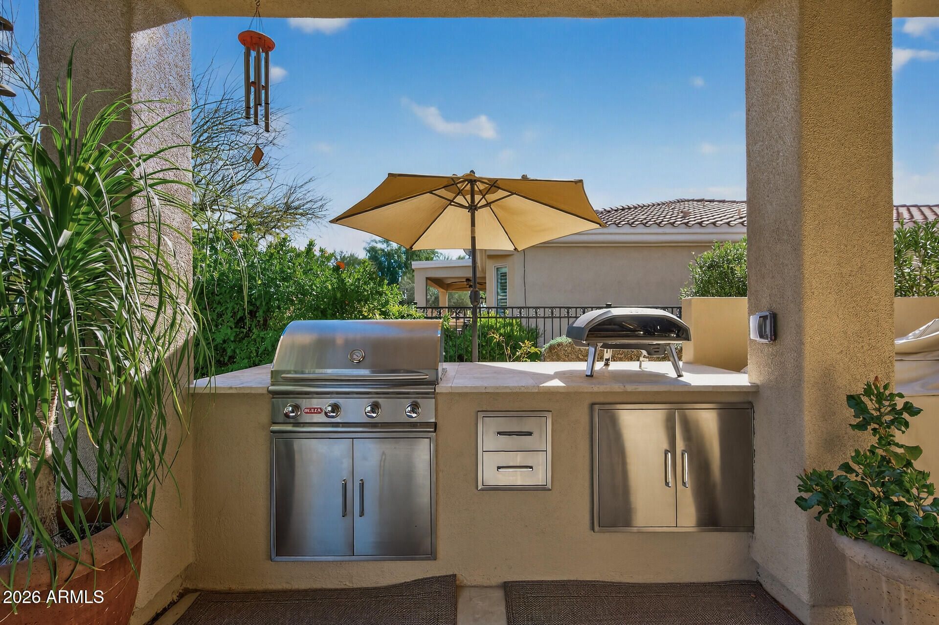 Corte Bella Corner Retreat. Elegant Mirada PLUS Casita floorplan offering 3 bedrooms, 4 bathrooms, including a full private casita, perfectly positioned on a premium corner lot. This 2,840 sq ft residence features a spacious open layout with a wet bar and sit-at counter, ideal for refined entertaining. Recently painted inside and out with tasteful upgrades including French doors, modern lighting, new ceiling fans, plantation shutters, comfort-height toilets, and updated bath flooring. Enjoy a private front courtyard, fenced backyard, and a new extended paver patio with outdoor kitchen. Additional highlights include a new HVAC in the casita and custom garage cabinetry. A perfect blend of comfort, sophistication, and low-maintenance luxury in this serene, gated community.