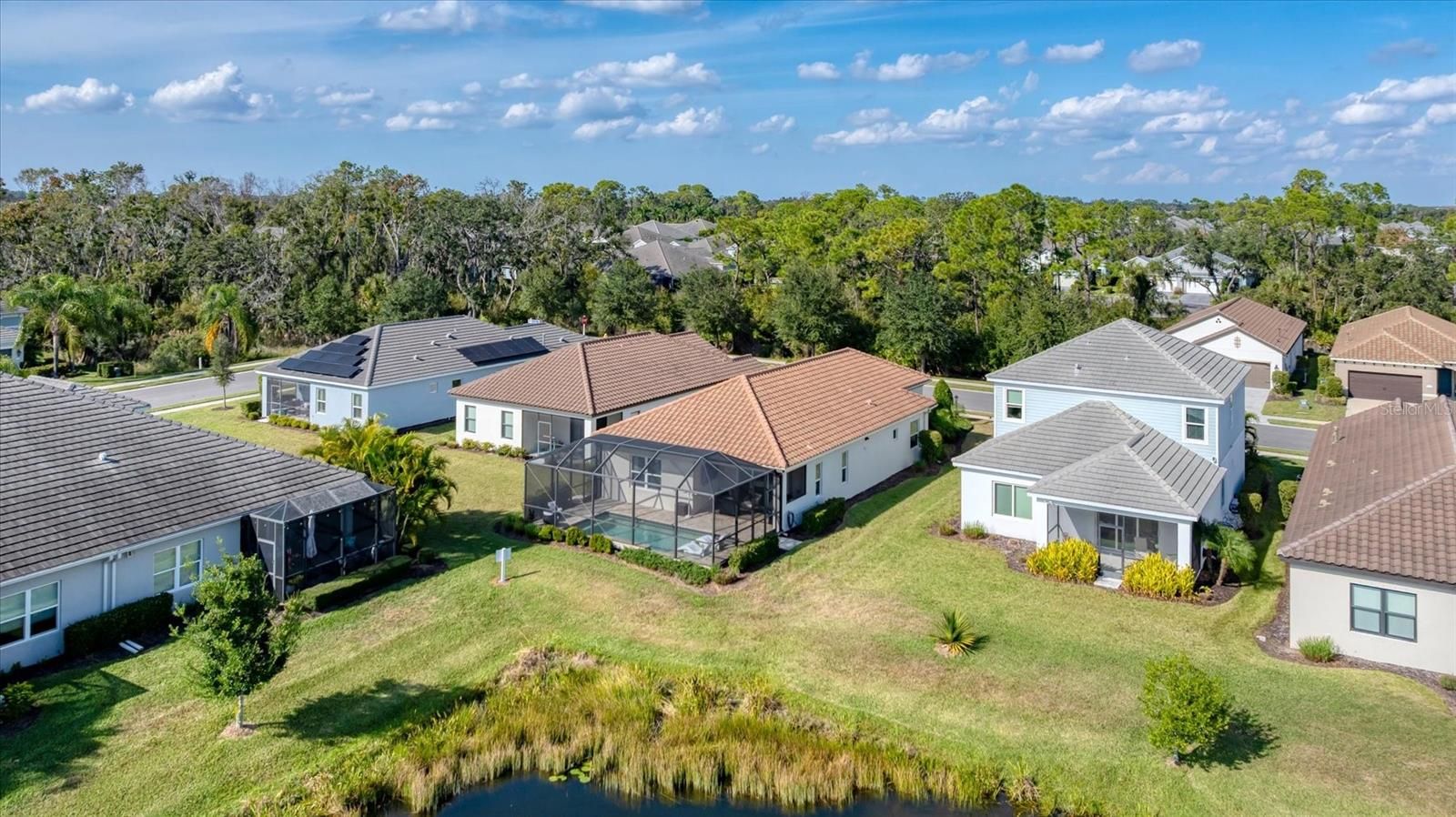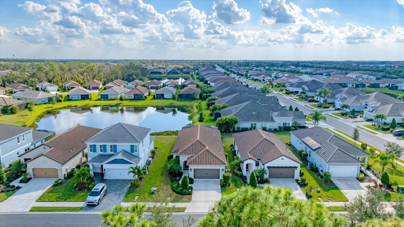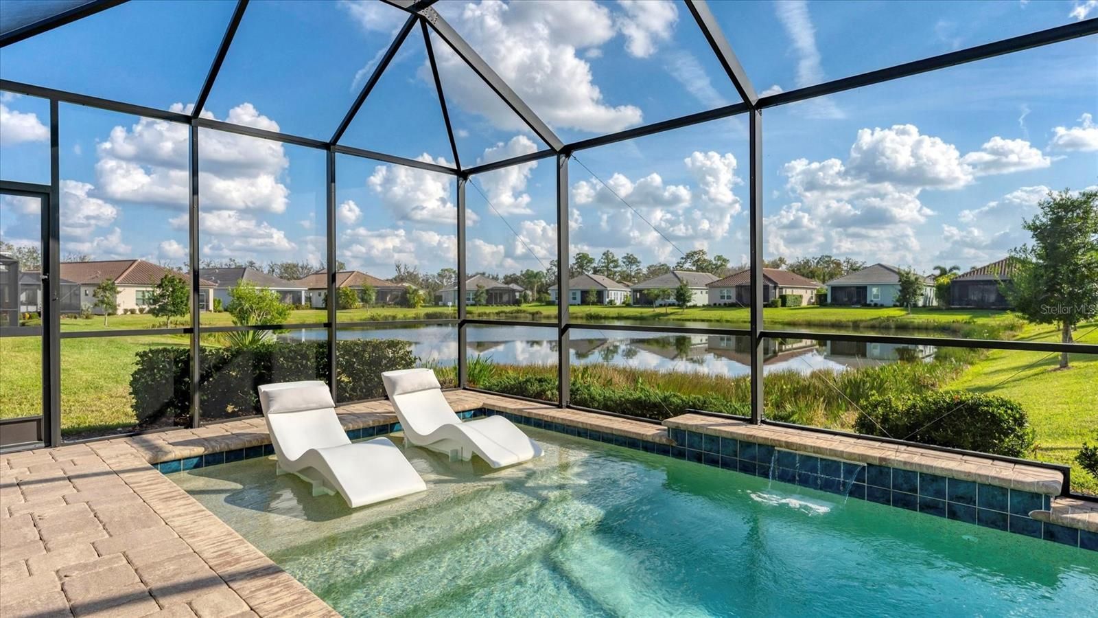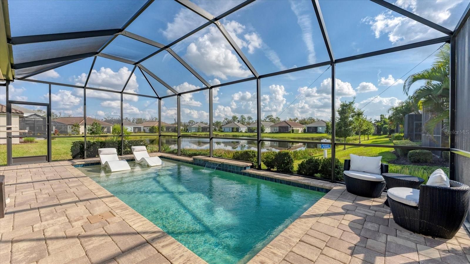 Model perfect living with serene water views in Indigo is now available for the most discerning buyer. Experience the epitome of Florida living in this meticulously maintained, three bedroom, plus a den/office, two bath residence located in the highly sought after gated community of Indigo in Lakewood Ranch, Florida. Spanning just under 1800 square feet of living space, this house features designer finishes and an effortless flow for entertaining. The open concept living area leads directly to your private, resort style, salt water pool oasis with water features. The sparkling in ground pool and paver lanai boasts peaceful lake views conducive for the best experiences of rest and relaxation in the sunny Florida weather! Located in a premier active lifestyle community with a plethora of amenities AND a lifestyle community director, enjoy activities such as pickleball, workout at the fitness center, and socialize at the clubhouse. The gated, all tile roof community of Indigo is also maintenance free which is perfect for active retirees, young professionals and busy families. As you walk across the paver driveway and enter through the front door, you will notice the upgraded tile plank floors throughout most of the home, the decorative wall décor, walk in closets, and the pristine, chef’s kitchen that is open to the great room and perfect for entertaining. The pantry is a walk-in style with wood shelving and the appliances are all stainless-steel GE creations which are punctuated by the lovely range hood. The countertops are a beautiful, neutral quartz and the kitchen also has a gas range for the most serious of culinary experts! The great room features an amazing brick décor with a built-in electric fireplace. Everything about this home speaks to relaxation, peace, serenity, and coziness that is ideal for enjoying with guests, friends and family! For the ultimate peace of mind, this home is offered with impact windows and sliders! This home and community are what true Florida living is all about. Schedule your showing today!