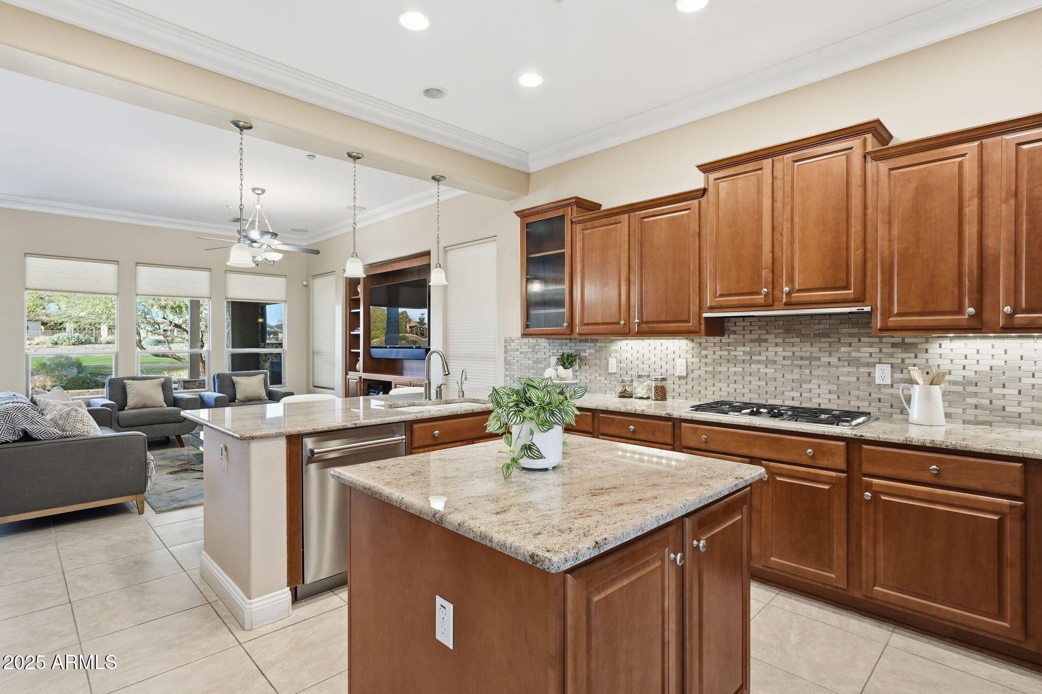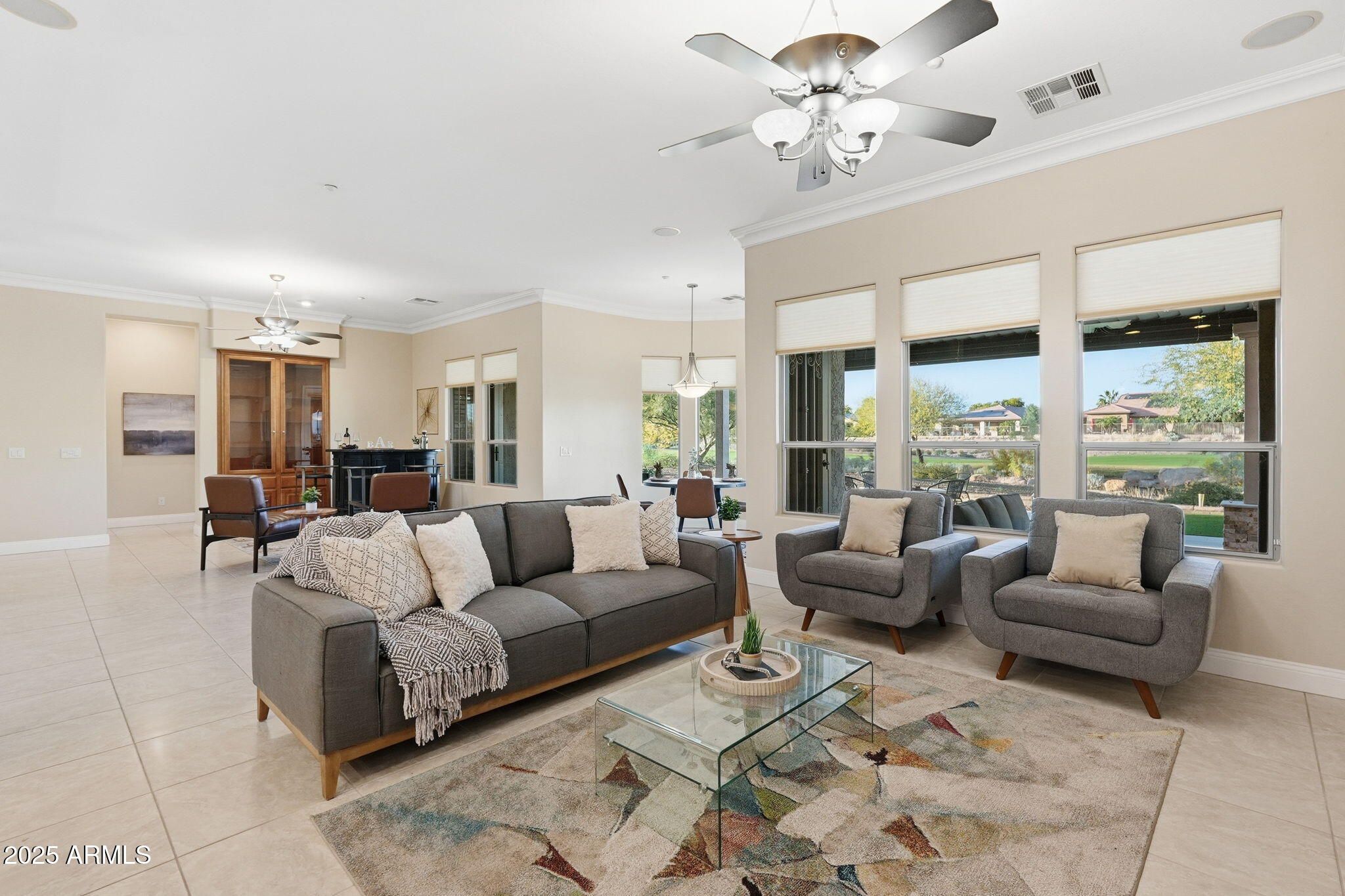Experience elevated resort living in this former model home, ideally positioned on the coveted ''model row'' just steps from the Kiva Club in Trilogy at Vistancia. Designed to impress, this impeccably upgraded residence offers 2 bedrooms, 2.5 baths, a versatile den with a built-in Murphy bed, and a 2.5-car garage—perfect for full time living plus storage for your bikes and golf cart. Step outside to a true entertainer's dream: an extended covered patio adorned with travertine pavers, a striking fireplace wall, fire pit, and built-in BBQ. From here, enjoy breathtaking golf, lake, and mountain views, as the home sits gracefully along the water on the short Par 3 second hole—an exceptional and rarely available setting! The heart of the home showcases a beautifully updated kitchen...... with newer finishes, seamlessly flowing into refined living spaces highlighted by updated flooring throughout. Recent updates include prepaid solar in 2013, new HVAC in 2017, New roof with 2 layers of TU43 underlayment in 2019, new flooring throughout in 2019, new wainscoting, crown molding, and granite countertops in 2019, new exterior paint in 2023, and new water heater and water softener in 2024. All irrigation has been changed to PVC, providing peace of mind and modern efficiency. Thoughtfully designed and impeccably maintained, this luxury residence blends comfort, elegance, and the unmatched lifestyle Trilogy at Vistancia is known for. Homes with this location, pedigree, and level of upgrade are seldom availablethis is resort living at its finest.