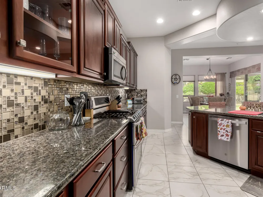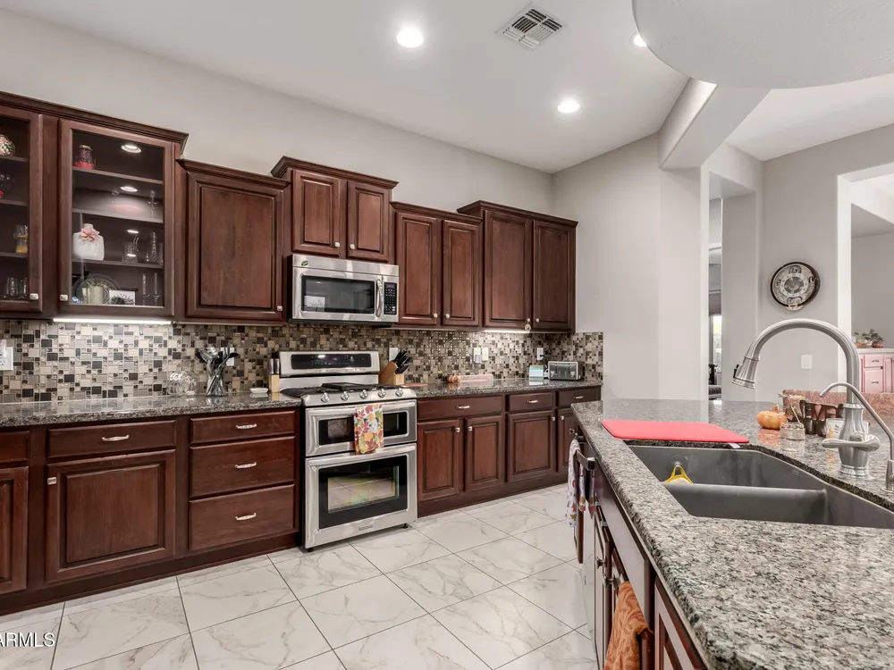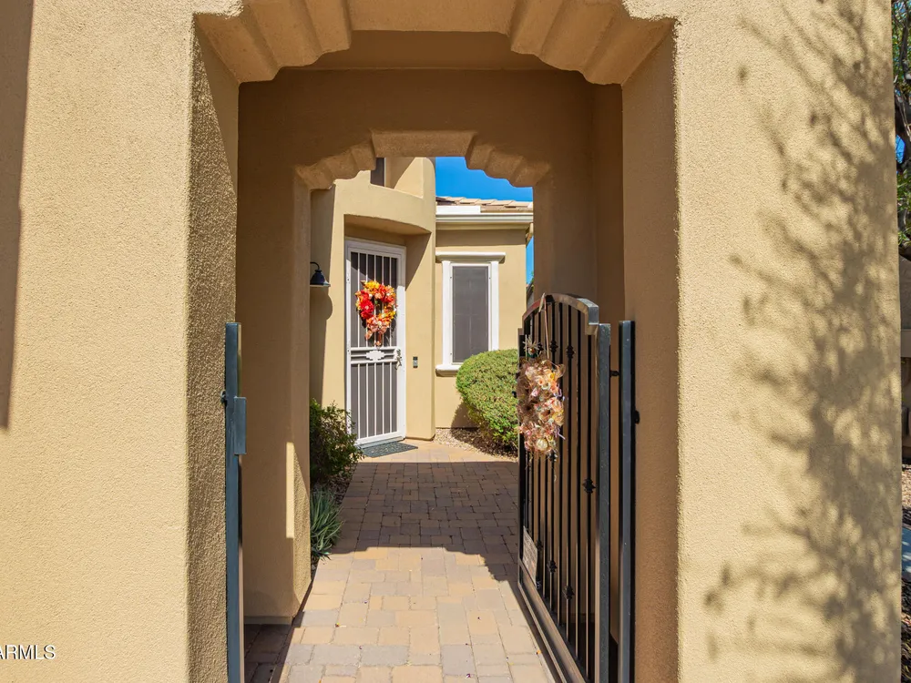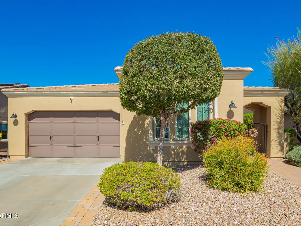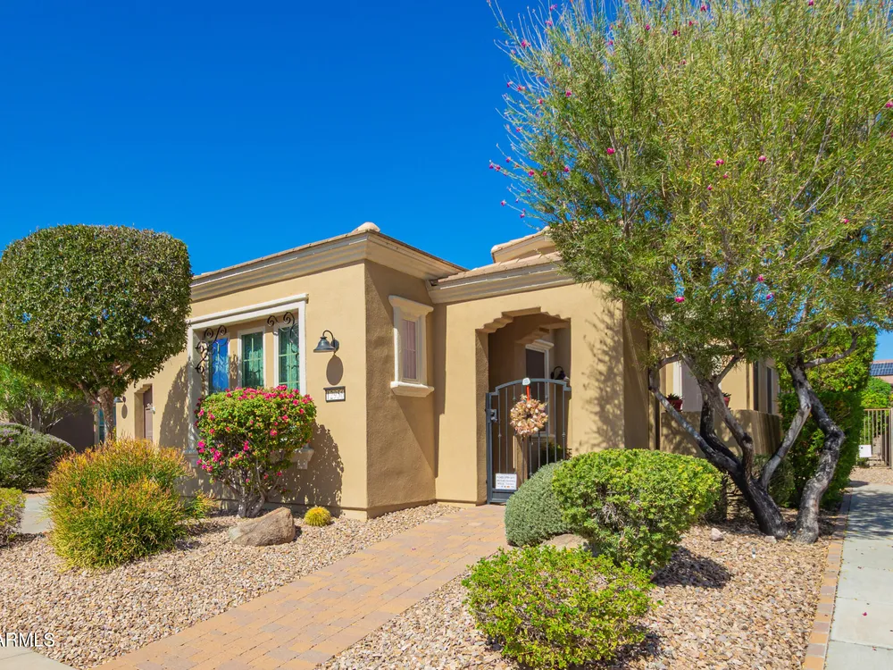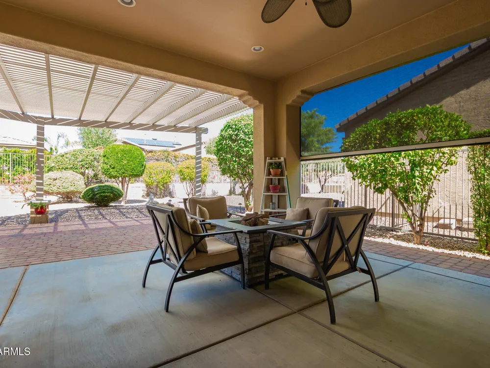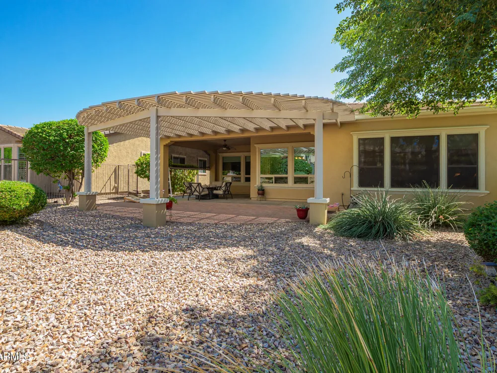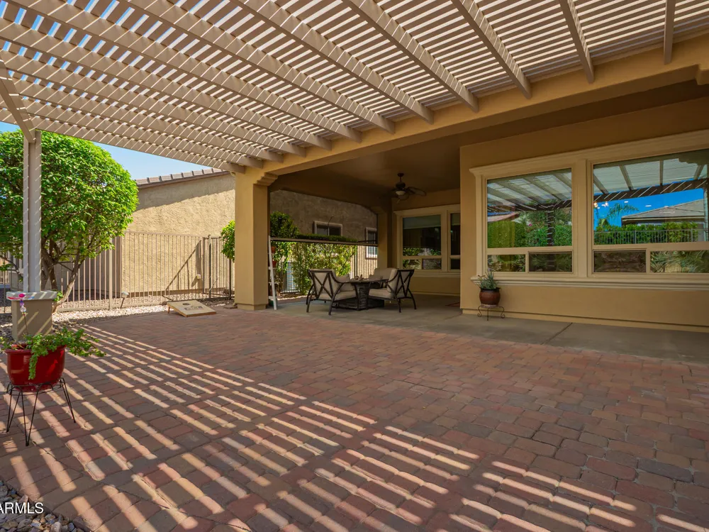 Rarely available, the sought-after Genova plan shines with thoughtful design, top-tier finishes, and modern efficiency. From the moment you step inside, you'll notice the gorgeous oversized tile flooring flowing through all the right spaces and the abundance of natural light highlighting every detail. At the heart of the home is a gourmet kitchen built to impress, featuring stainless steel gas appliances, a double oven, granite slab countertops, custom tile backsplash, and raised panel cabinetry with staggered design and elegant crown molding. The open layout connects seamlessly to the dining and living areas—perfect for entertaining or relaxing in style. The private den with designer double doors offers flexible space for work or hobbies, while the owner's suite feels like a private spa with custom tilework, a soaking tub, and a separate shower. Guests will love their full suite, offering comfort and privacy for extended stays. Step outside to your fully fenced backyard oasis, complete with an extended paver patio, pergola, mechanical sunshade, and a walkway leading to the front yardideal for enjoying Arizona's beautiful weather. Every detail has been considered: energy-efficient solar, smart space with abundant storage, soft water and RO system, laundry room sink, ceiling fans, and extra recessed lighting throughout. Even the golf cart garage adds a touch of luxury and convenience. Just a short stroll to the Mita Club, this home combines style, function, and location in one stunning package. Don't miss this rare Genova gemit's the perfect blend of sophistication and smart living!