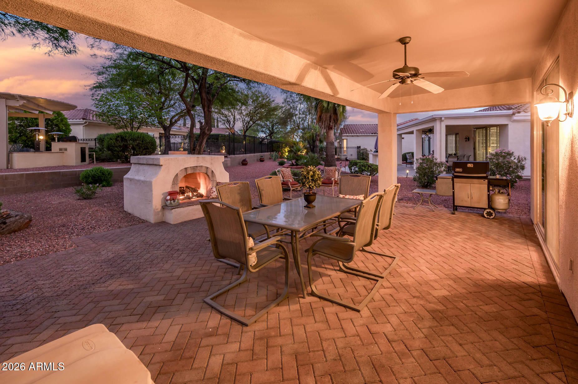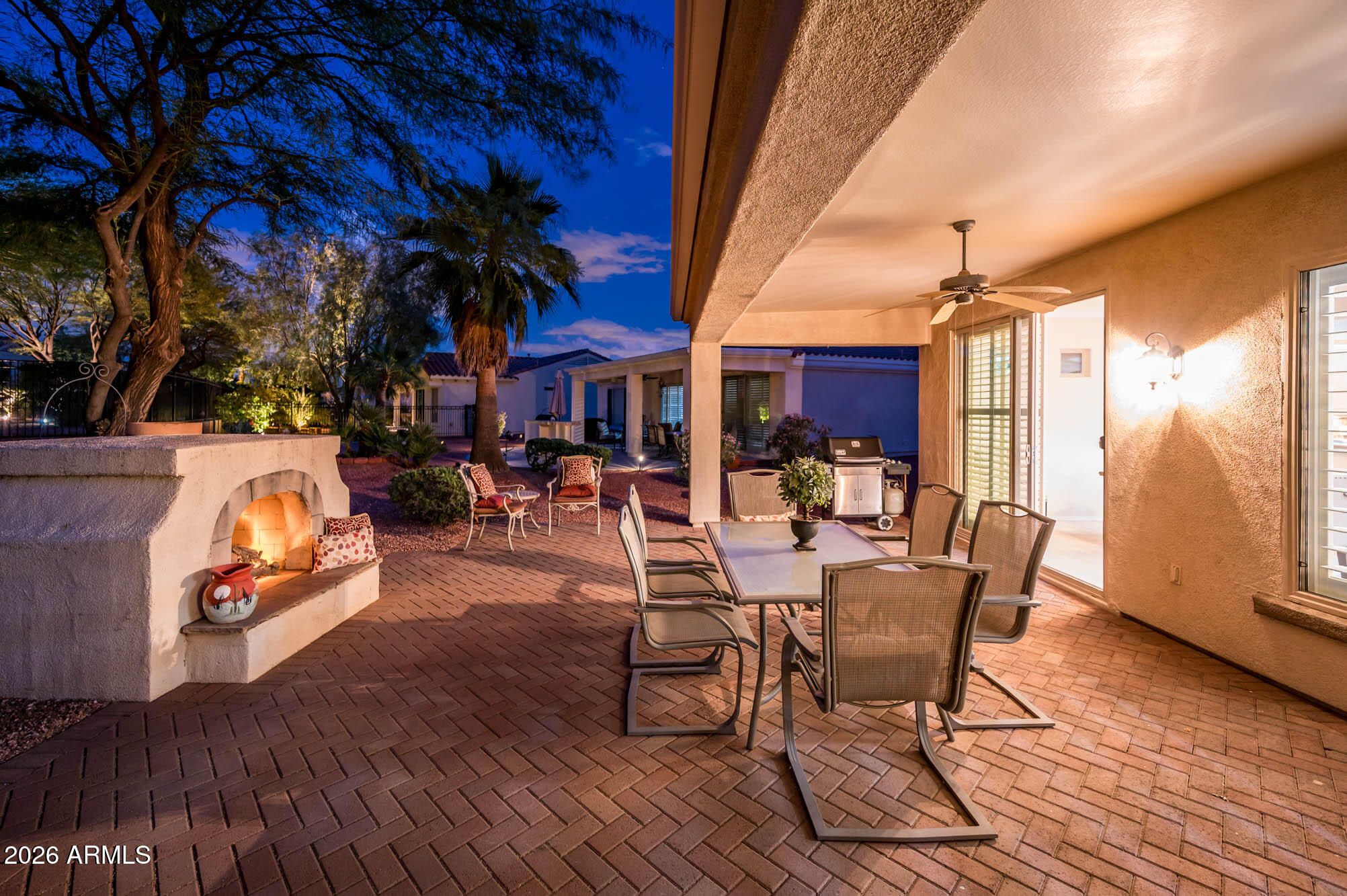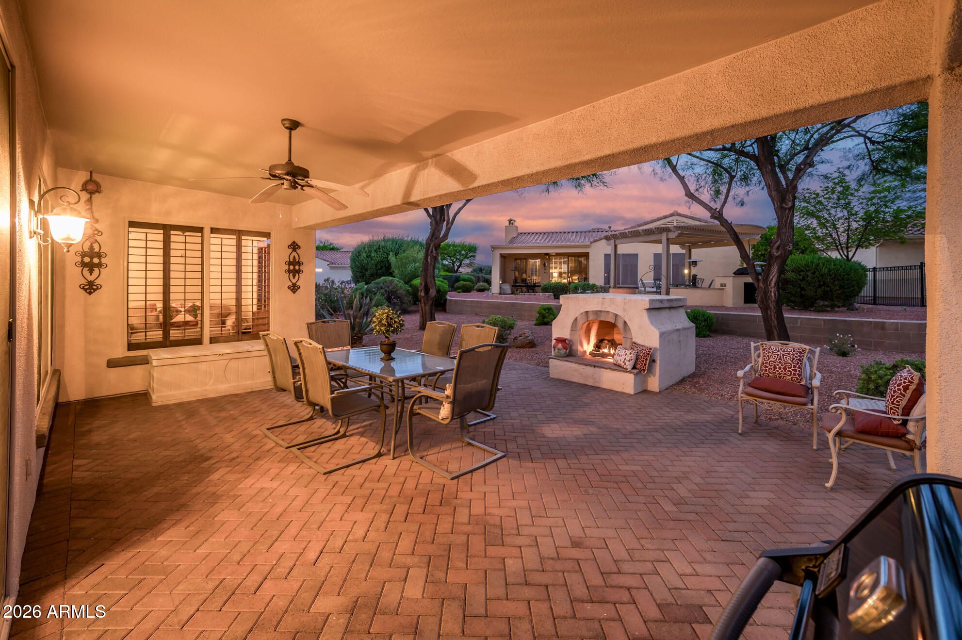 Situated in a premier location within gated Corte Bella--well away from the 303 and El Mirage--this beautifully updated San Ysidro Model delivers the upgrades buyers want and the condition they hope for. Major improvements include 2026 Roof Check, Tankless Hot Water Heater, and a 2022 Irrigation System. Fresh interior paint and solid-surface flooring run throughout, complementing the 2019 remodeled Primary Bathroom and 2019 updated Guest Bathroom. The kitchen features warm maple cabinetry with under-mount lighting, a charming nook, and a generous pantry. The extended Primary Suite offers a bay window and excellent space, while the Guest Bedroom is equally comfortable in size. The extended garage includes epoxy flooring for a clean, finished look. Out back, a paver patio with gas fireplace creates a welcoming outdoor living area perfect for relaxing or entertaining. With its prime location, thoughtful upgrades, and meticulous condition, this is a Corte Bella opportunity you won't want to miss. Corte Bella delivers resort-style living with its semi-private golf club, two restaurants with bars, extensive social activities, heated pool, cutting-edge fitness center, and highly sought-after pickleball courts. With shopping, medical services, and banks just a golf-cart ride away, this prestigious community continues to shine as the West Valley's true gem.