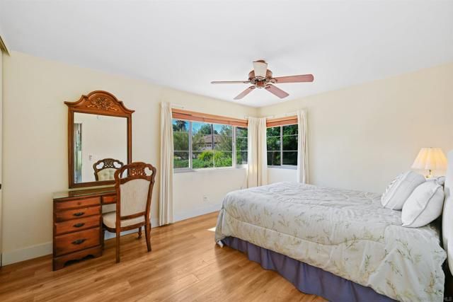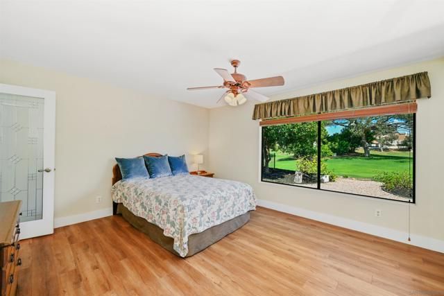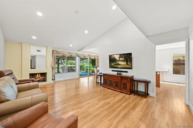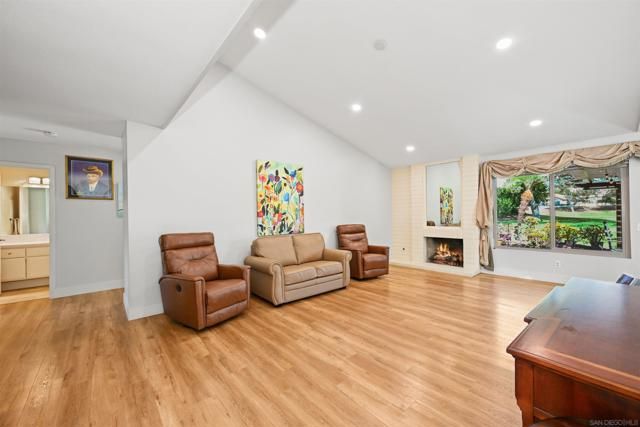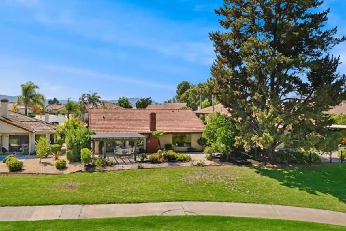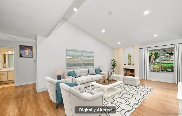 Premium location situated directly on the beautiful Oaks North Golf Course, this single-story home offers panoramic golf course views on a quiet cul-de-sac in the highly desirable 55+ Oaks North neighborhood. Enter and gaze upon soaring high vaulted ceilings, open floor plan with lots of light creates an inviting atmosphere. Recent renovations include a gorgeous open kitchen with quartz countertops, stainless steel Thermador appliances, garden window, bar seating, nook and formal dining areas. A spacious living room with a fireplace is ideal for relaxing or entertaining. Upgrades also include luxury vinyl plank flooring, recessed lighting, HVAC system, water heater and quartz countertops in the primary bathroom, secondary bathroom and hallway cabinet, the primary bathroom also showcases a walk-in shower with stone-look tile and pebble accents. Meander outside to a generous patio with a new aluminum pergola—perfect for relaxing, dining, or entertaining while taking in the serene golf course scenery. The easy care yard has a bounty of fruit trees including Valencia orange, grapefruit and lemon. Additional highlights include an indoor laundry (washer/dryer included) and attached 2-car garage. Residents of Oaks North enjoy access to the Oaks North Community Center offering multiple social and recreation activities including a community pool, tennis courts, pickleball, lawn bowling, exercise room, billiards, library etc. With close proximity to the Rancho Bernardo Inn, Bernardo Winery, golf courses, shopping, and dining, this home truly has it all!