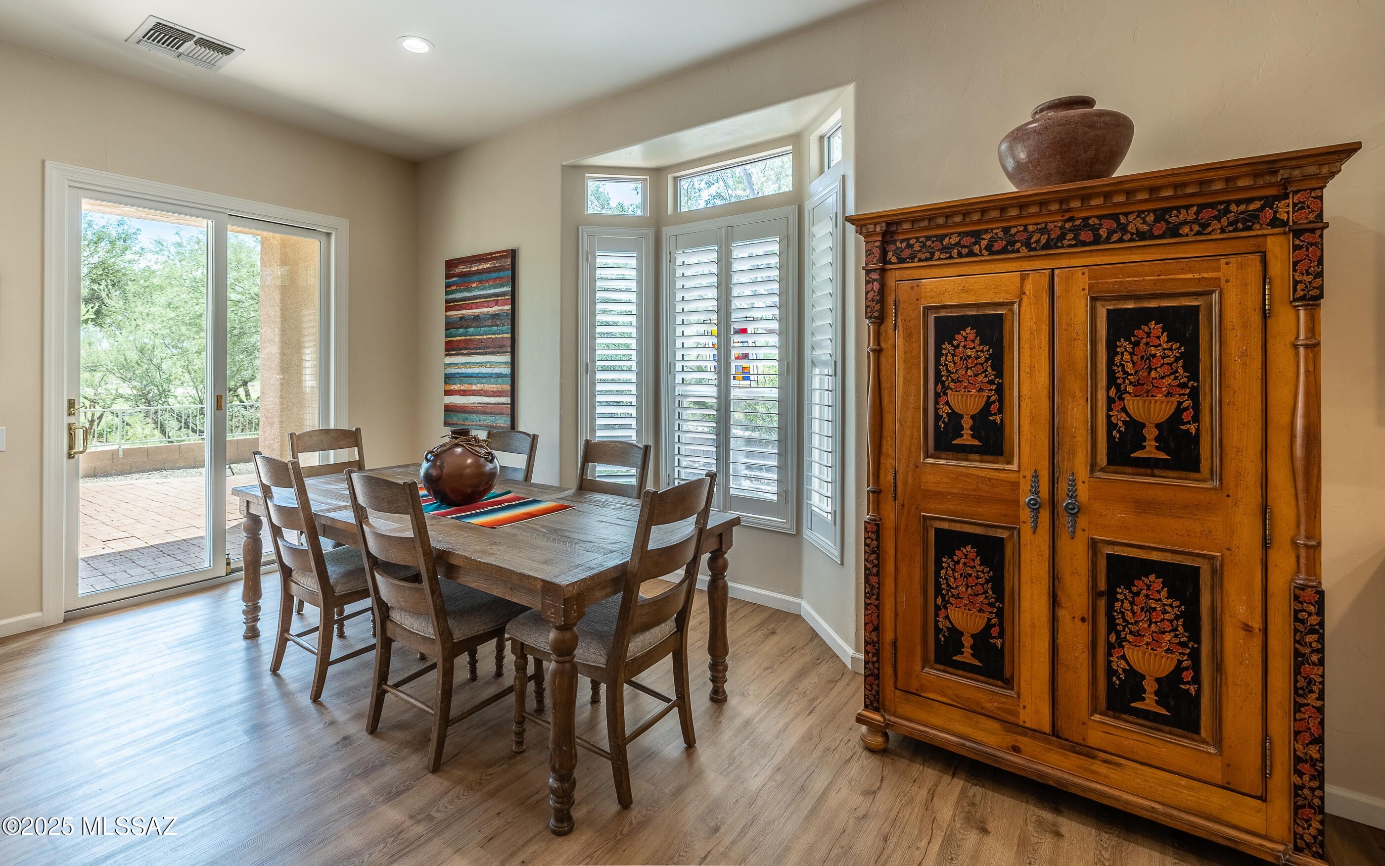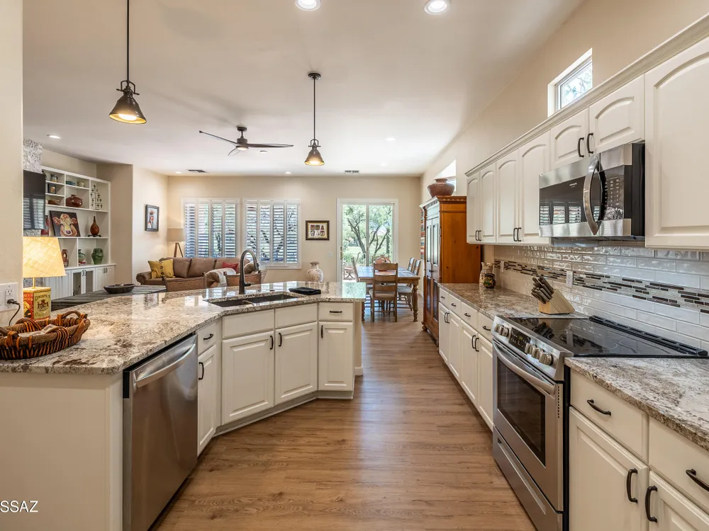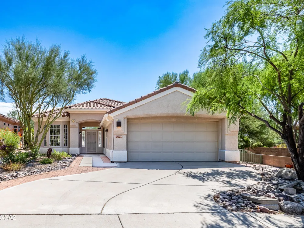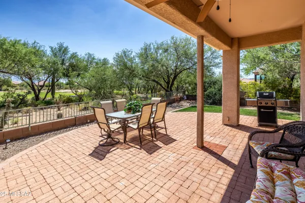This dually extended Hillsboro model has so much to talk about- such as east facing golf course, Catalina & Tortolita mountain & nature views, gorgeous kitchen remodel w/lowered island/bar, beautiful great room 'entertainment' wall, both bathrooms remodeled, extended laundry room w/abundant storage, expanded den/office - basically double the size of a standard Hillsboro den, ALL tile flooring throughout, plantation shutters, Central Vac system. Roof underlayment replaced less than a year ago, water heater replaced Jan '23, AC system approx 10 yrs old. Extra brick pavers added to both sides of driveway for extra wide parking. Expansive brick paved rear patio/porch w/dual turf areas, view fencing - all on an extra wide lot. Gorgeous home! Furnishings & golf cart available on separate BOS.