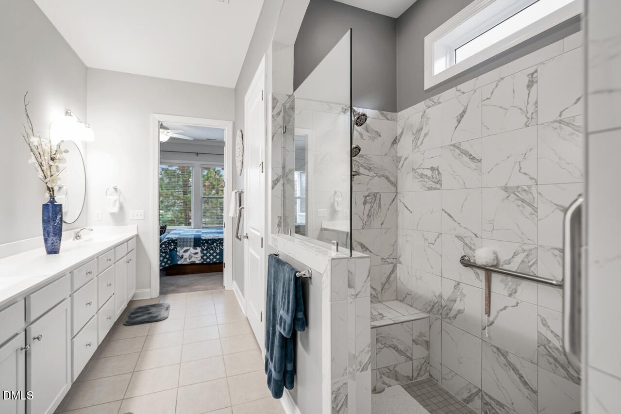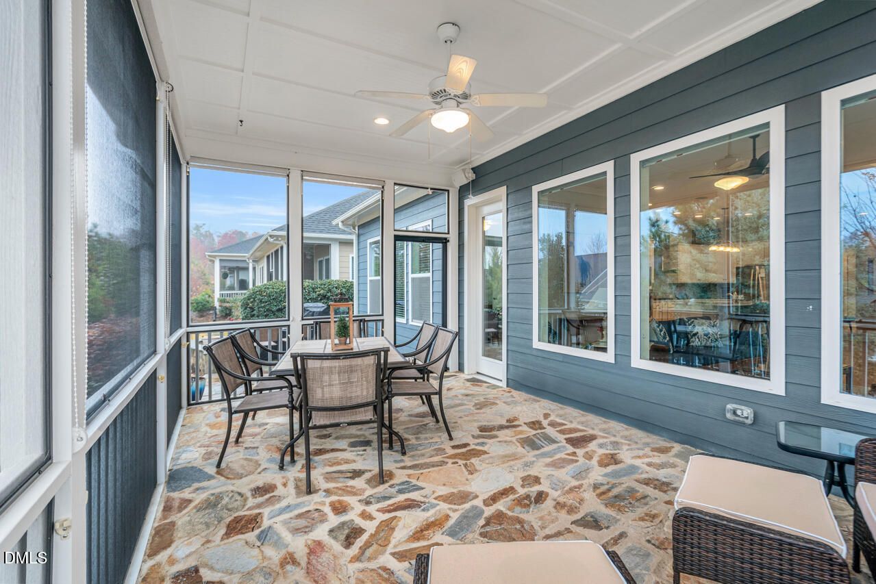 Discover this exceptional David Weekley Homes gem located in the premier 55+ community of Encore at Briar Chapel. The gourmet kitchen impresses with quartz countertops, a gas cooktop with vented hood, a tile backsplash, and a spacious counter-height island perfect for seating and entertaining. The dining room features an elegant tray ceiling, and throughout the home you'll find recessed lighting paired with stylish decorative fixtures. Expansive windows in the living room overlook the beautifully landscaped backyard and screened porch, filling the space with abundant natural light. A versatile flex room with French doors allows you to create privacy when needed or keep the space open to the flow of daily activities. The upgraded guest bath includes a tile surround at the tub, while the generous primary suite showcases large windows and the signature David Weekley curbless walk-in shower with a bench. The extended vanity provides ample space and comfort, and the primary closet is outfitted with a full organization system including drawers and multiple hanging options. Thoughtfully designed, the laundry room offers plentiful cabinetry, folding space, and a convenient utility sink. The garage features a full wall of upper and lower cabinets, ideal for storage or a workshop, and provides access to a fully finished, heated and cooled room with wide dedicated stairs—perfect for climate-controlled storage or a flexible extension of your living space. This energy-efficient home includes a tankless water heater and showcases stone accents on both the front porch and screened porch, as well as a stone patio with a perimeter wall for outdoor enjoyment. Set on a desirable corner lot and just a short walk from the community activities center, this home truly offers everything you've been looking for.
