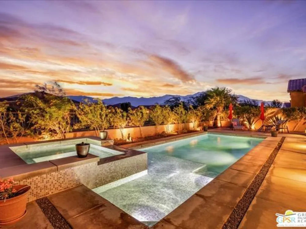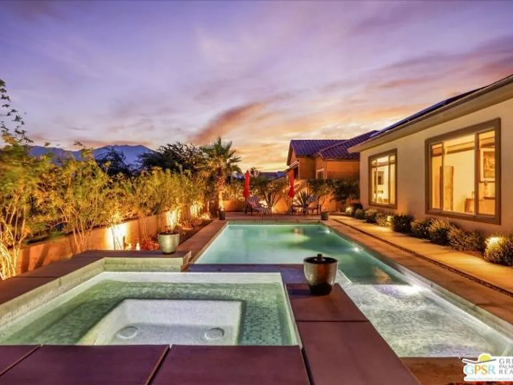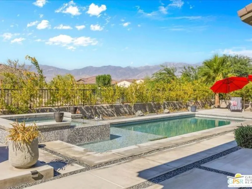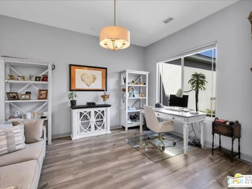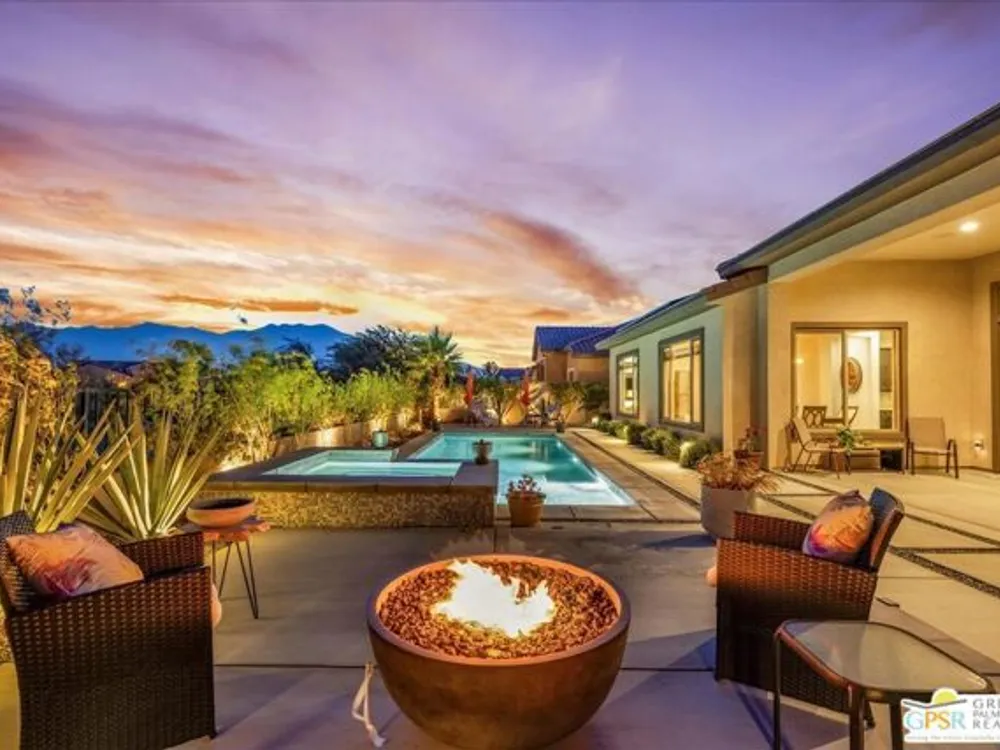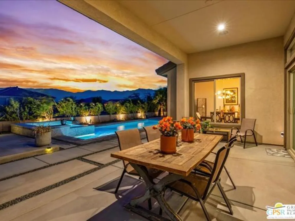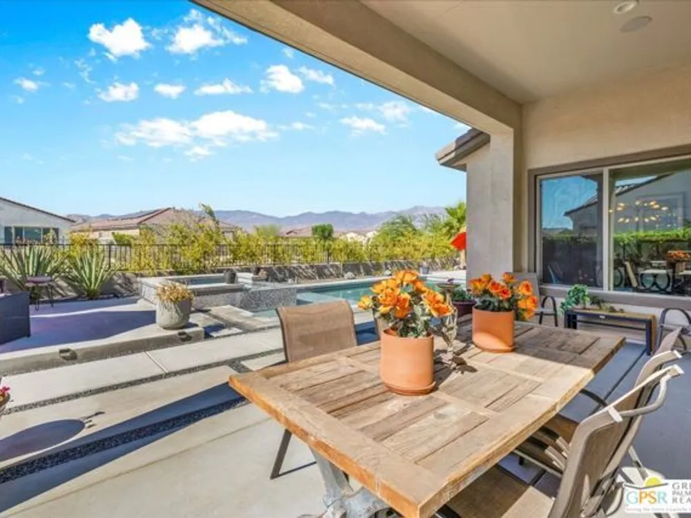 MOUNTAIN VIEWS! Welcome to your private desert retreat in the highly sought-after 55+ community of Del Webb Rancho Mirage. This Phase 4, Plan 8 SERENITY floorplan with Prairie facade features the coveted three-bedroom layout plus a versatile den/flex space and two full bathrooms. Thoughtfully upgraded, the home showcases luxury vinyl plank flooring, custom shutters, and designer light fixtures throughout. The gourmet kitchen impresses with 42" upper cabinets with crown molding and staggered heights, premium cabinetry with dovetail joinery and soft-close drawers, natural granite countertops, a spacious island with seating, and a large walk-in pantry - all overlooking the open-concept great room and dining areas. The light-filled great room boasts soaring 12-foot ceilings, an upgraded in-floor power outlet, and expansive views through to the covered patio and private custom saltwater PebbleTec pool and spa - complete with fire pit, abundant hardscape, and breathtaking mountain vistas. The primary suite is a true sanctuary with stunning mountain views and the rare full-bathroom upgrade, including a large walk-in shower, soaking tub, dual vanities, and a generous walk-in closet. Guests will appreciate their own private wing with two bedrooms and an upgraded full bath, while the den/flex space offers endless possibilities for a home office, yoga room, or media lounge. Additional features include leased SOLAR ($120.05 Mo), an expanded laundry room with utility sink, a beautifully sealed garage floor, soft water plumbing loop, Culligan water softening system, EV pre-wire, and more. As a resident of Del Webb Rancho Mirage, you'll enjoy access to a world-class clubhouse, resort-style pool and spa, state-of-the-art fitness center, tennis and pickleball courts, and a vibrant calendar of social activities designed to suit every interest. This is more than just a home - it's the ultimate in luxury, lifestyle, and community.