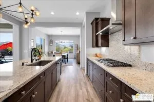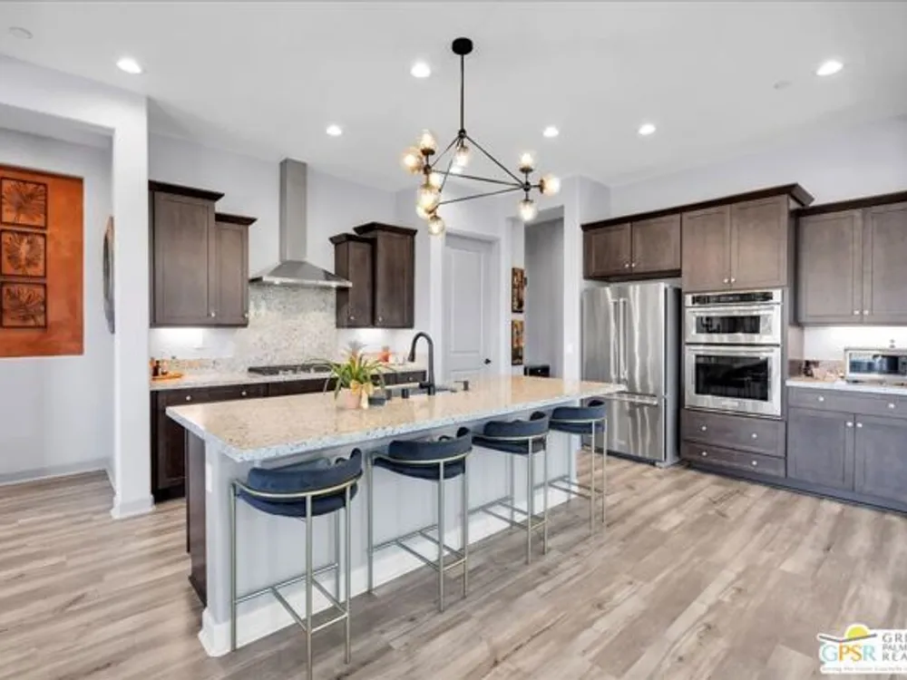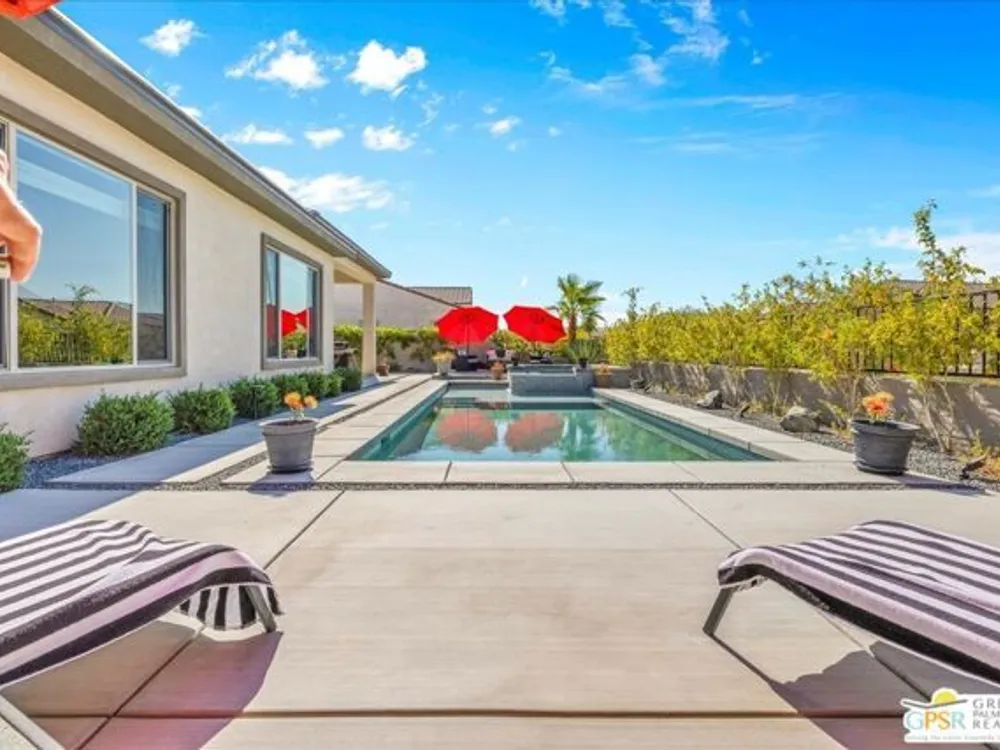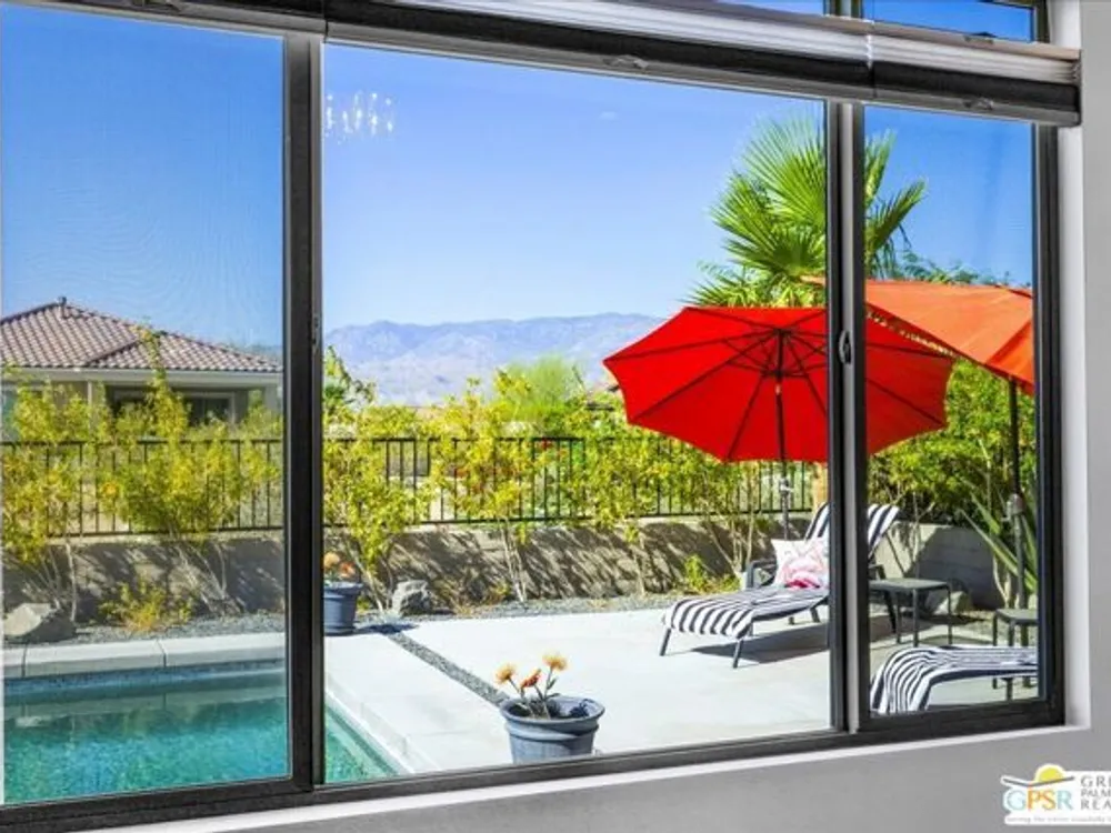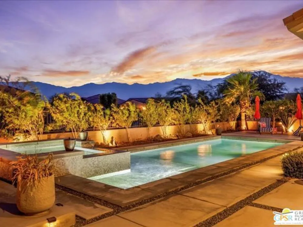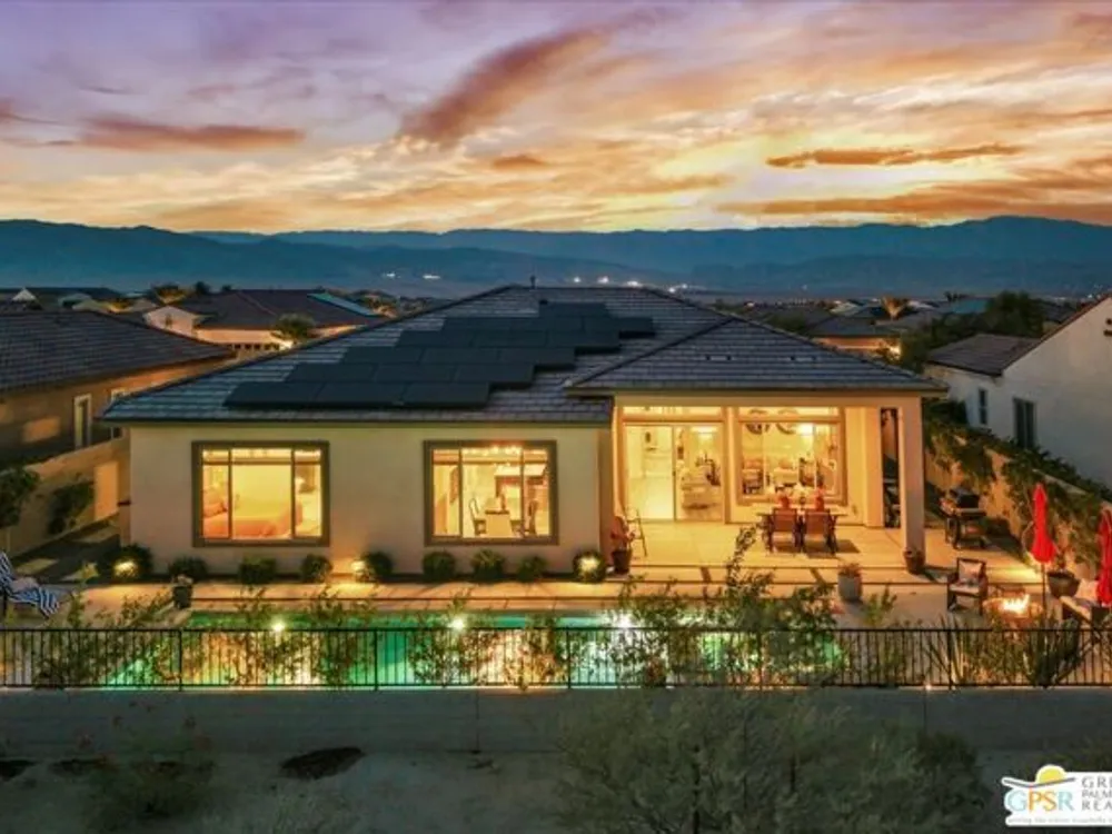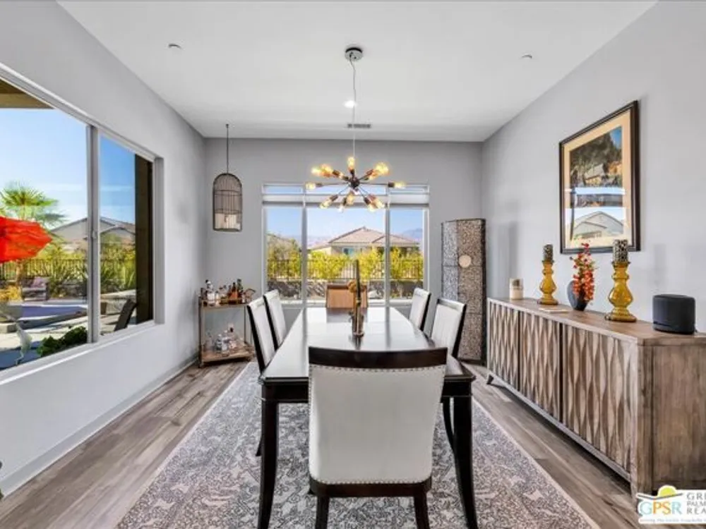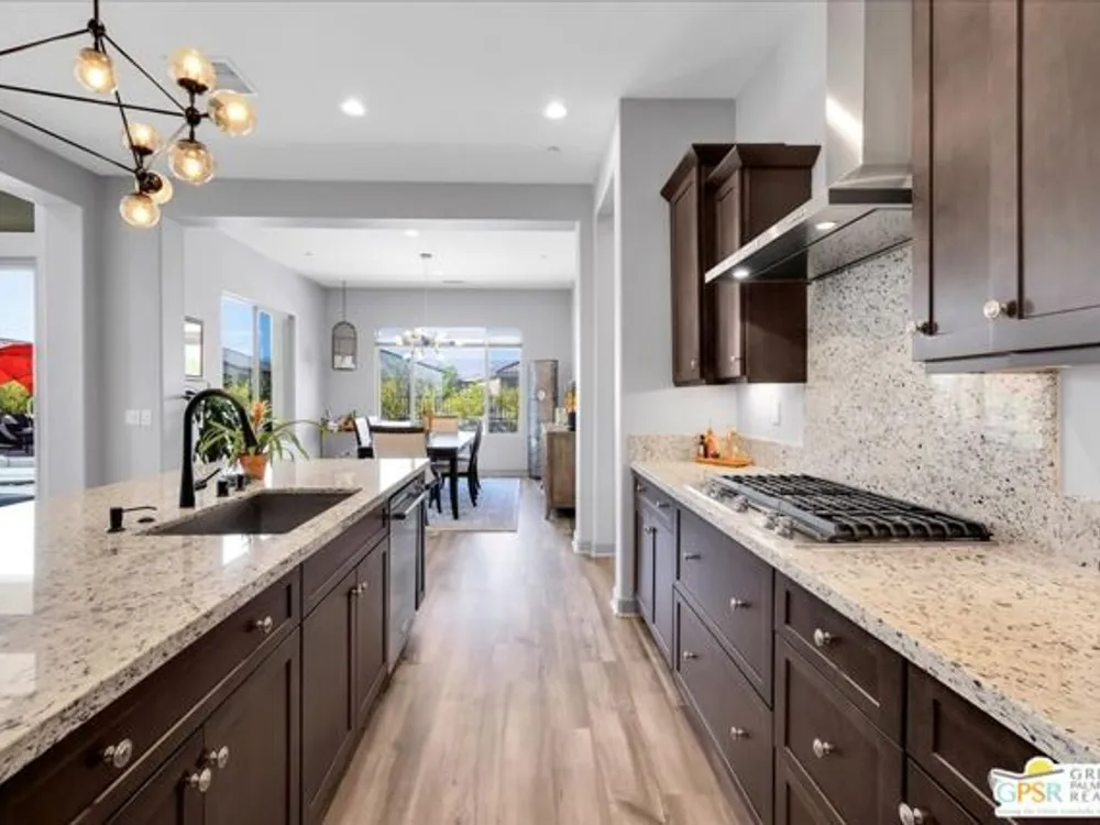 MOUNTAIN VIEWS! Welcome to your private desert retreat in the highly sought-after 55+ community of Del Webb Rancho Mirage. This Phase 4, Plan 8 SERENITY floorplan with Prairie facade features the coveted three-bedroom layout plus a versatile den/flex space and two full bathrooms. Thoughtfully upgraded, the home showcases luxury vinyl plank flooring, custom shutters, and designer light fixtures throughout. The gourmet kitchen impresses with 42" upper cabinets with crown molding and staggered heights, premium cabinetry with dovetail joinery and soft-close drawers, natural granite countertops, a spacious island with seating, and a large walk-in pantry - all overlooking the open-concept great room and dining areas. The light-filled great room boasts soaring 12-foot ceilings, an upgraded in-floor power outlet, and expansive views through to the covered patio and private custom saltwater PebbleTec pool and spa - complete with fire pit, abundant hardscape, and breathtaking mountain vistas. The primary suite is a true sanctuary with stunning mountain views and the rare full-bathroom upgrade, including a large walk-in shower, soaking tub, dual vanities, and a generous walk-in closet. Guests will appreciate their own private wing with two bedrooms and an upgraded full bath, while the den/flex space offers endless possibilities for a home office, yoga room, or media lounge. Additional features include leased SOLAR ($120.05 Mo), an expanded laundry room with utility sink, a beautifully sealed garage floor, soft water plumbing loop, Culligan water softening system, EV pre-wire, and more. As a resident of Del Webb Rancho Mirage, you'll enjoy access to a world-class clubhouse, resort-style pool and spa, state-of-the-art fitness center, tennis and pickleball courts, and a vibrant calendar of social activities designed to suit every interest. This is more than just a home - it's the ultimate in luxury, lifestyle, and community.