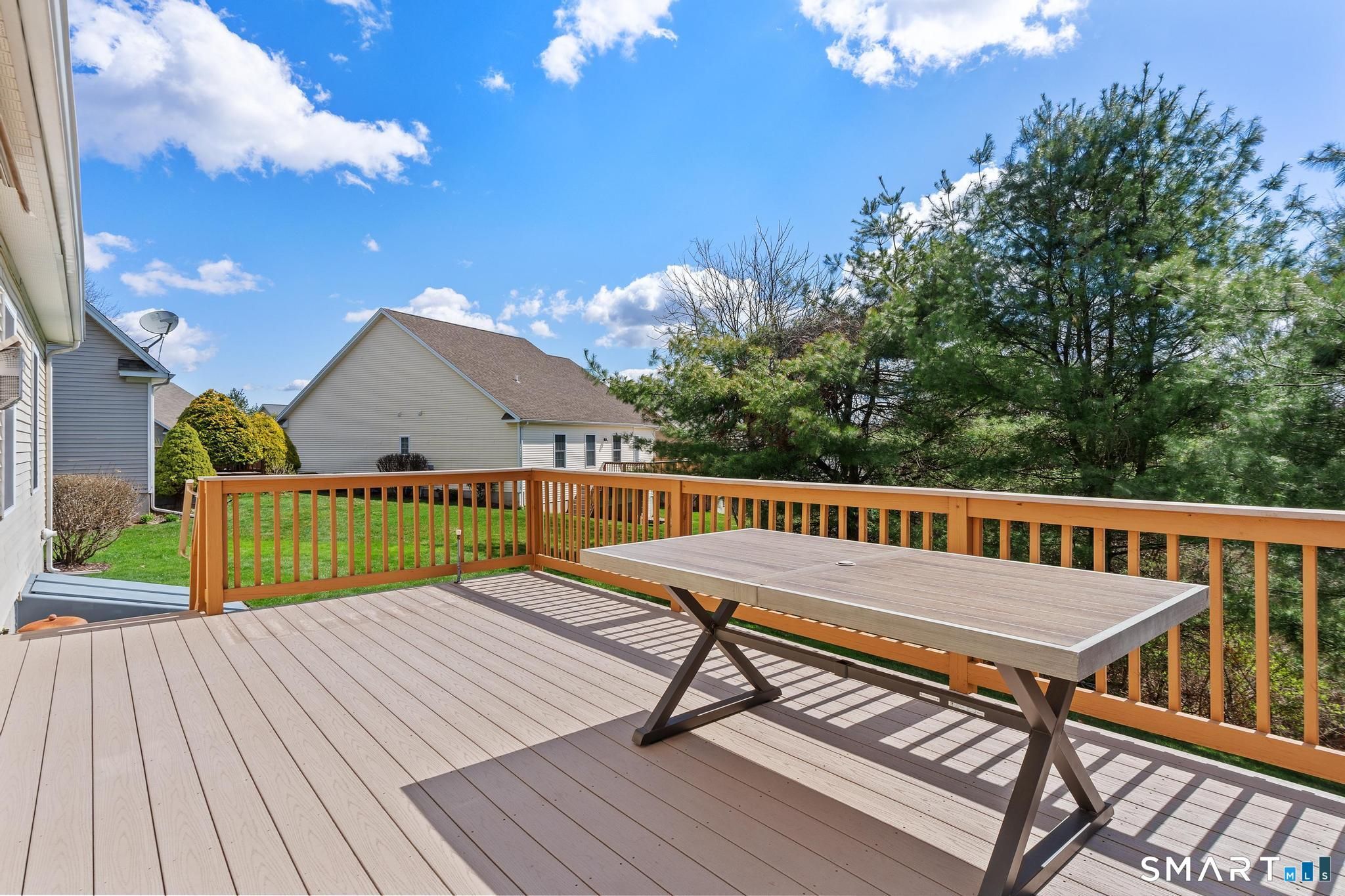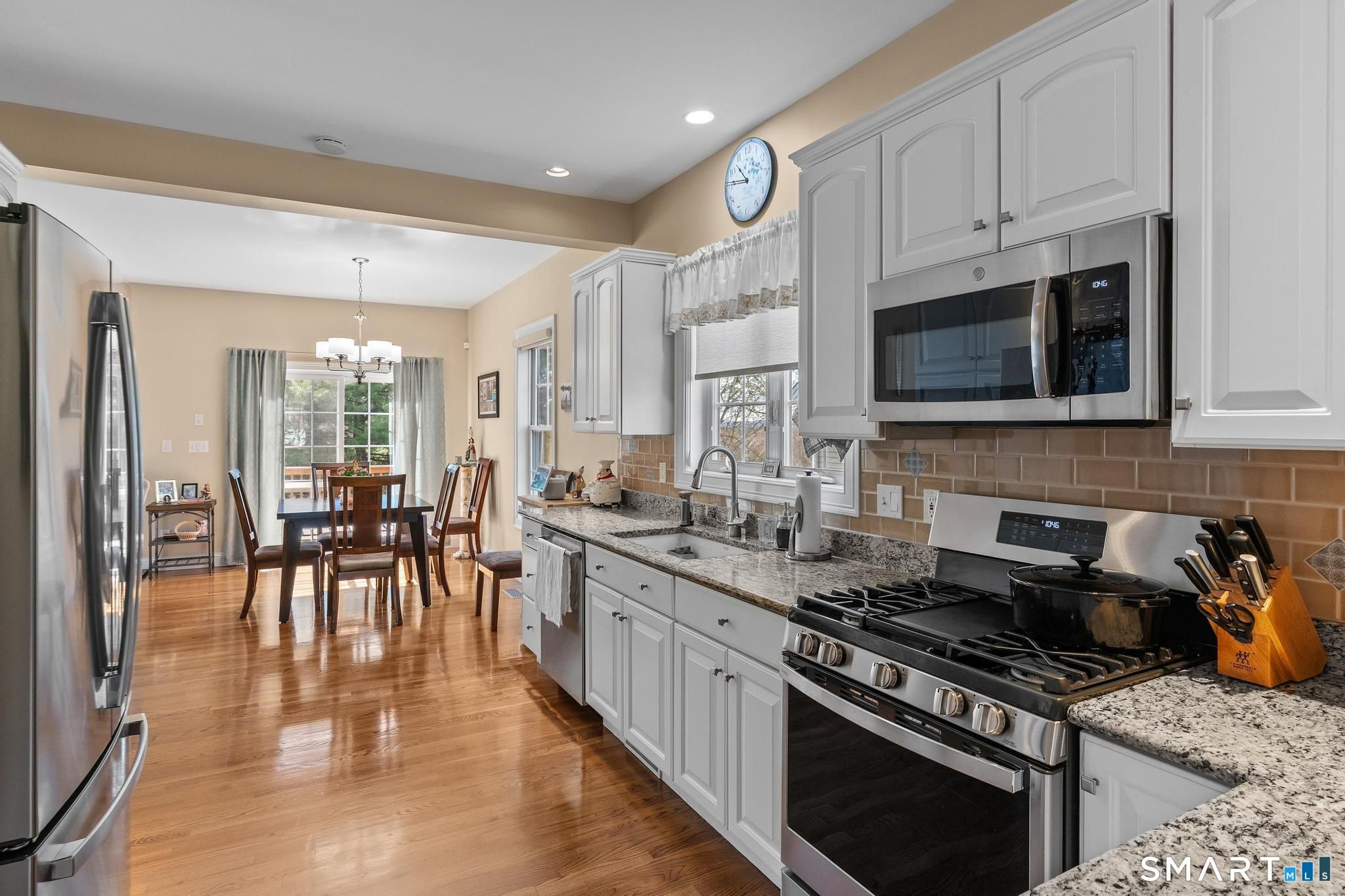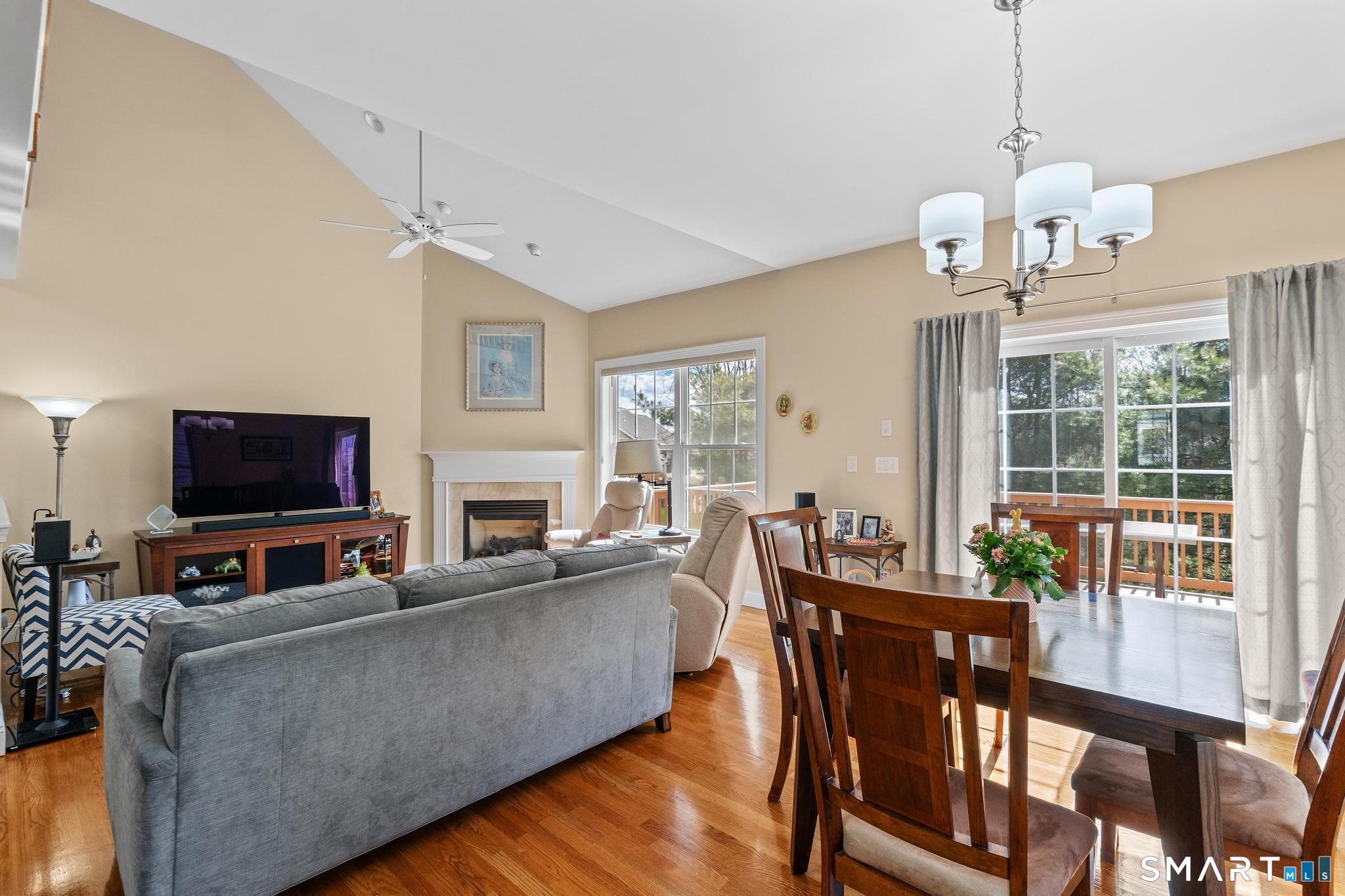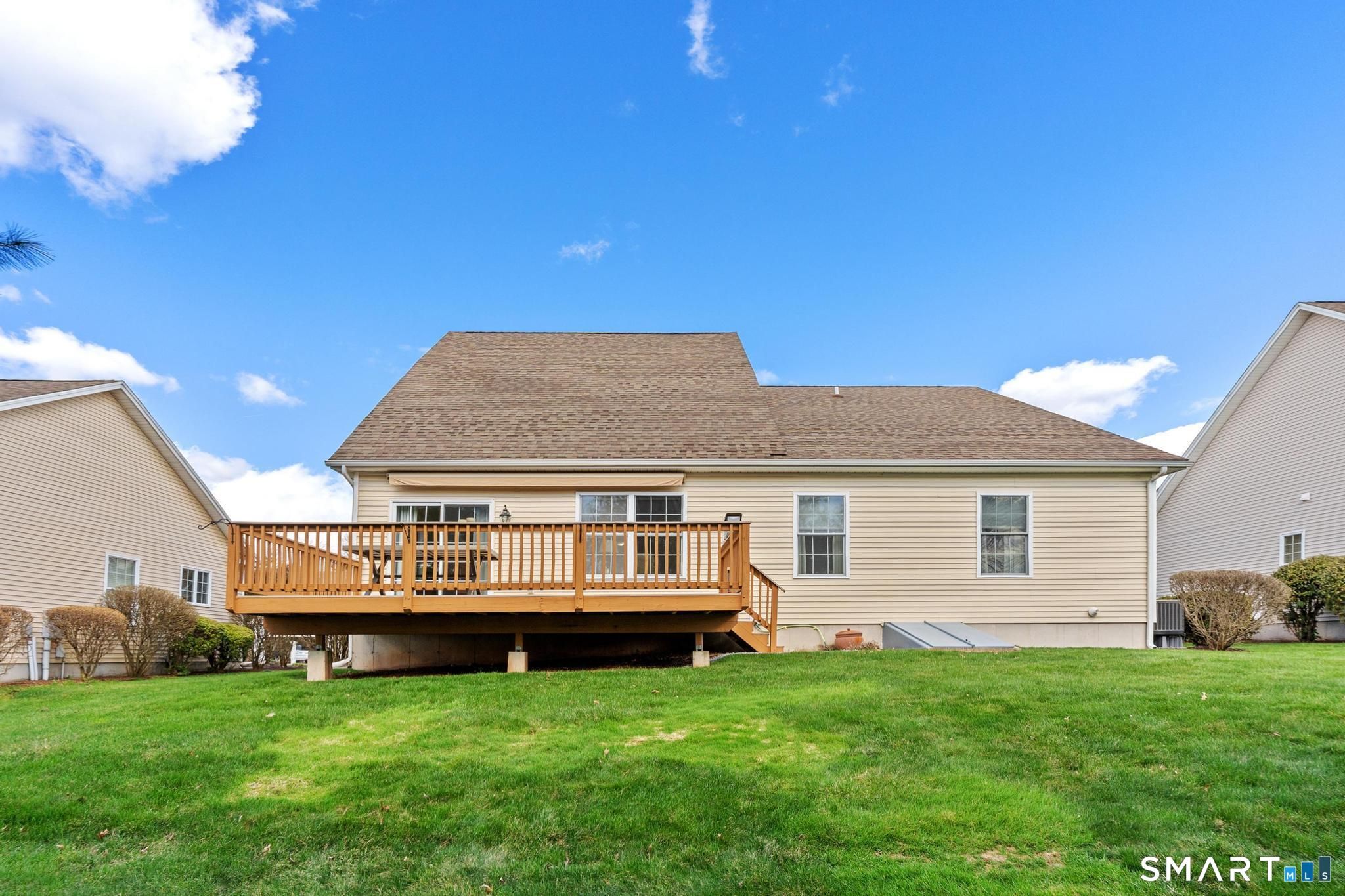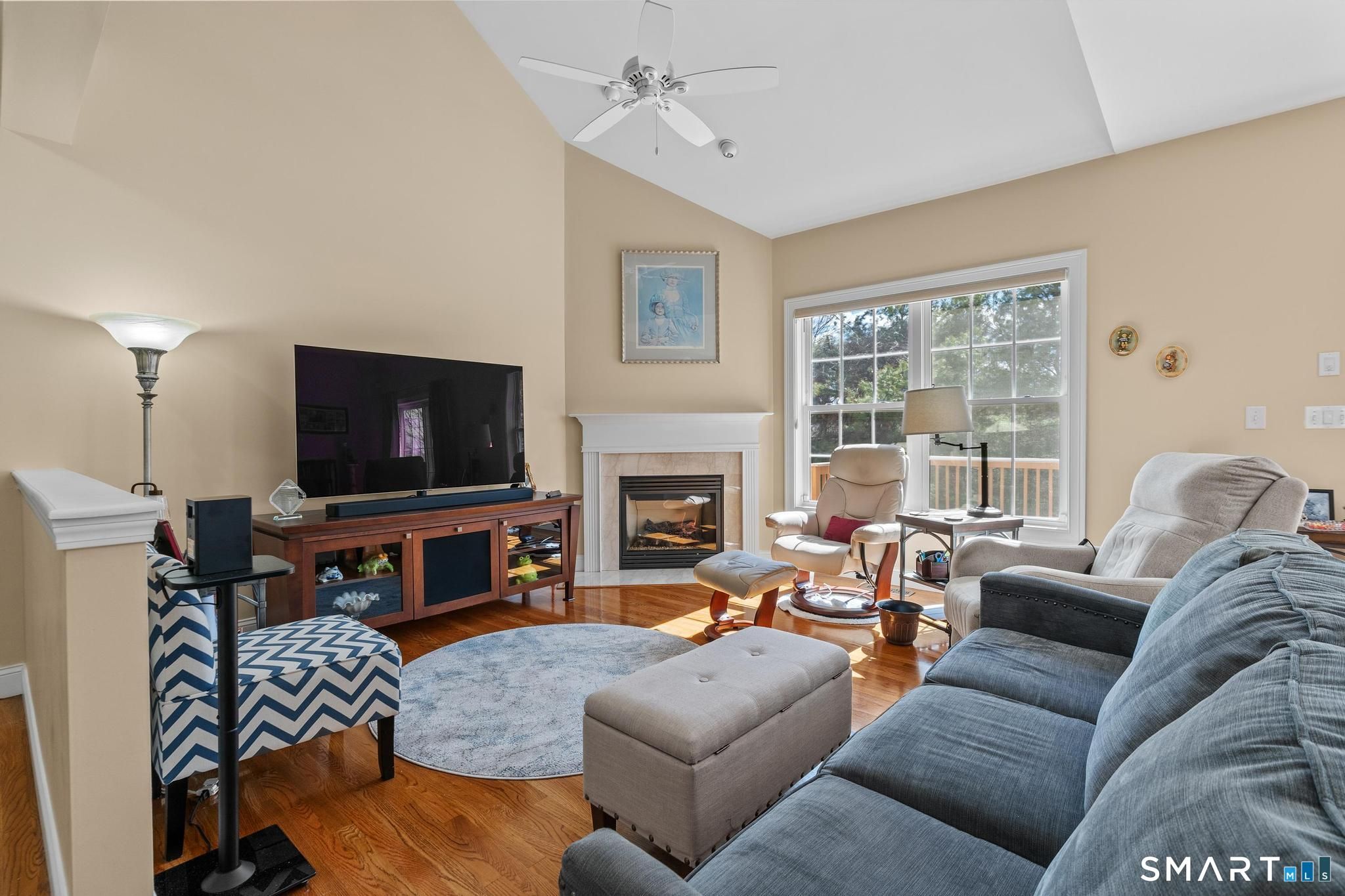 Upon entering this sun filled Cape, you are immediately welcomed by gleaming hardwood floors and a bright, open floor plan designed for both comfort and flow. A spacious home office with abundant windows leads seamlessly into the updated kitchen, featuring granite countertops, newer appliances, and generous cabinetry. The kitchen opens to the dining area, which overlooks the living room-an inviting space highlighted by hardwood floors, a gas fireplace and a soaring cathedral ceiling. Sliding doors provide access to an oversized deck, offering tranquil wooded views and an ideal setting for outdoor relaxation that boasts a motorized awning. The primary bedroom is conveniently located on the first floor and offers ample closet space along with a full bath. Upstairs, two additional bedrooms and a full bathroom provide comfortable accommodations for family or guests. The large basement offers excellent storage and flexible space for future needs. This home has been thoughtfully maintained with numerous recent updates, including a new A/C and furnace (2025), GE microwave, range, and refrigerator (2023), LG washer and dryer (2021), and a Rheem hot water heater (2021). With so many upgrades already completed, this home offers both peace of mind and modern convenience.