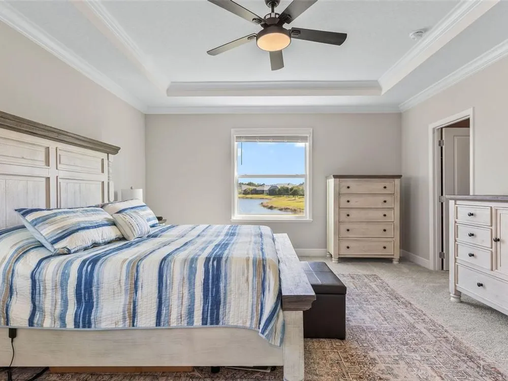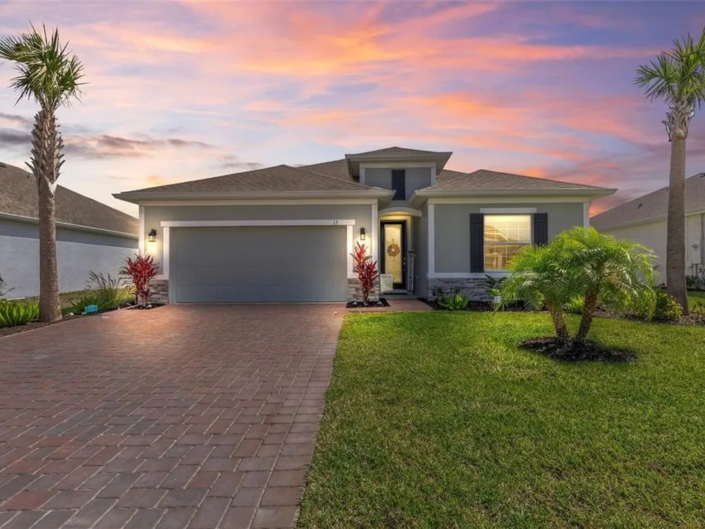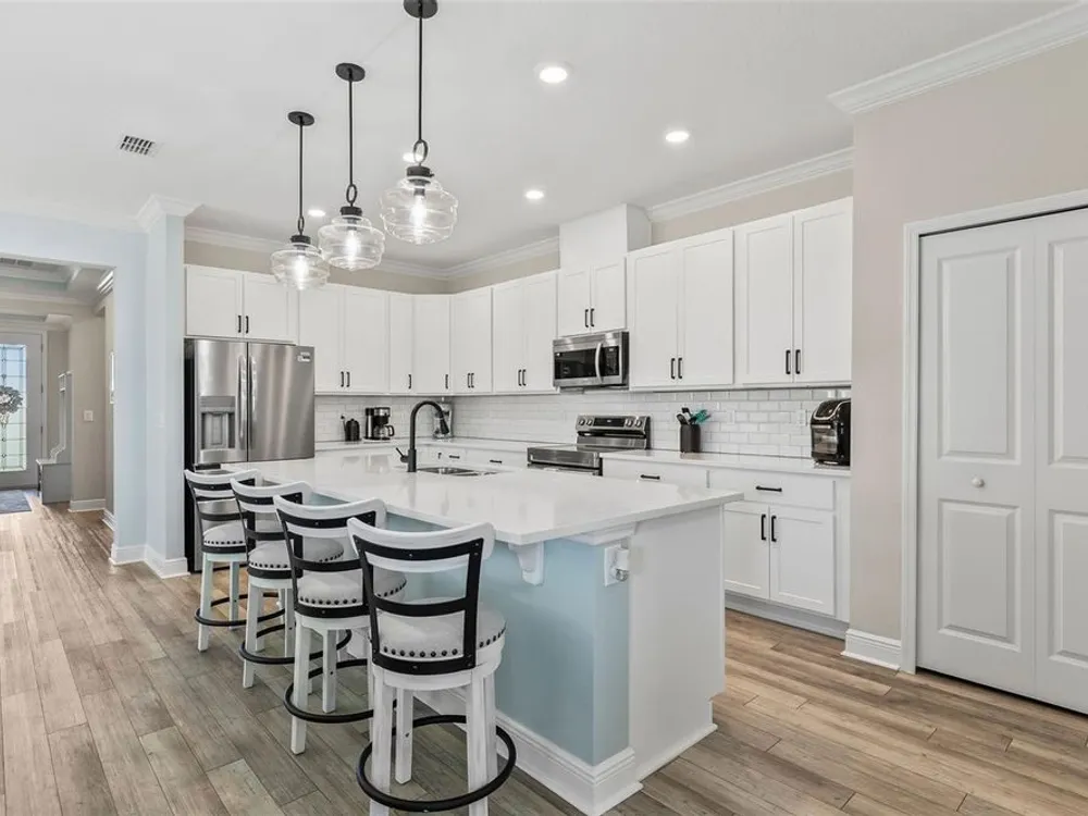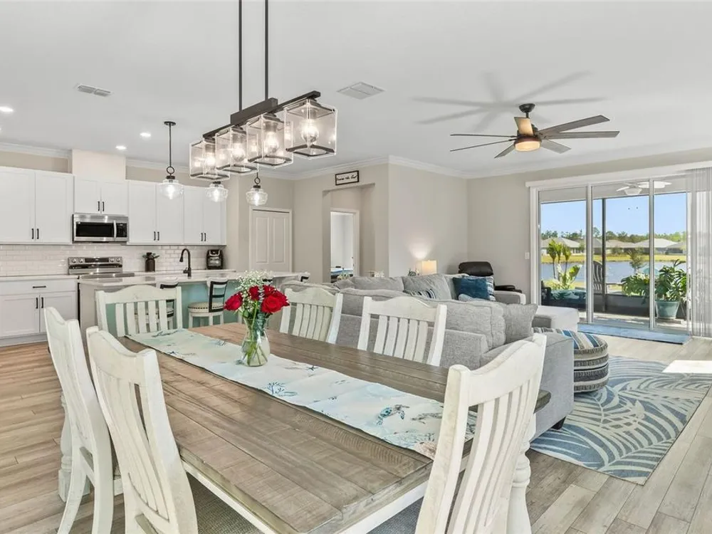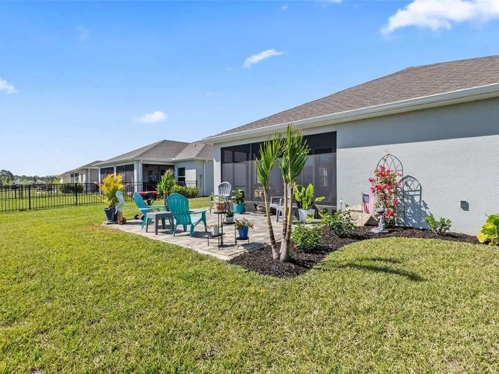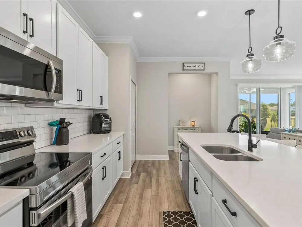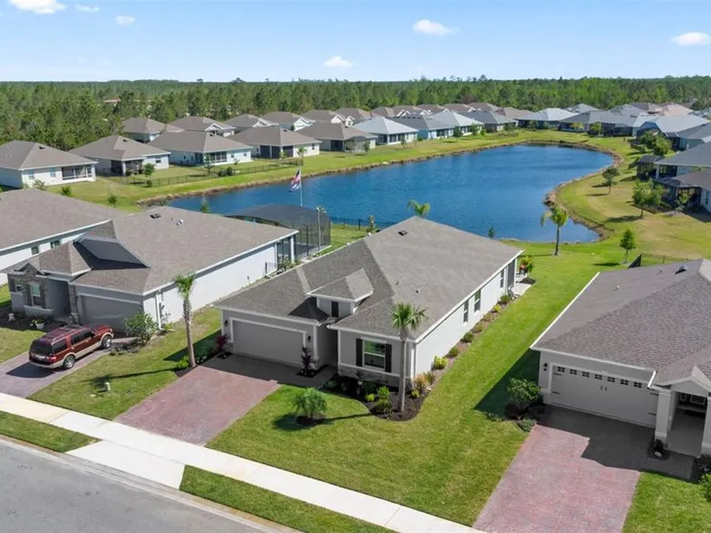 Hello there Beautiful! This absolutely gorgeous home is located in Huntington Green at Hunters Ridge, a lovely 55+ community in Ormond Beach, Florida! This nearly new home is in pristine condition, eagerly awaiting new owners to make it their own. The kitchen features soft-close cabinets and quartz countertops. The white subway tile backsplash beautifully complements the cabinets, creating a timeless yet sophisticated appearance. The owners invested significantly in upgrades, including crown molding, 6-inch baseboards, 9-foot ceilings, and tray ceilings in both the entry foyer and the primary bedroom. Luxury vinyl plank flooring extends throughout all the main areas of the home, while cozy carpeting graces the bedrooms. With four bedrooms and three full baths, there is ample space for guests. Each bathroom features quartz countertops. The primary suite is incredibly spacious, featuring picturesque views of the pond. The bathroom is equally roomy, equipped with a soaking tub and a walk-in shower. You'll find ample countertop space along with numerous drawers for storage. A walk-in closet completes this space. Enjoy your morning coffee on the screened lanai. In the evenings, savor cocktails on the patio while watching the sun set over the pond. This property offers ample space to entertain, both indoors and outdoors. Huntington Green amenities include its own pool and clubhouse, and you also have access to the pool at Hunters Ridge. Savor the vibrant community around you, with the beach, shopping, and great restaurants just minutes away!