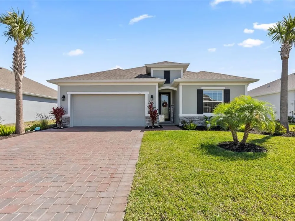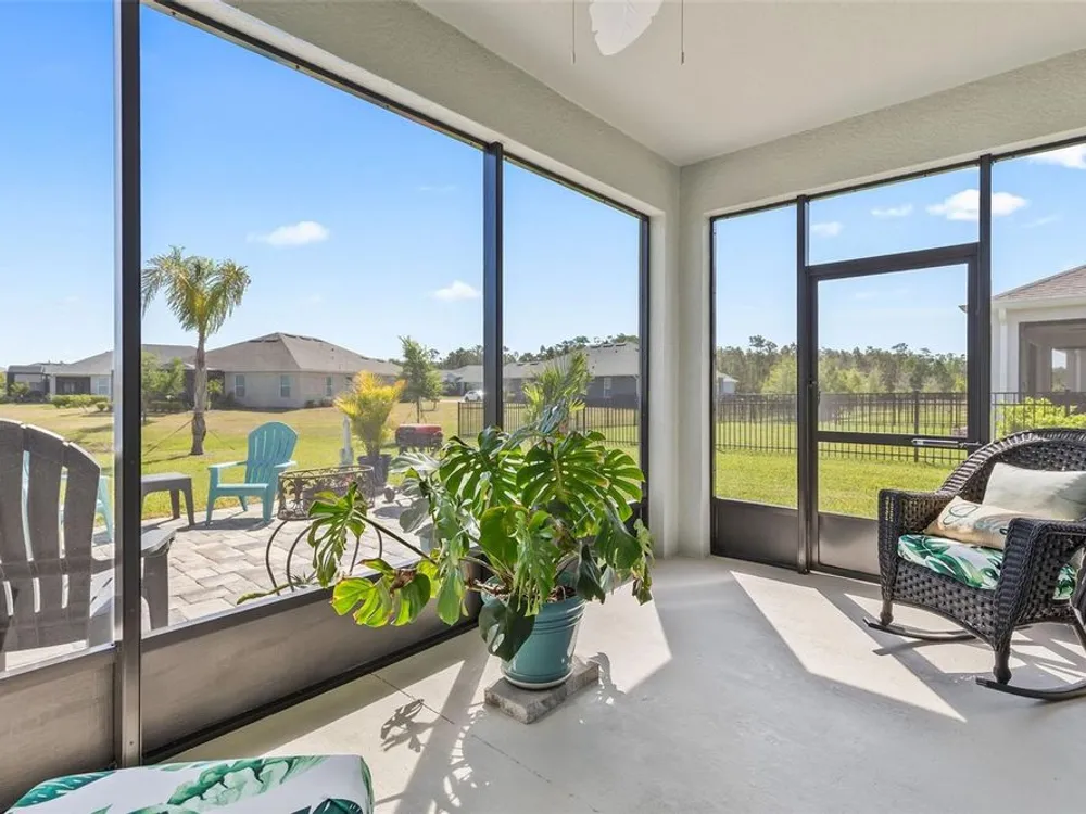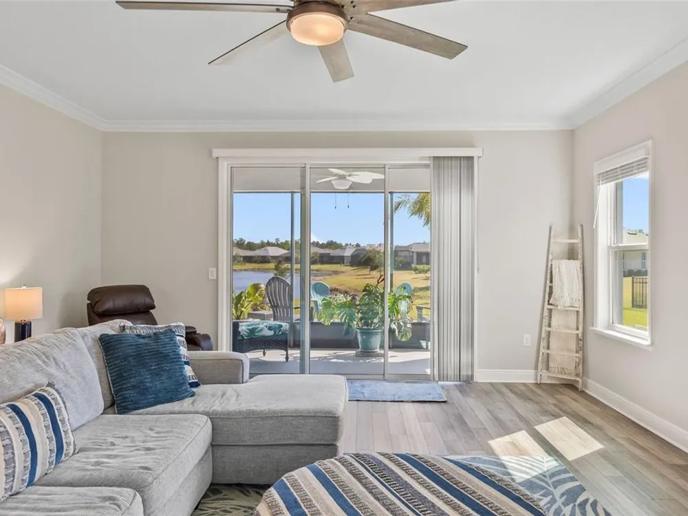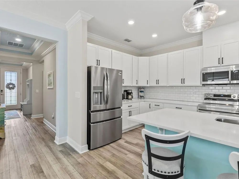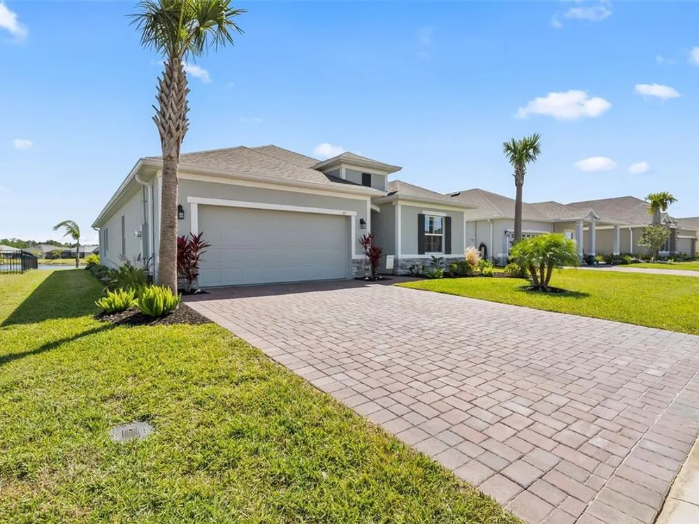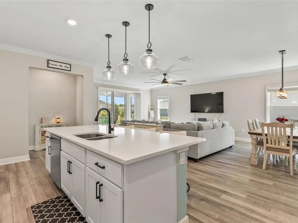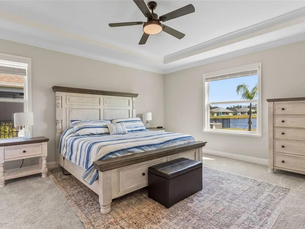 Hello there Beautiful! This absolutely gorgeous home is located in Huntington Green at Hunters Ridge, a lovely 55+ community in Ormond Beach, Florida! This nearly new home is in pristine condition, eagerly awaiting new owners to make it their own. The kitchen features soft-close cabinets and quartz countertops. The white subway tile backsplash beautifully complements the cabinets, creating a timeless yet sophisticated appearance. The owners invested significantly in upgrades, including crown molding, 6-inch baseboards, 9-foot ceilings, and tray ceilings in both the entry foyer and the primary bedroom. Luxury vinyl plank flooring extends throughout all the main areas of the home, while cozy carpeting graces the bedrooms. With four bedrooms and three full baths, there is ample space for guests. Each bathroom features quartz countertops. The primary suite is incredibly spacious, featuring picturesque views of the pond. The bathroom is equally roomy, equipped with a soaking tub and a walk-in shower. You'll find ample countertop space along with numerous drawers for storage. A walk-in closet completes this space. Enjoy your morning coffee on the screened lanai. In the evenings, savor cocktails on the patio while watching the sun set over the pond. This property offers ample space to entertain, both indoors and outdoors. Huntington Green amenities include its own pool and clubhouse, and you also have access to the pool at Hunters Ridge. Savor the vibrant community around you, with the beach, shopping, and great restaurants just minutes away!