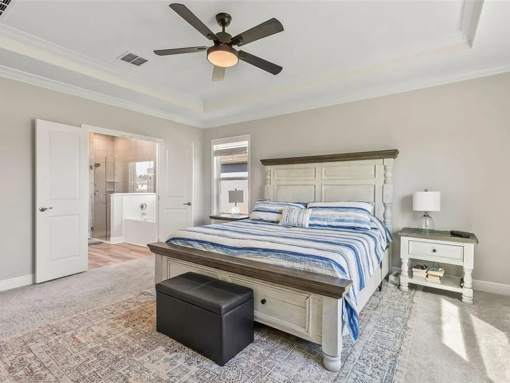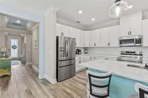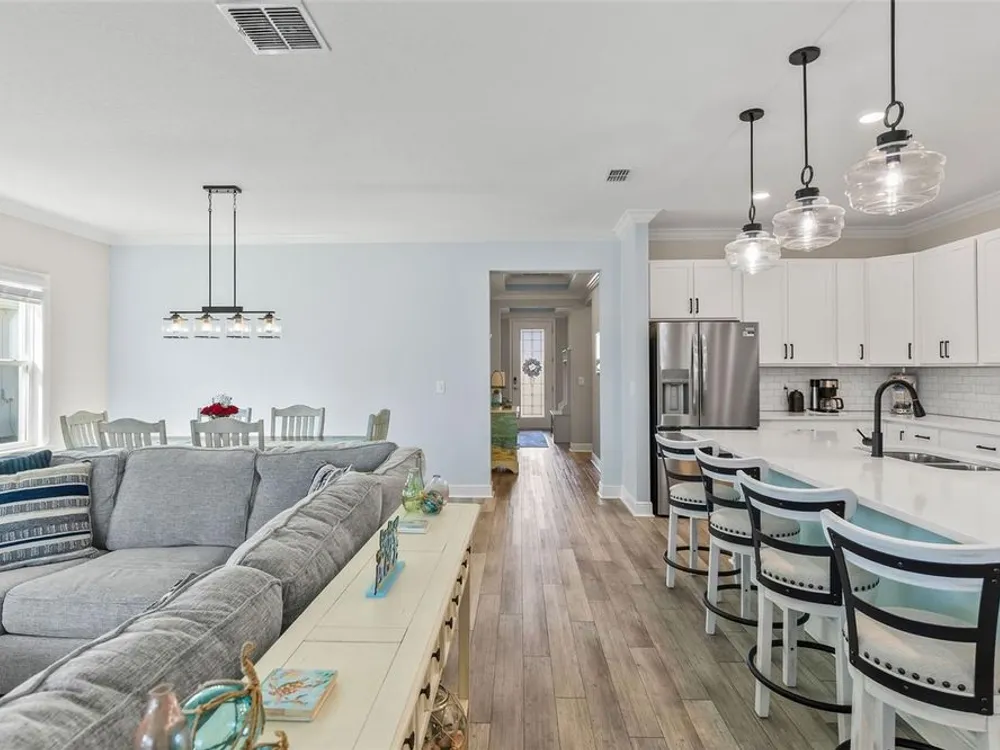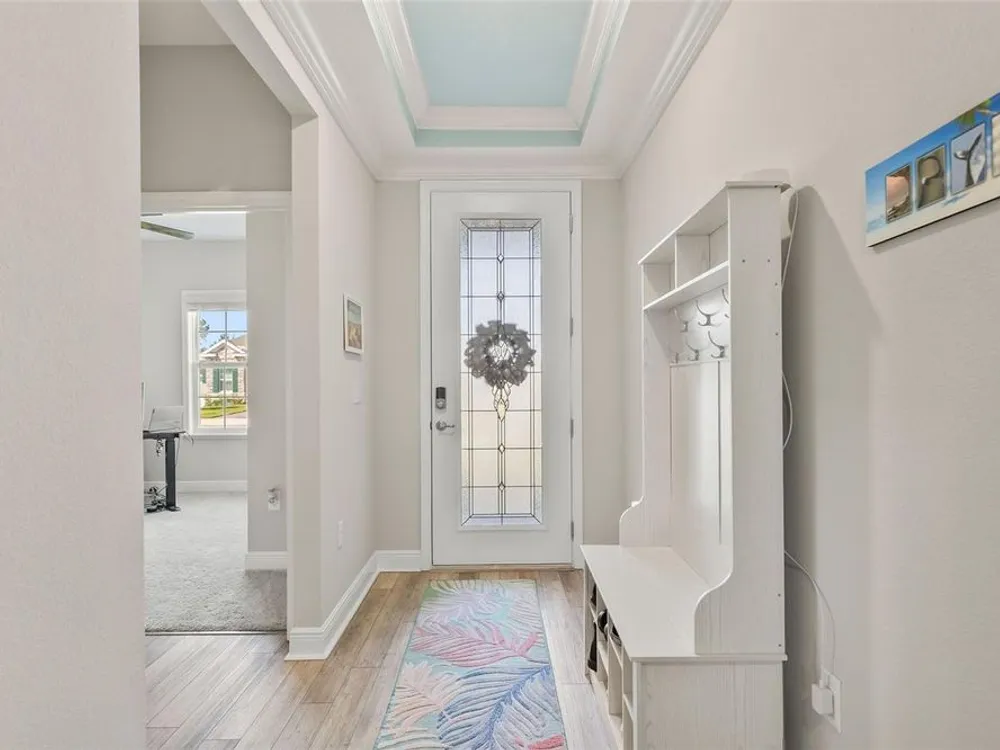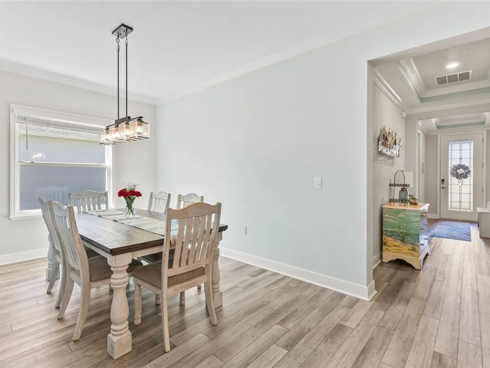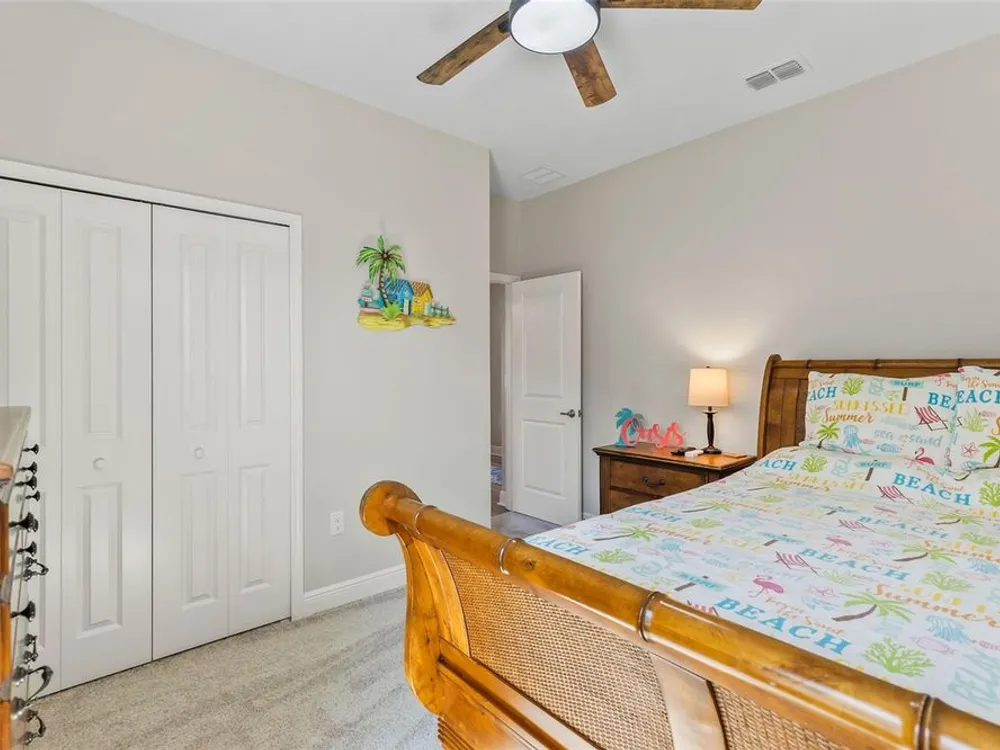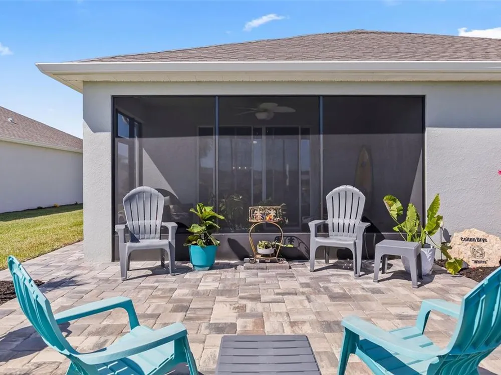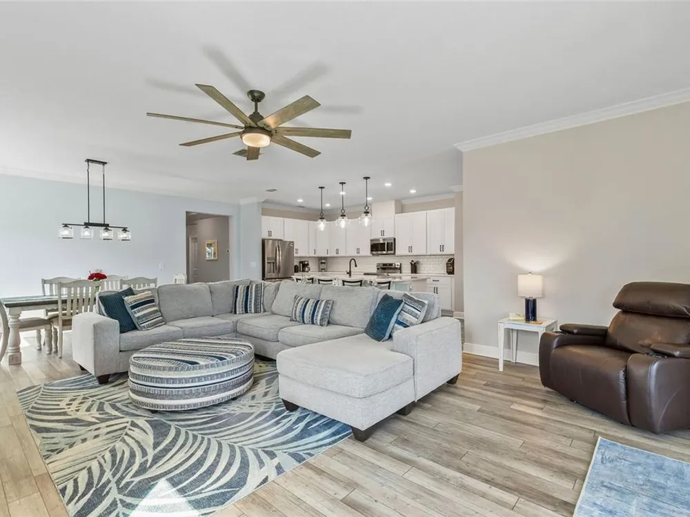 Hello there Beautiful! This absolutely gorgeous home is located in Huntington Green at Hunters Ridge, a lovely 55+ community in Ormond Beach, Florida! This nearly new home is in pristine condition, eagerly awaiting new owners to make it their own. The kitchen features soft-close cabinets and quartz countertops. The white subway tile backsplash beautifully complements the cabinets, creating a timeless yet sophisticated appearance. The owners invested significantly in upgrades, including crown molding, 6-inch baseboards, 9-foot ceilings, and tray ceilings in both the entry foyer and the primary bedroom. Luxury vinyl plank flooring extends throughout all the main areas of the home, while cozy carpeting graces the bedrooms. With four bedrooms and three full baths, there is ample space for guests. Each bathroom features quartz countertops. The primary suite is incredibly spacious, featuring picturesque views of the pond. The bathroom is equally roomy, equipped with a soaking tub and a walk-in shower. You'll find ample countertop space along with numerous drawers for storage. A walk-in closet completes this space. Enjoy your morning coffee on the screened lanai. In the evenings, savor cocktails on the patio while watching the sun set over the pond. This property offers ample space to entertain, both indoors and outdoors. Huntington Green amenities include its own pool and clubhouse, and you also have access to the pool at Hunters Ridge. Savor the vibrant community around you, with the beach, shopping, and great restaurants just minutes away!