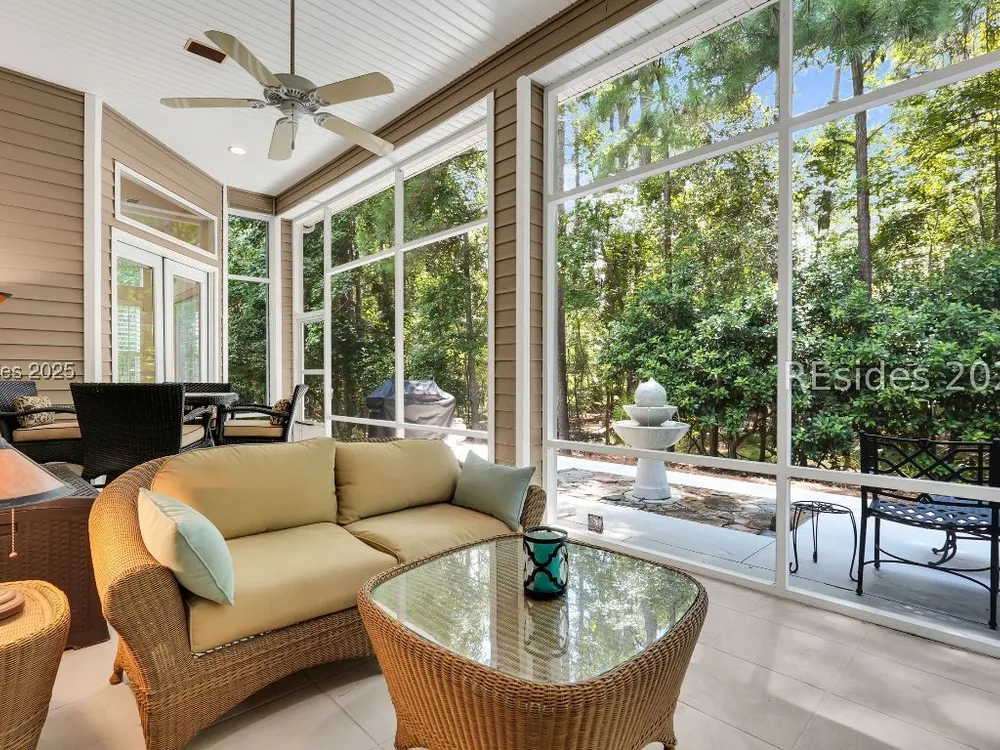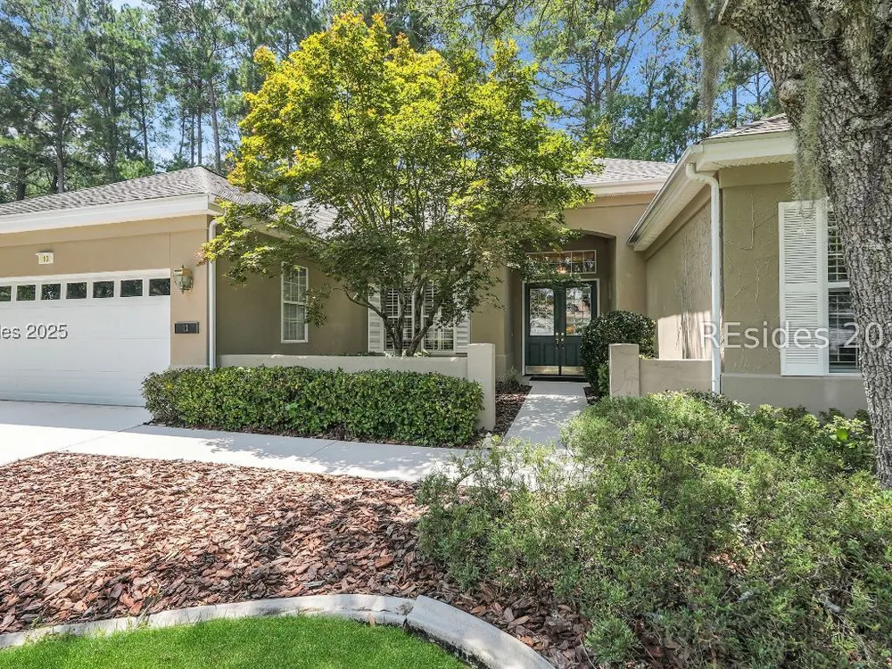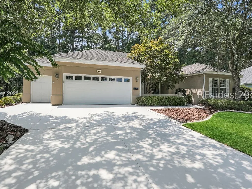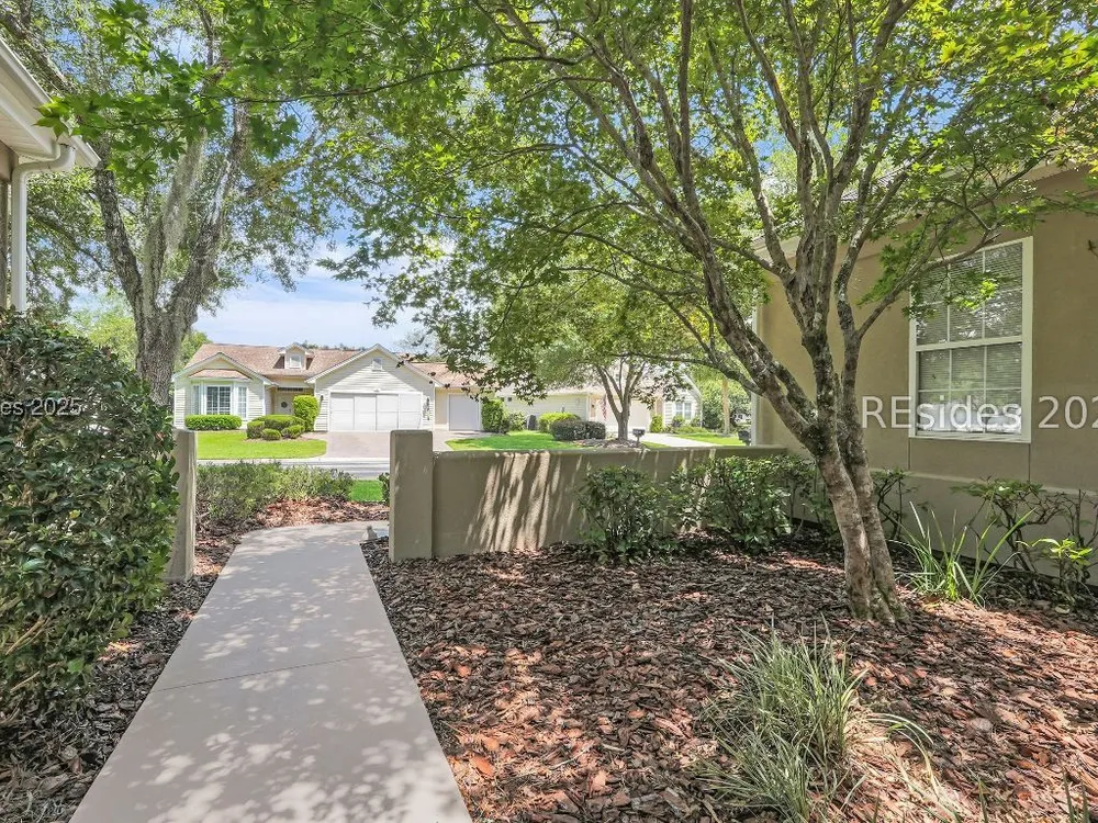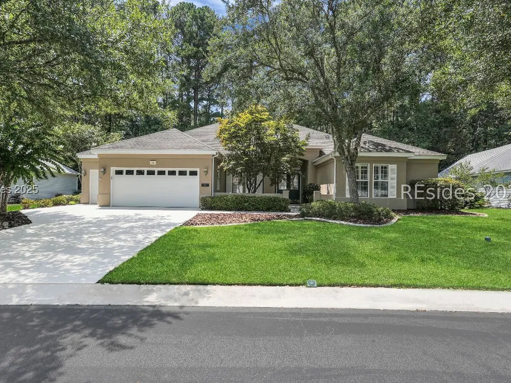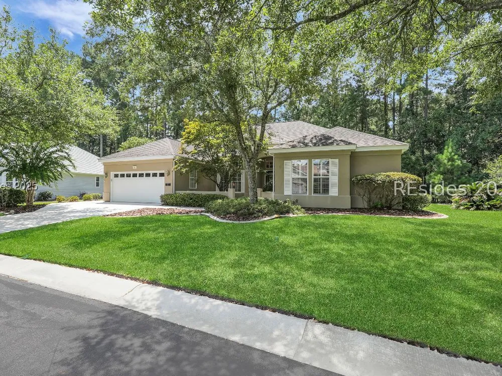 Located on a tranquil court in Sun City Hilton Head lies a rare and refined Del Webb Marion Webster Estate Model-a one story home showcasing soaring 12 foot ceilings and is enveloped by a serene wooded view. The expansive layout encompasses 2 bedrooms, 2.5 bathrooms and includes a versatile den/office/library thoughtfully equipped with a Murphy bed, offering the option of a third bedroom. This home includes two living rooms, one is equipped with built ins and a cozy fireplace. Other upgrades include a new A/C, two car garage PLUS golf cart garage, a spacious primary suite w/a closet equipped with custom shelving & an expanded screen lanai which is the perfect space to unwind while admiring views of the water fountain and secluded woods. There are too many upgrades to list, this home is a must see!