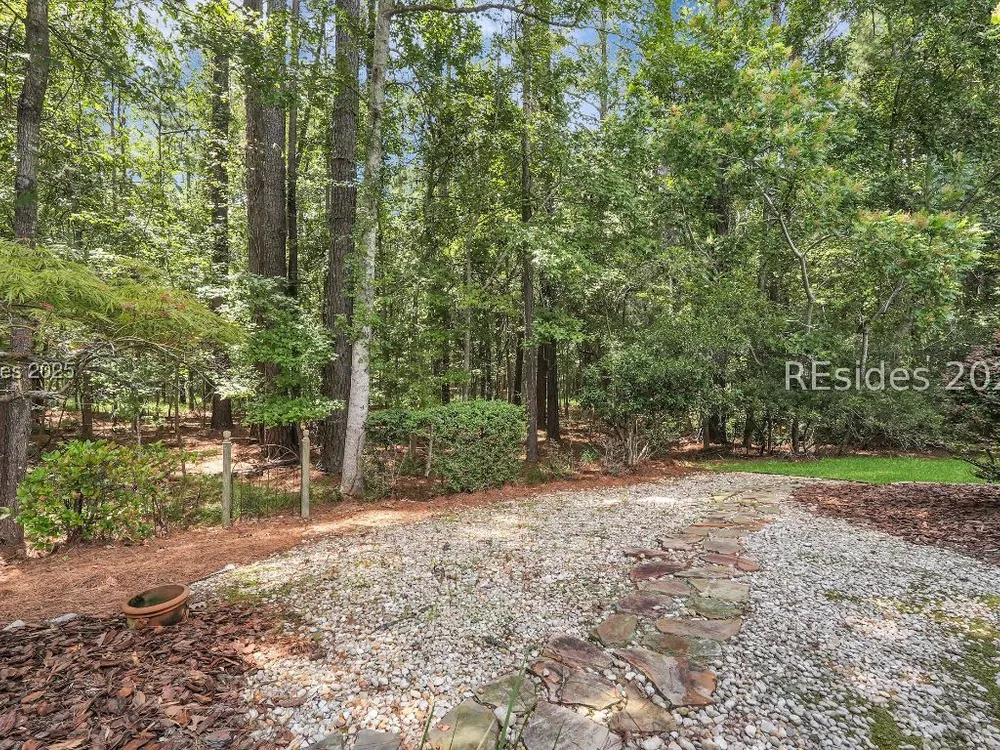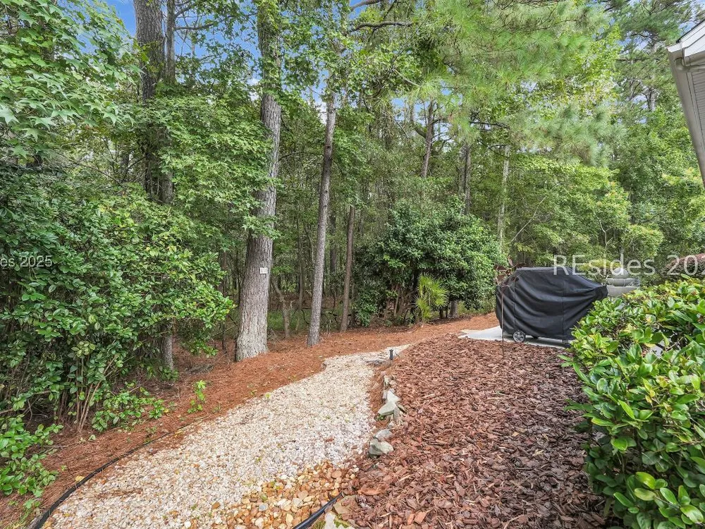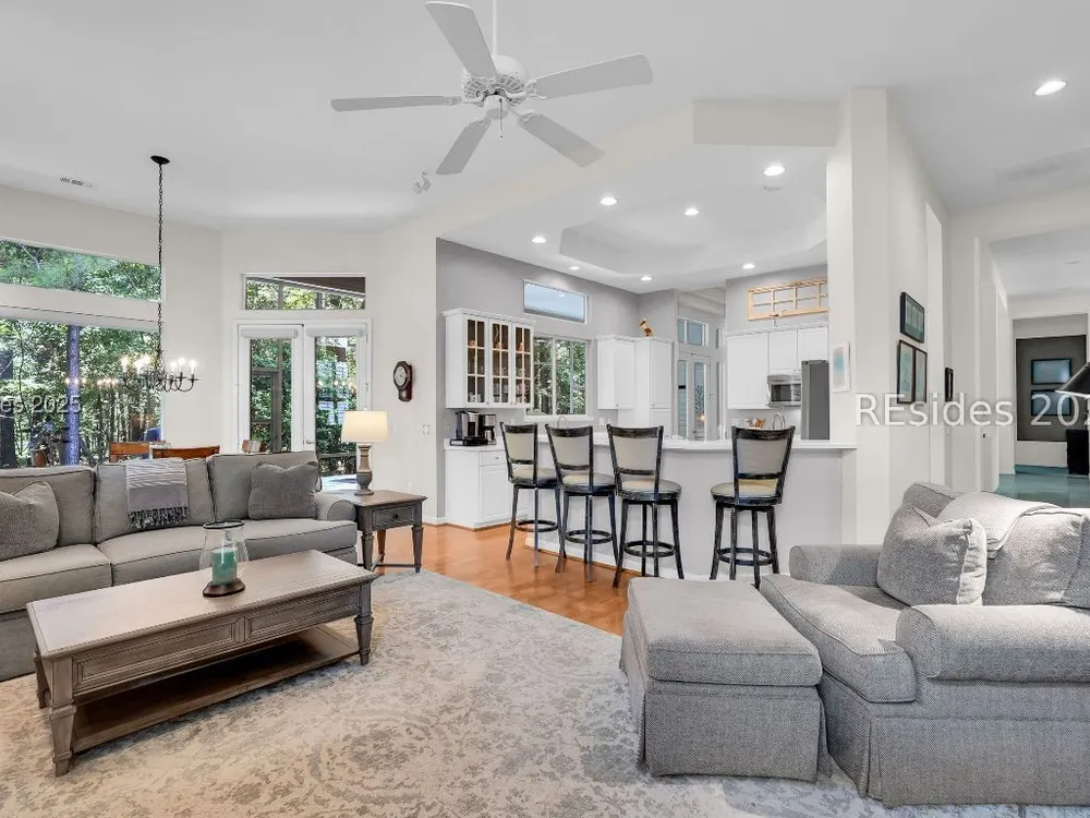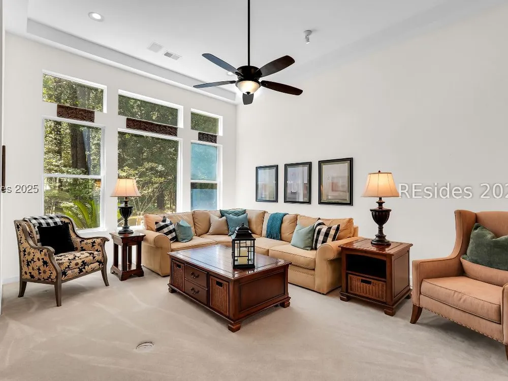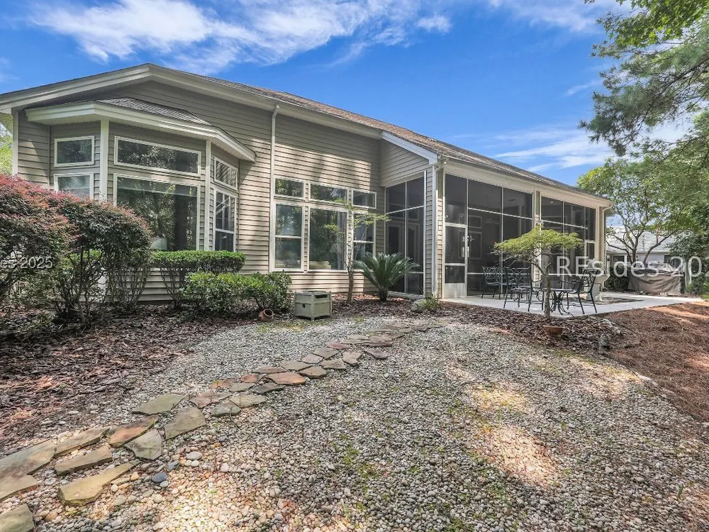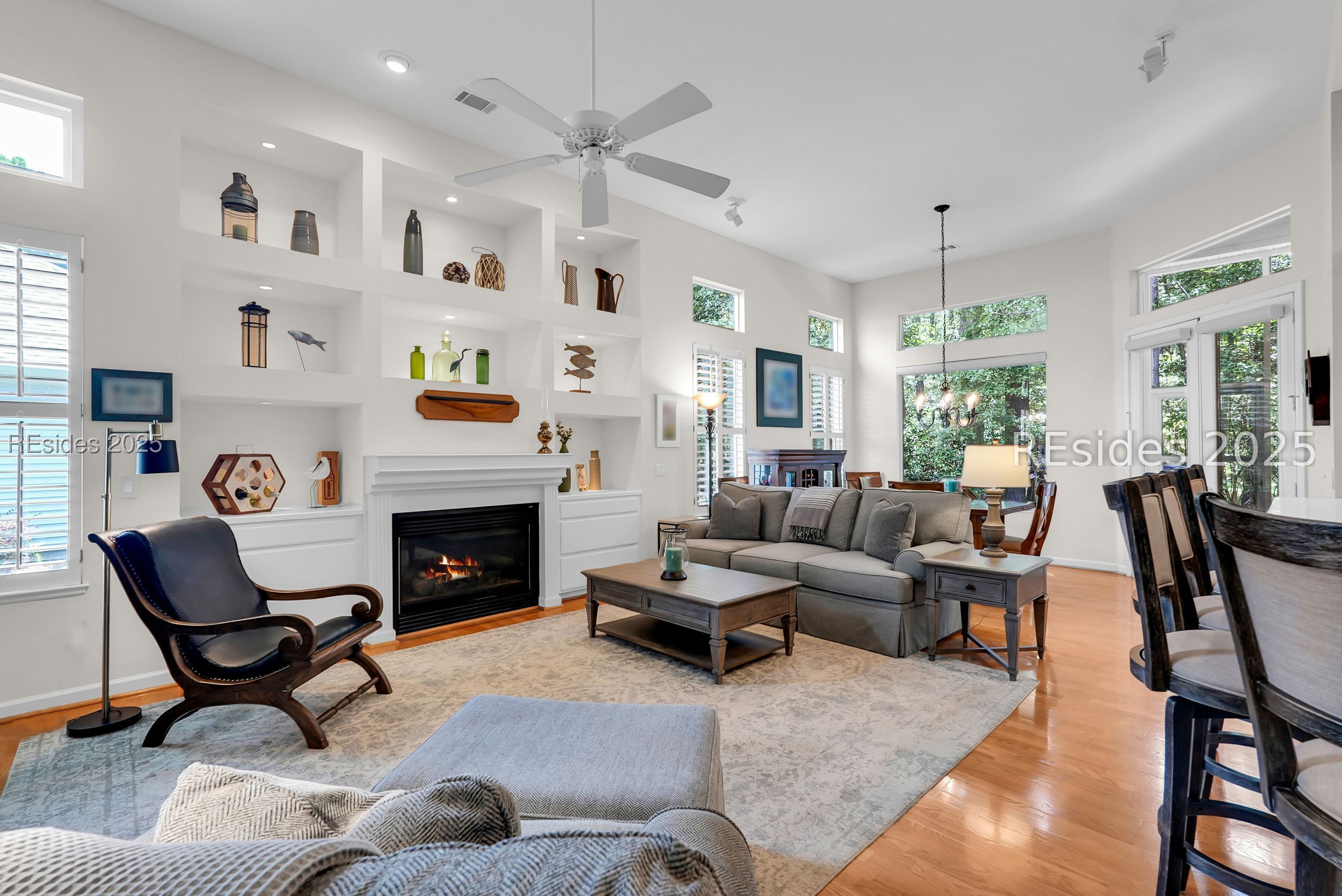 Located on a tranquil court in Sun City Hilton Head lies a rare and refined Del Webb Marion Webster Estate Model-a one story home showcasing soaring 12 foot ceilings and is enveloped by a serene wooded view. The expansive layout encompasses 2 bedrooms, 2.5 bathrooms and includes a versatile den/office/library thoughtfully equipped with a Murphy bed, offering the option of a third bedroom. This home includes two living rooms, one is equipped with built ins and a cozy fireplace. Other upgrades include a new A/C, two car garage PLUS golf cart garage, a spacious primary suite w/a closet equipped with custom shelving & an expanded screen lanai which is the perfect space to unwind while admiring views of the water fountain and secluded woods. There are too many upgrades to list, this home is a must see!