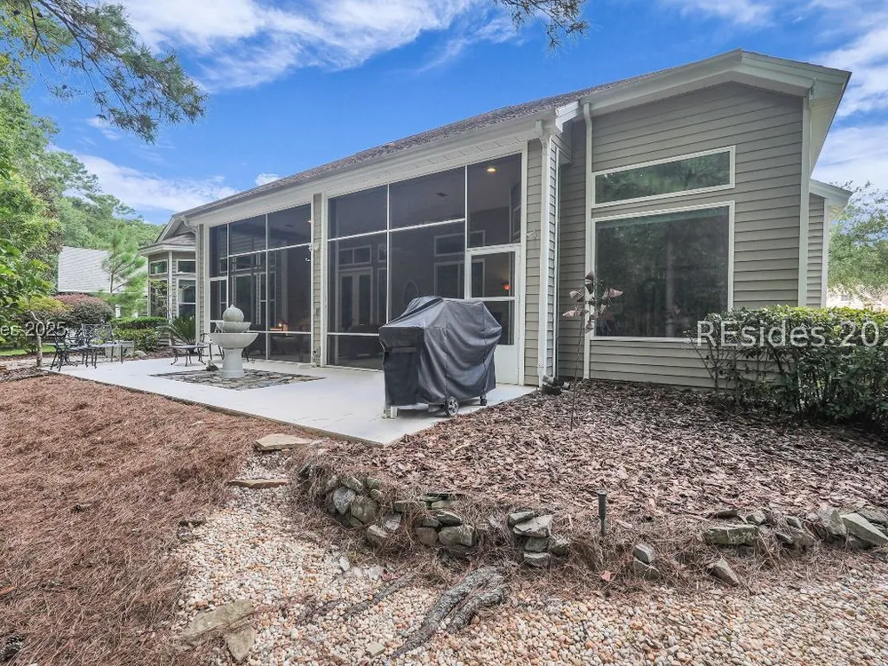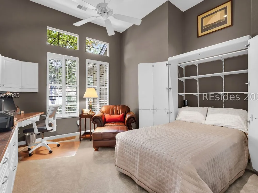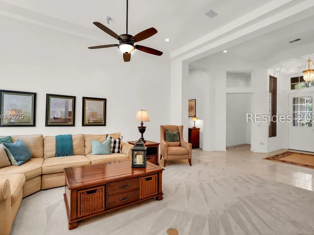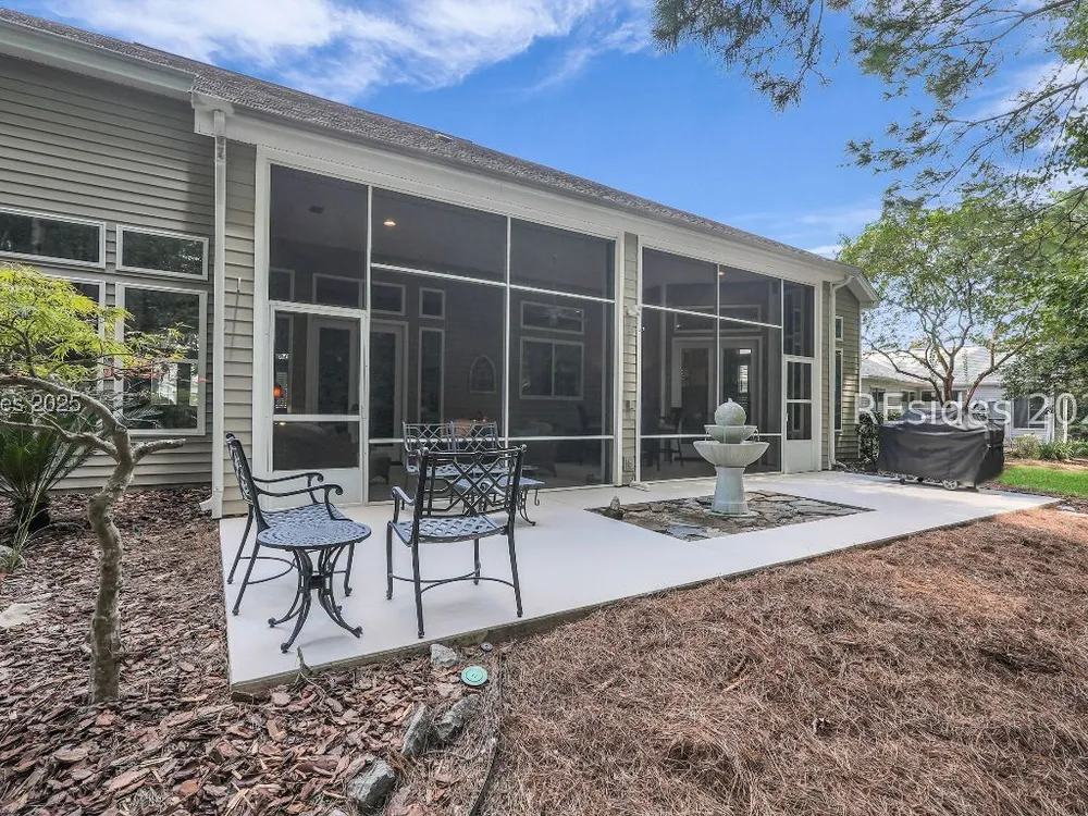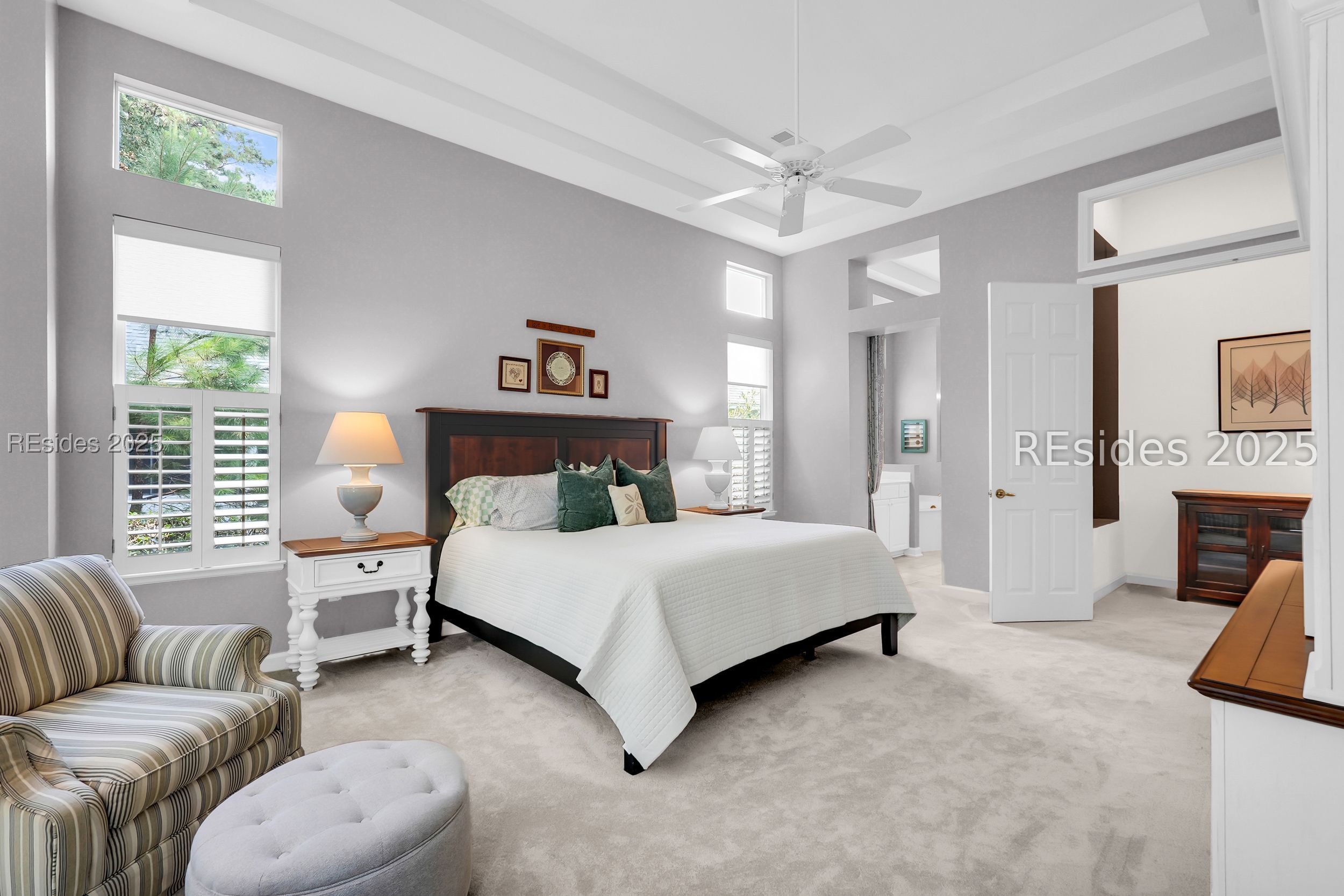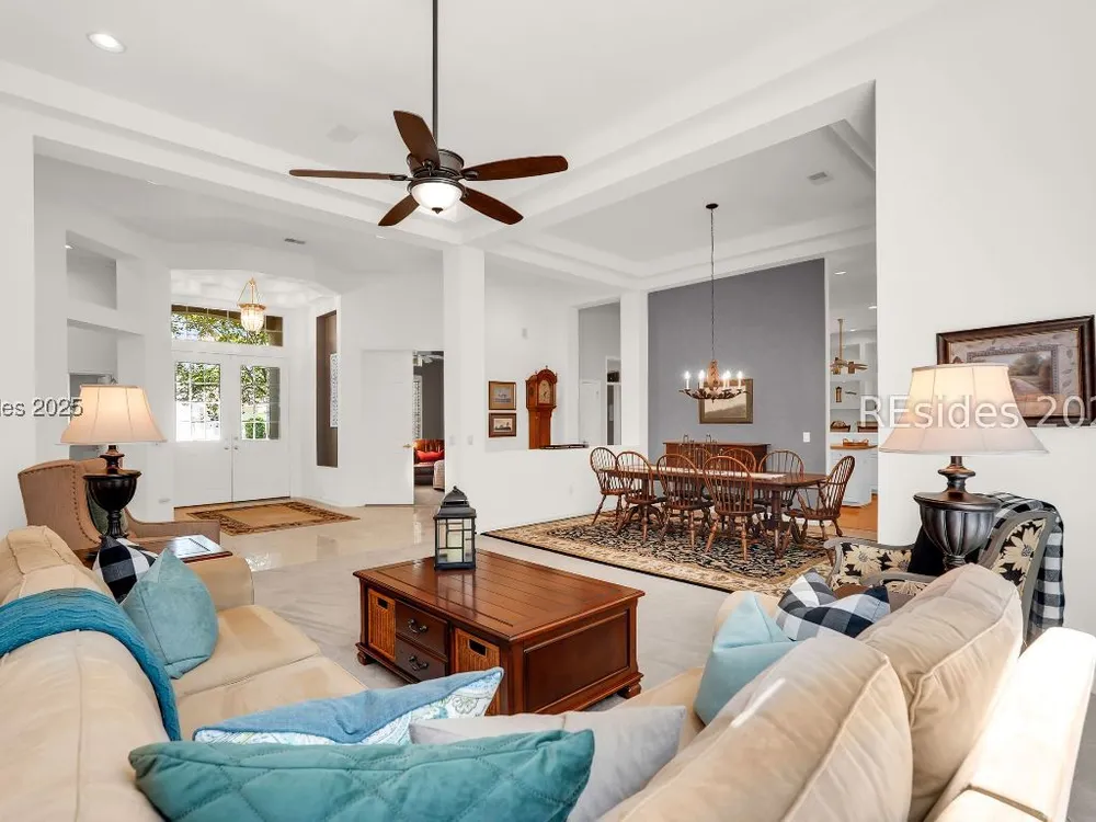 Located on a tranquil court in Sun City Hilton Head lies a rare and refined Del Webb Marion Webster Estate Model-a one story home showcasing soaring 12 foot ceilings and is enveloped by a serene wooded view. The expansive layout encompasses 2 bedrooms, 2.5 bathrooms and includes a versatile den/office/library thoughtfully equipped with a Murphy bed, offering the option of a third bedroom. This home includes two living rooms, one is equipped with built ins and a cozy fireplace. Other upgrades include a new A/C, two car garage PLUS golf cart garage, a spacious primary suite w/a closet equipped with custom shelving & an expanded screen lanai which is the perfect space to unwind while admiring views of the water fountain and secluded woods. There are too many upgrades to list, this home is a must see!