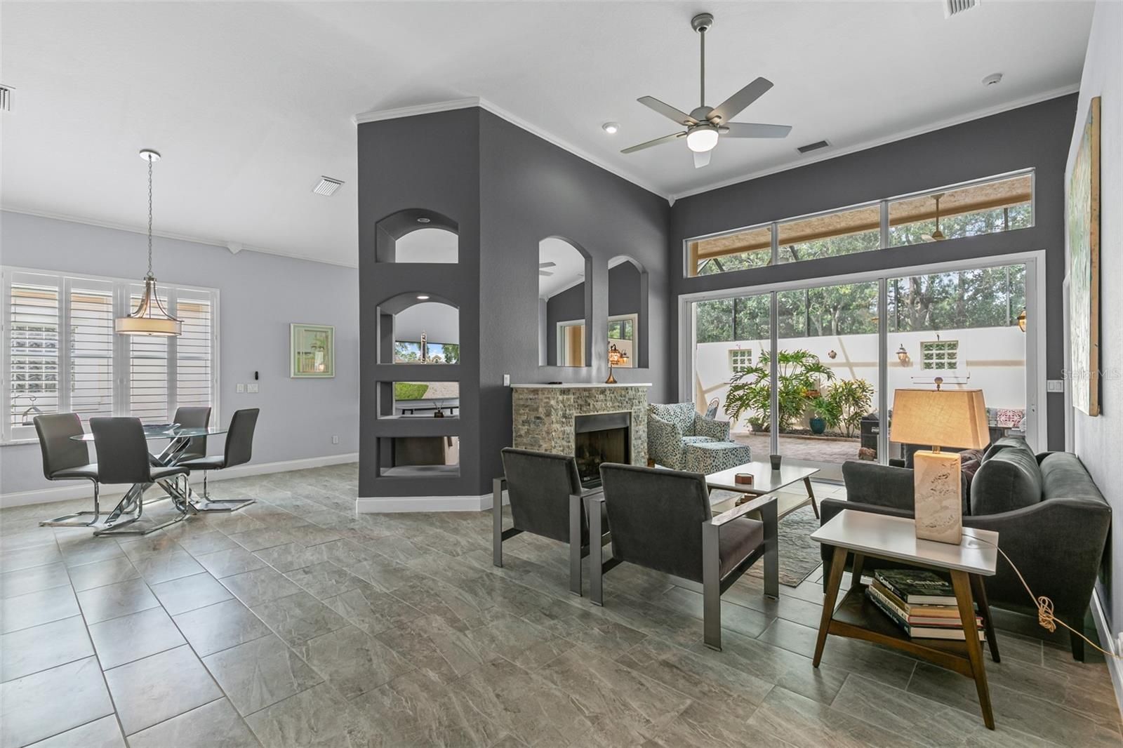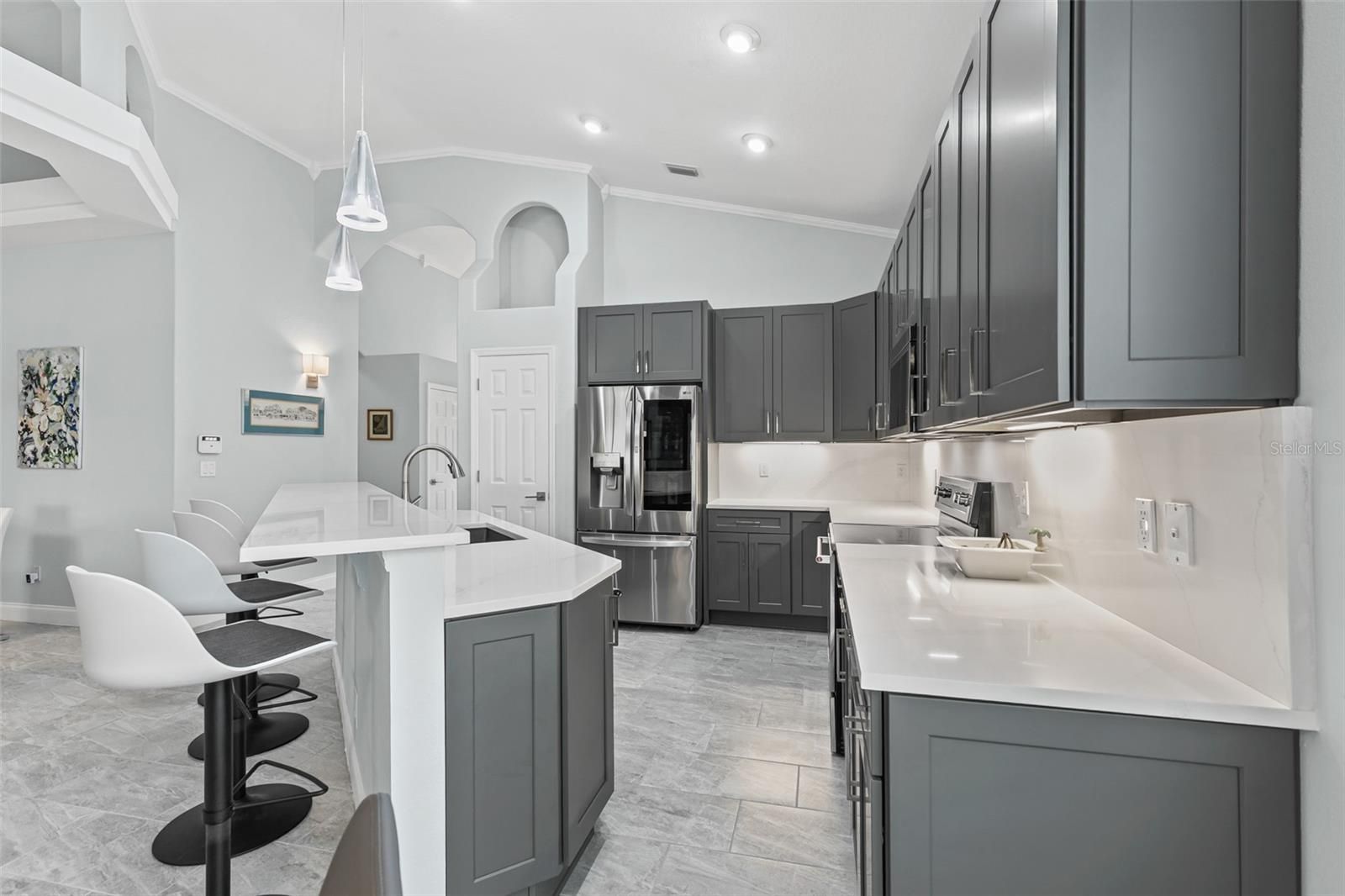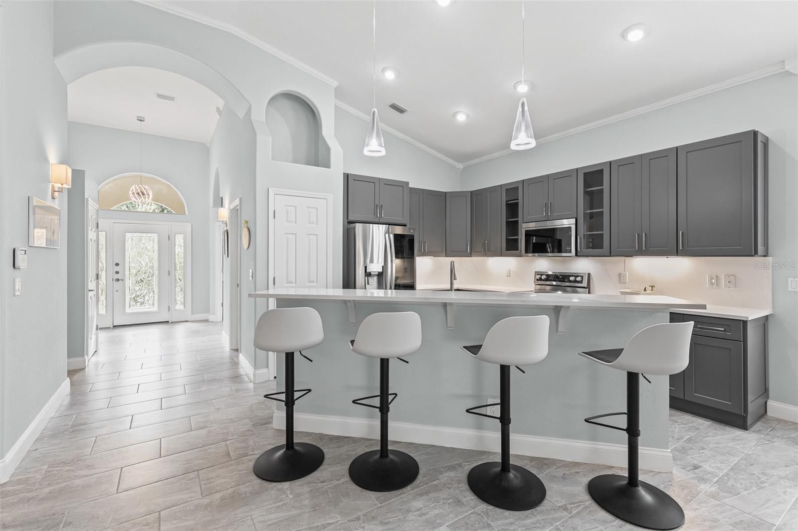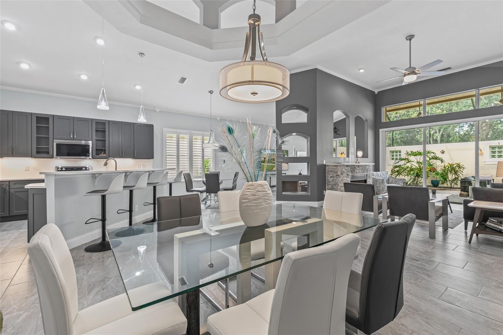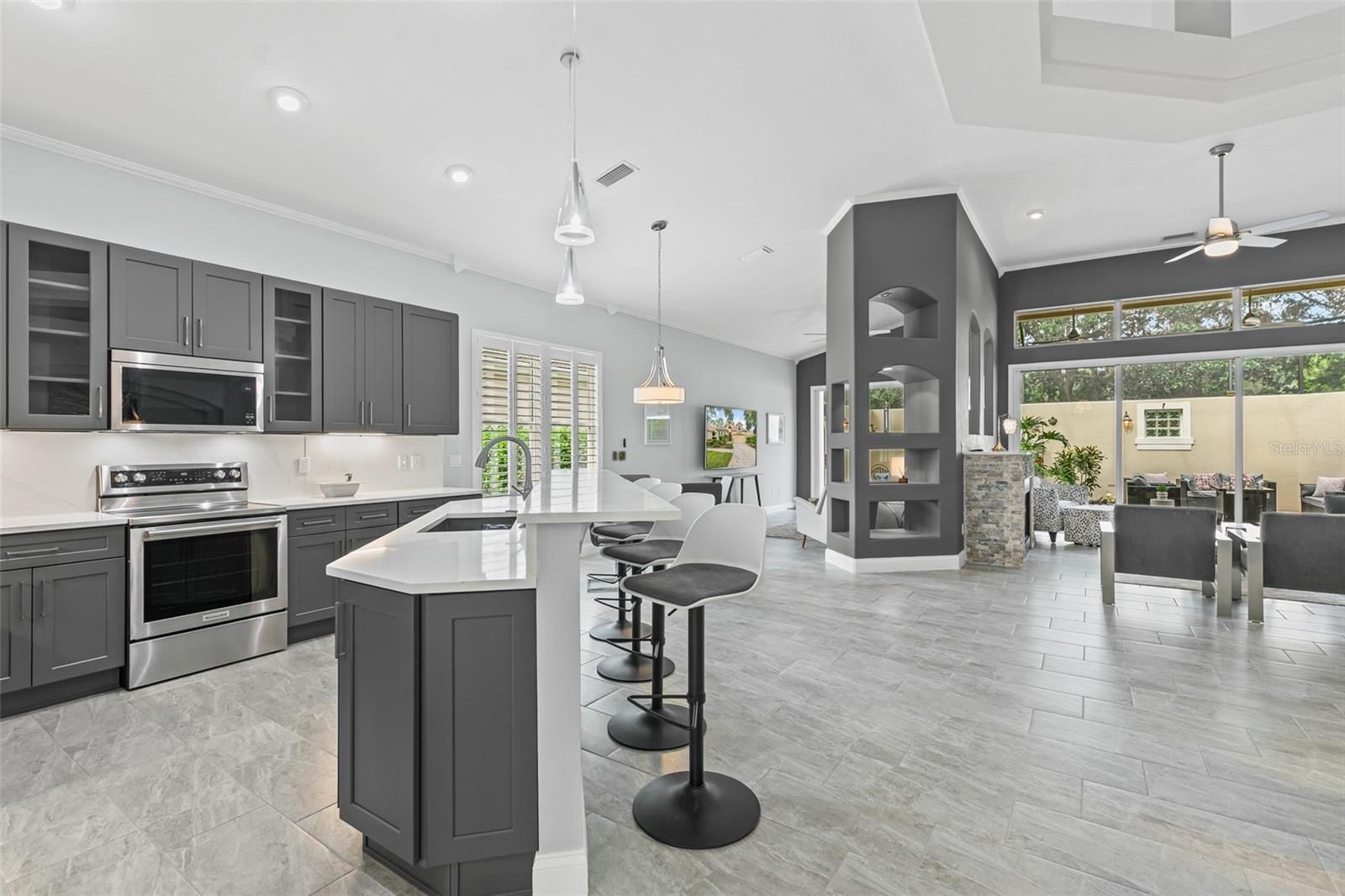 Looking for a fully renovated contemporary home in Grand Haven, this is it! This 3-bed 2-bath Mediterranean-style home with 2093 sq ft in pristine condition showcases a range of modern upgrades and timeless elegance for both comfort and style. Recent improvements in 2022 enhance the overall appeal and functionality of the home, ensuring a move-in-ready experience. The home features (2022) interior paint (walls, baseboards, doors, trim, and ceilings), sleek porcelain tile flooring throughout, upgraded light fixtures, chandeliers, and Hunter ceiling fans with remotes. The chef's kitchen is a showpiece, featuring a large island, quartz countertops and backsplash, shaker cabinetry, a quartz composite sink, new fixtures, and complemented by KitchenAid appliances (2024) electric stove, dishwasher, and microwave. LG refrigerator 2021. The living area centers around an attractive stone gas fireplace with a Quartz mantel-top. Both bathrooms(2022)boast new vanities, mirrors, fixtures, and toilets. The 3rd bedroom with French Doors was used as an office. The primary bedroom closet is enhanced with California Closets (2023). Additional updates include April (2022) Hot water heater, polyaspartic flooring in the garage, and lanai. The garage is also outfitted with California Closets cabinetry (2024). The a/c (2024) is a Trane high efficiency with a variable speed inverter and smart WIFI thermostat and also 2024 exterior freshly painted and pressure-washed. 2025 10-year transferable termite bond. $106 Monthly Lawn maintenance. Grand Haven offers world class amenties, including community pools, tennis, fitness center, dining, and an 18-hole Jack Nicklaus Signature golf course with clubhouse, pro shop, and restaurant. Membership is optional.