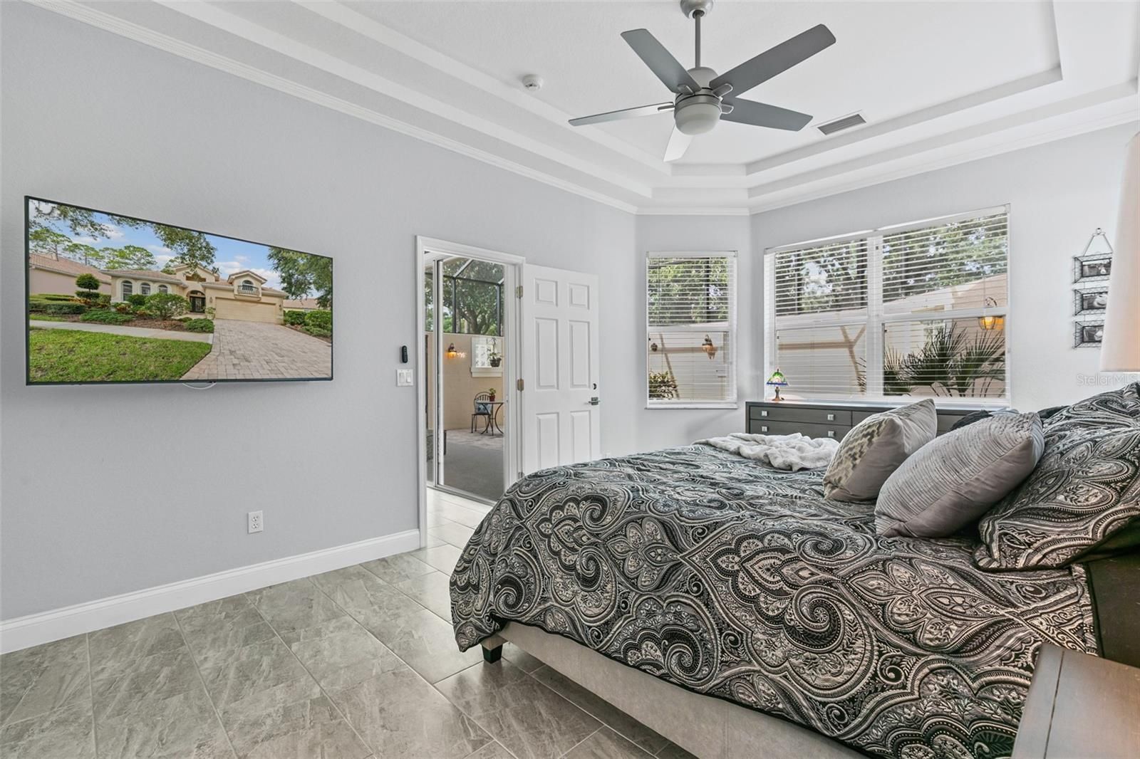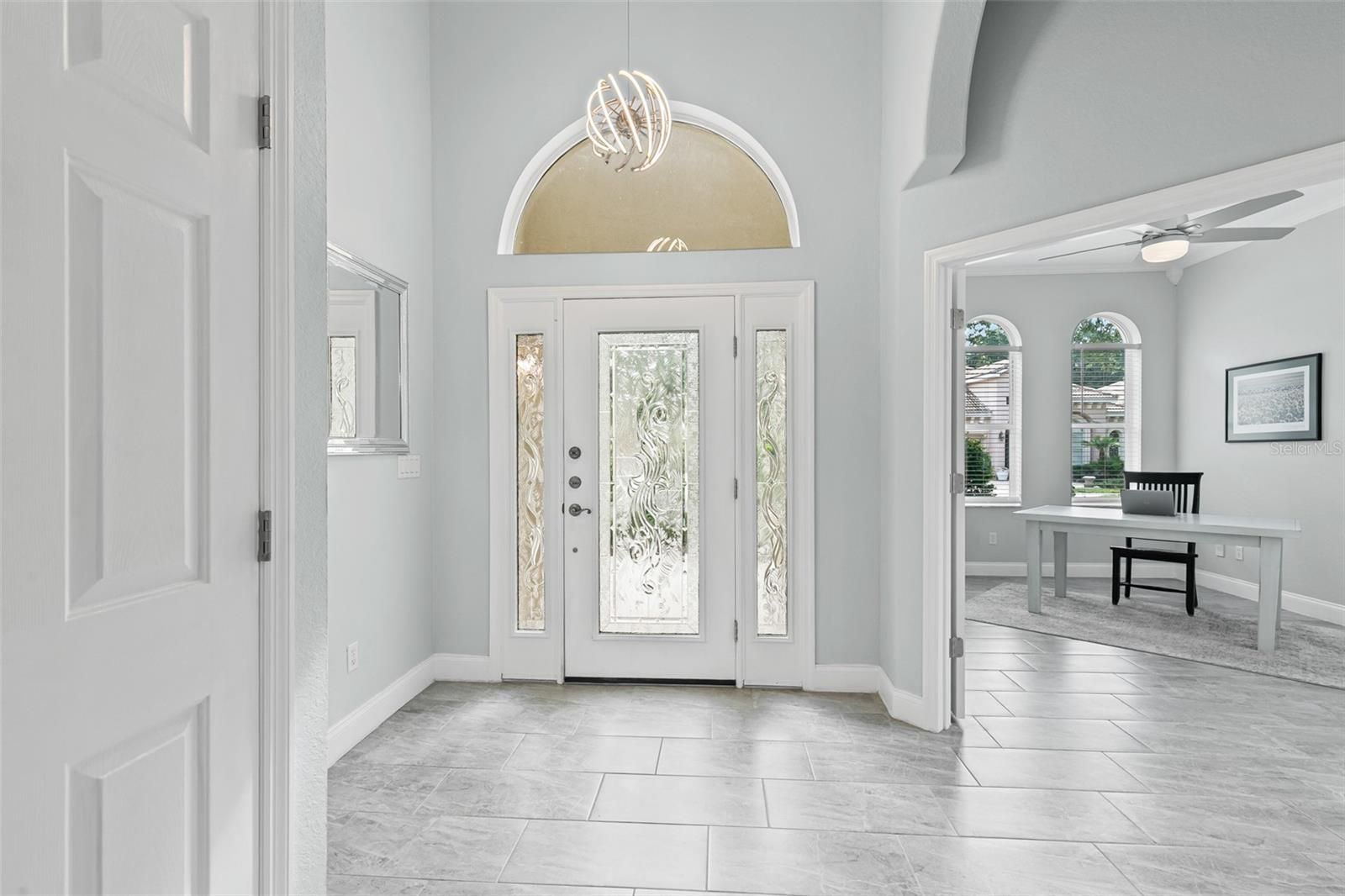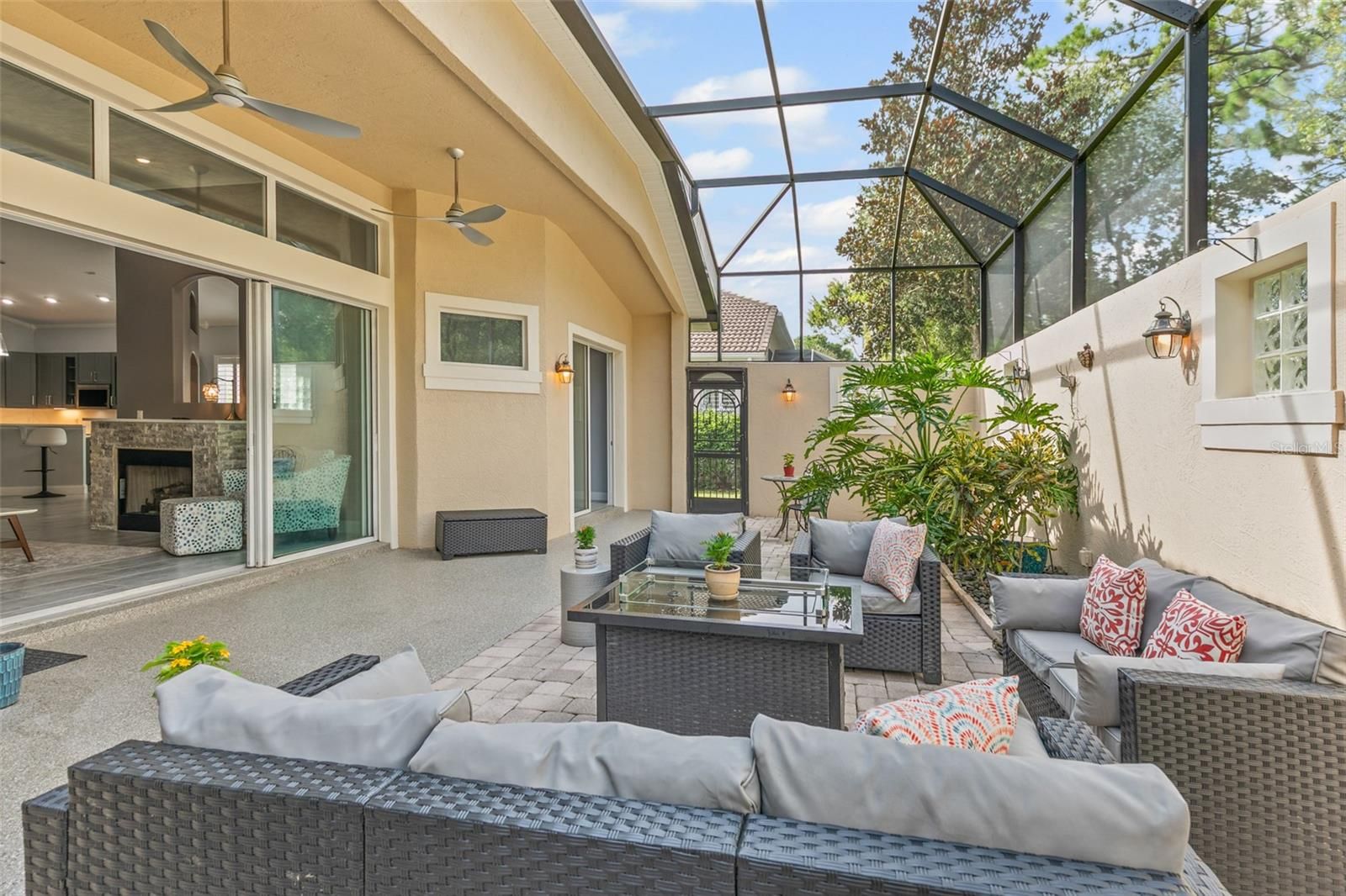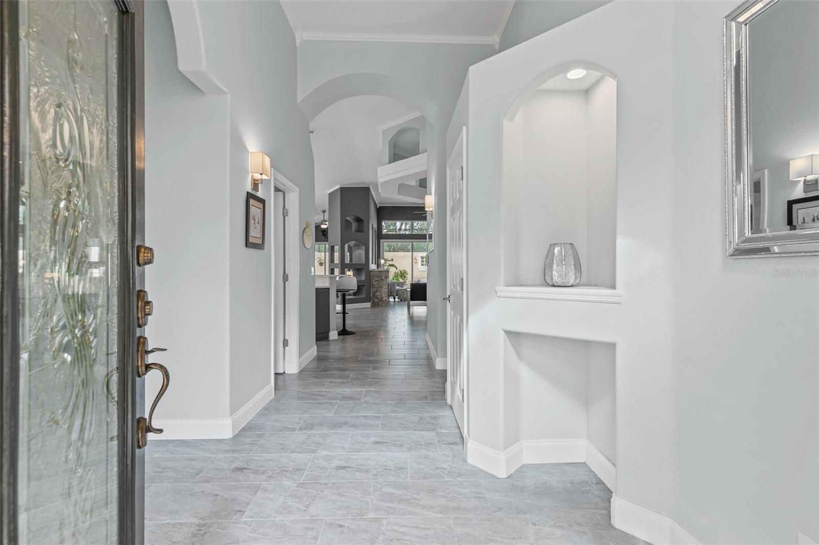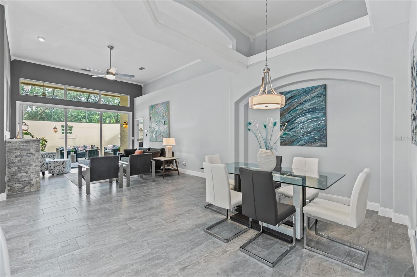 Looking for a fully renovated contemporary home in Grand Haven, this is it! This 3-bed 2-bath Mediterranean-style home with 2093 sq ft in pristine condition showcases a range of modern upgrades and timeless elegance for both comfort and style. Recent improvements in 2022 enhance the overall appeal and functionality of the home, ensuring a move-in-ready experience. The home features (2022) interior paint (walls, baseboards, doors, trim, and ceilings), sleek porcelain tile flooring throughout, upgraded light fixtures, chandeliers, and Hunter ceiling fans with remotes. The chef's kitchen is a showpiece, featuring a large island, quartz countertops and backsplash, shaker cabinetry, a quartz composite sink, new fixtures, and complemented by KitchenAid appliances (2024) electric stove, dishwasher, and microwave. LG refrigerator 2021. The living area centers around an attractive stone gas fireplace with a Quartz mantel-top. Both bathrooms(2022)boast new vanities, mirrors, fixtures, and toilets. The 3rd bedroom with French Doors was used as an office. The primary bedroom closet is enhanced with California Closets (2023). Additional updates include April (2022) Hot water heater, polyaspartic flooring in the garage, and lanai. The garage is also outfitted with California Closets cabinetry (2024). The a/c (2024) is a Trane high efficiency with a variable speed inverter and smart WIFI thermostat and also 2024 exterior freshly painted and pressure-washed. 2025 10-year transferable termite bond. $106 Monthly Lawn maintenance. Grand Haven offers world class amenties, including community pools, tennis, fitness center, dining, and an 18-hole Jack Nicklaus Signature golf course with clubhouse, pro shop, and restaurant. Membership is optional.