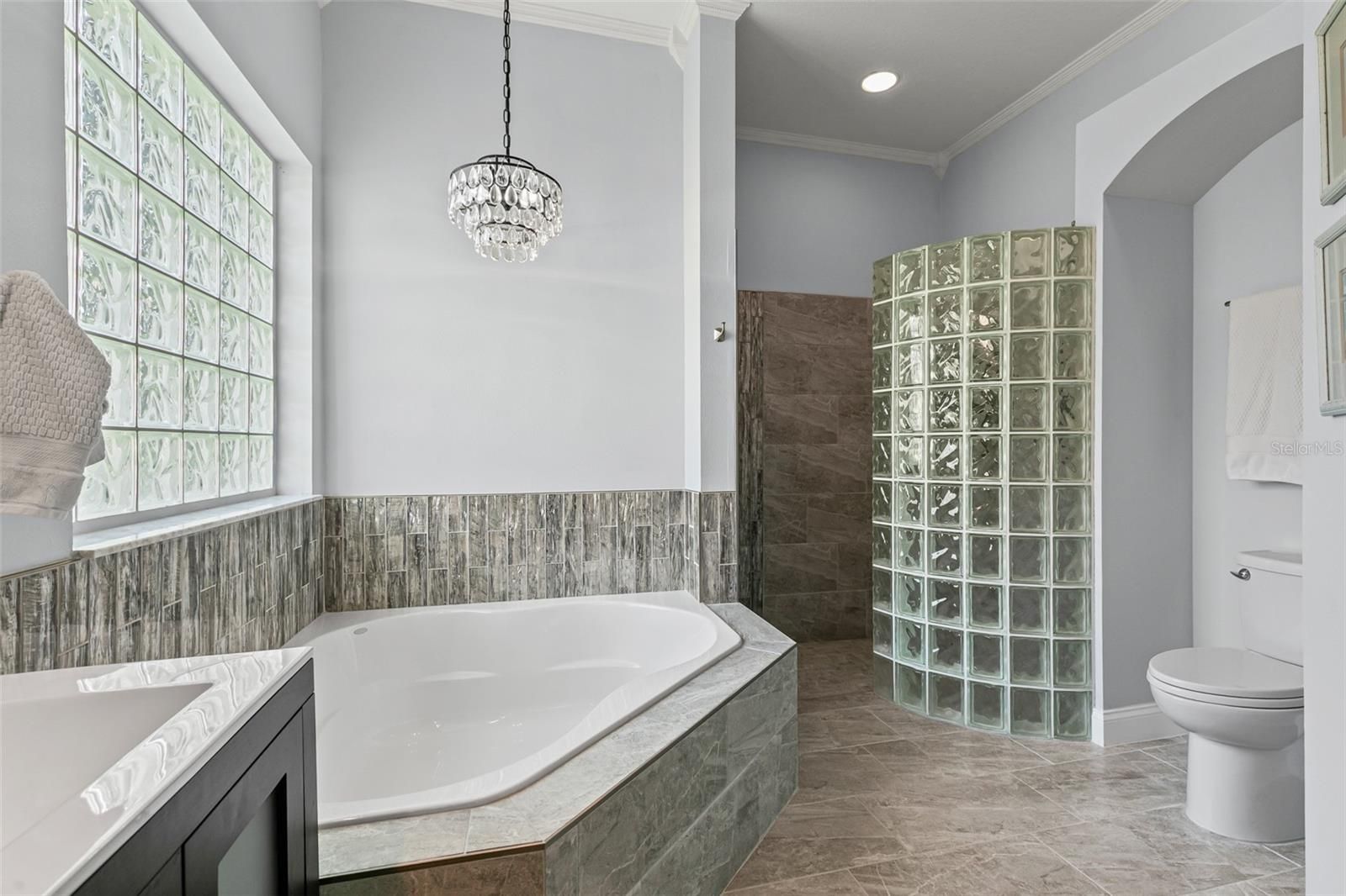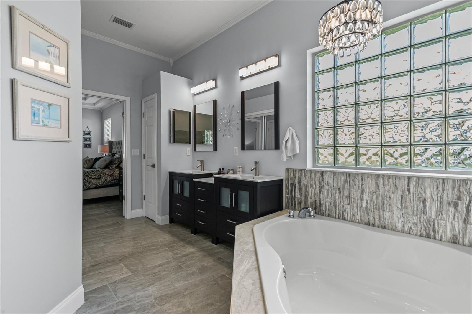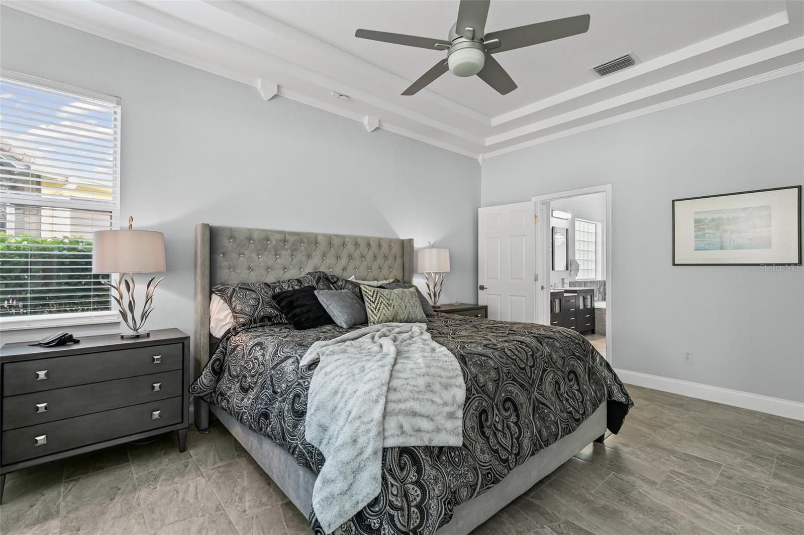 - Ceiling Fan(s), Crown Molding, High Ceilings, Main Level Primary, Solid Surface Counters, Vaulted Ceiling(s), Walk-In Closet(s), Window Treatments
