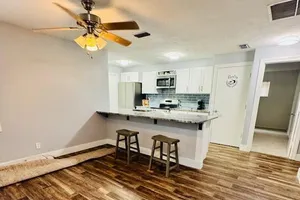 You won't believe this hidden gem! This home is completely remodeled! Concrete block building, corner lot, newer roof, newer AC and duct work. Brand new kitchen with granite counter tops, and new high-end appliances. New top of the line vinyl plank floors. Totally remodeled must see bathroom, with celebrity mirrors. Screen porch and a 2-car garage. Lovely lot full of trees and huge patio, perfect for pets. All with low fees. Miles of walking trails. Shopping and services 5 minutes away. Make this 55 plus property your own!