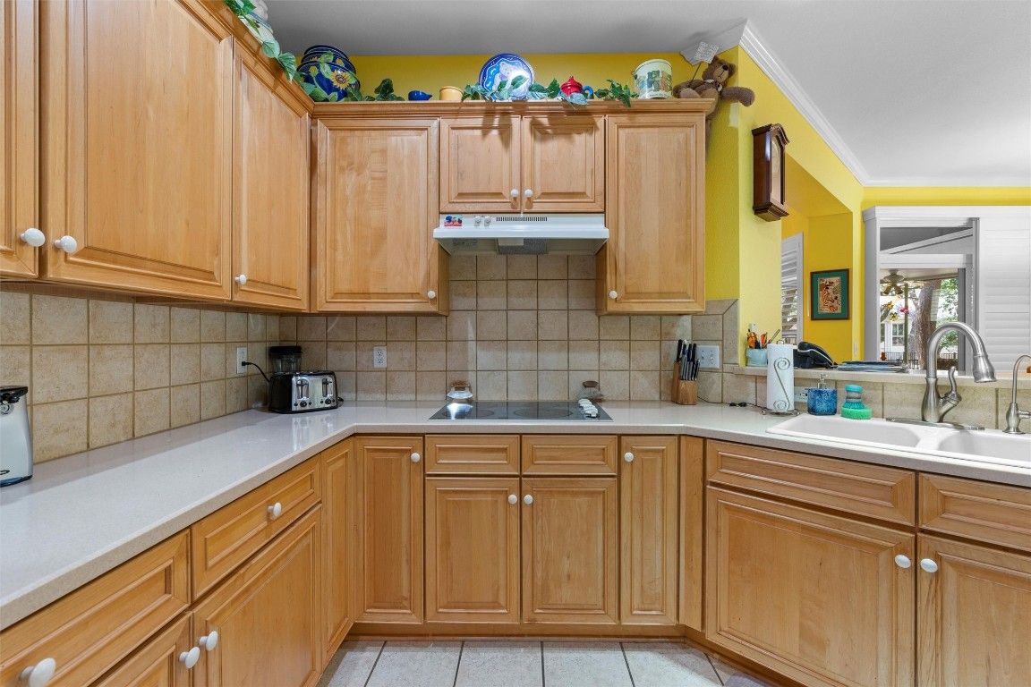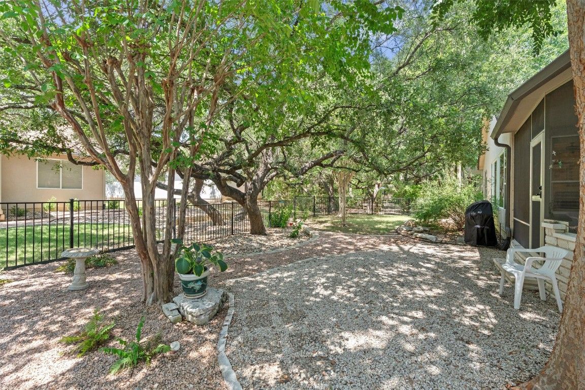 Perched beautifully on a wide, curved lot, this Sun City Texas Travis plan touts native trees and a jumbo Screened Porch, a perfect outdoor retreat. Located in remarkable Neighborhood 11, where the developer made heroic attempts to save every tree, the home is also minutes away from the Village Center jam-packed with activities and the convenience of neighborhood shopping. Immediately, you will notice the Golf Cart Garage adjacent to the oversized Two-Car Garage. What a perfect set-up in this golf cart-friendly environ. A front sitting porch welcomes you, and a sparkling glassed entry door invites you inside. Off the Foyer, a large Hobby Room can easily be a wonderful Office-at-Home complete with built-ins. A wall of windows in the space view the landscaped front yard and streetscape. Ahead from the Foyer, a Dining can be as Formal or Informal as you wish, as steps ahead a spacious Great Room also includes space for eating. Large plantation-shuttered windows wrap the sizable Great Room anchored by a cozy gas-log Fireplace. A Corian breakfast bar gently separates the Great Room from the Open Kitchen. There, some appliances have been updated to stainless-steel, while a double-door Pantry Closet will stow the goodies. Nearby, a well-placed Powder Room deems this plan ideal for Texas-sized entertaining. Two Guest Bedrooms flank a full Guest Bath at the "Guest Wing" of the home, while across the home, the Primary Bedroom is nicely secluded. A roomy en suite Primary Bath flaunts a soothing jetted tub and separate shower, while dual vanities and a generous Walk-In Closet complete the suite. Near the outsized Garages, the Laundry flaunts a soaking sink. Full-view glass doors at the Great Room open onto the humongous Screened Porch, a shady outdoor attraction viewing the woodsy fenced back yard that can be enjoyed year-around. Other notables are the reverse osmosis system and the solar venting in the attic, plus a roof replacement in 2020.