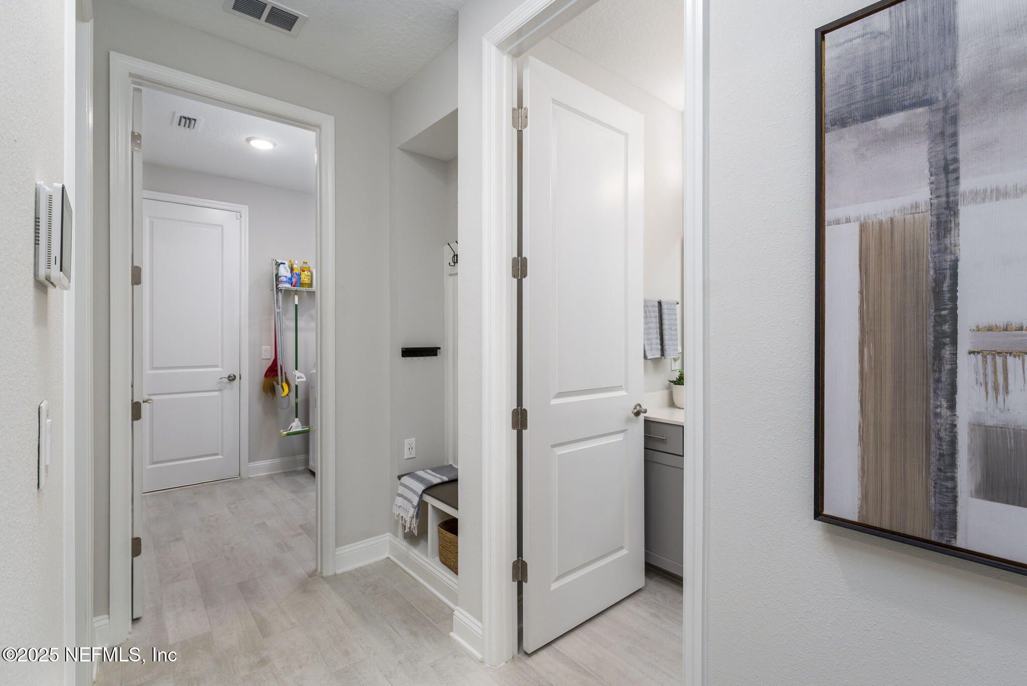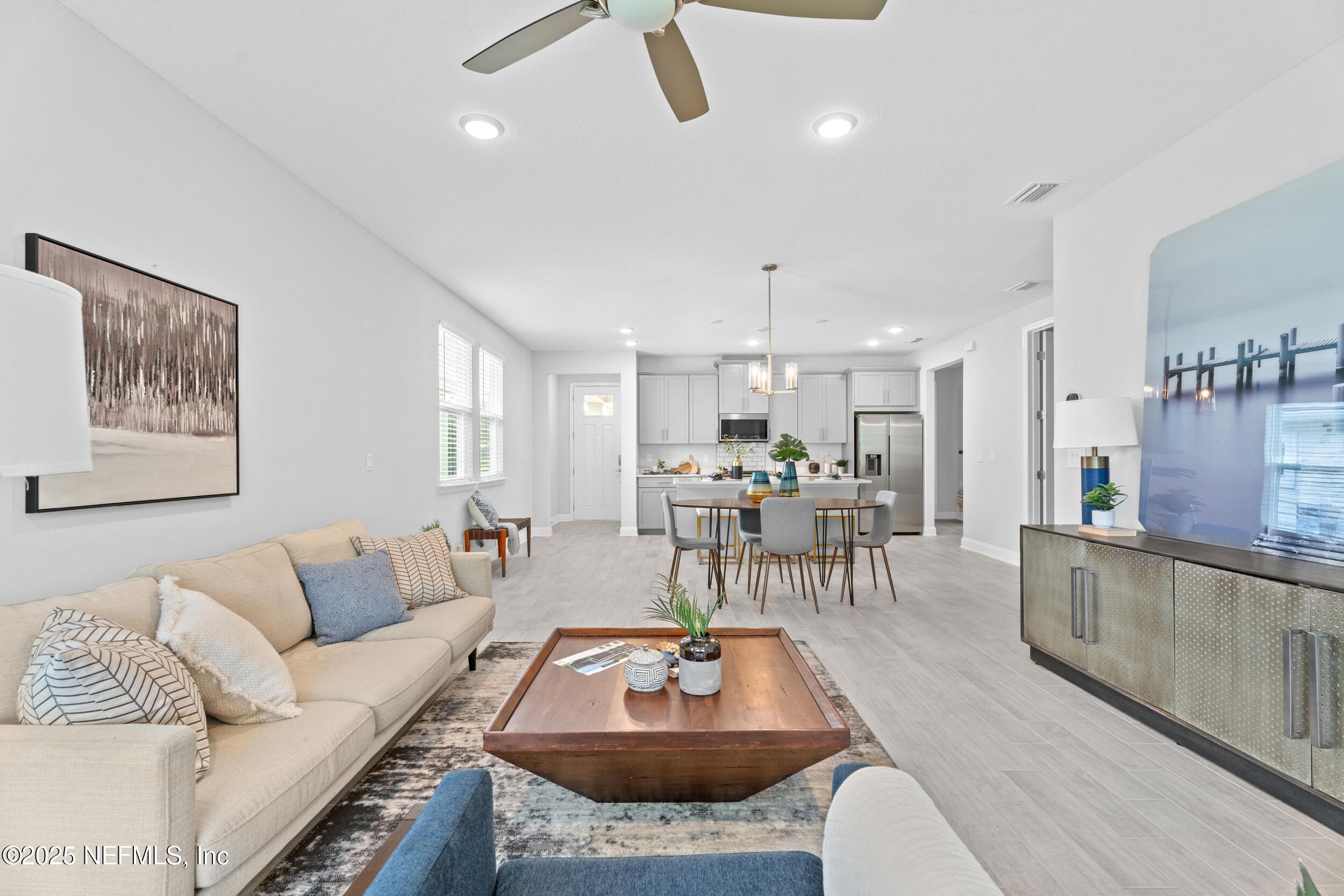 The best value in WaterSong and it is ready now. This Ocean Model villa delivers the low maintenance 55 plus lifestyle you came for, with the space and flow that makes 1,514 square feet feel surprisingly big. Offering 2 spacious bedrooms plus a versatile flex room, ideal for a home office, hobby space, or guest suite, this beautifully designed villa makes everyday living effortless. Wood look plank tile flooring runs through the main living areas, creating a warm, modern feel from the start. The kitchen is a standout with gray Shaker cabinetry, brushed nickel hardware, quartz countertops, stainless Whirlpool appliances, a gas range, and a generous island made for cooking, casual dining, and entertaining. The open concept great room connects seamlessly to a screened lanai with a gas bib and outlet ready for your grill, perfect for relaxed evenings outside. The extended backyard adds extra room for pets, gardening, or simply enjoying the outdoors. The primary suite feels like a private retreat with dual sinks, a zero entry shower, and a spacious walk in closet. A secondary bedroom, full bath, and flex room provide flexibility, while recessed lighting and a tankless water heater add comfort and efficiency. Enjoy true villa style living with exterior paint, roof, and landscaping maintained for you. WaterSong offers a private resort style pool, lap pool, outdoor spa, pickleball and bocce courts, a lake pavilion, and a lively biergarten, all supported by a full time lifestyle director. Plus, you will have access to RiverTown amenities including the RiverLodge with lazy river, kayak launch, fitness centers, scenic trails, multiple pools, and the riverfront café. Minutes to top rated medical care and major highways, this home pairs convenience with a lifestyle that feels like a daily upgrade.