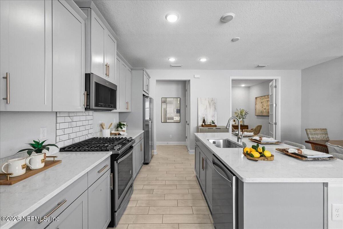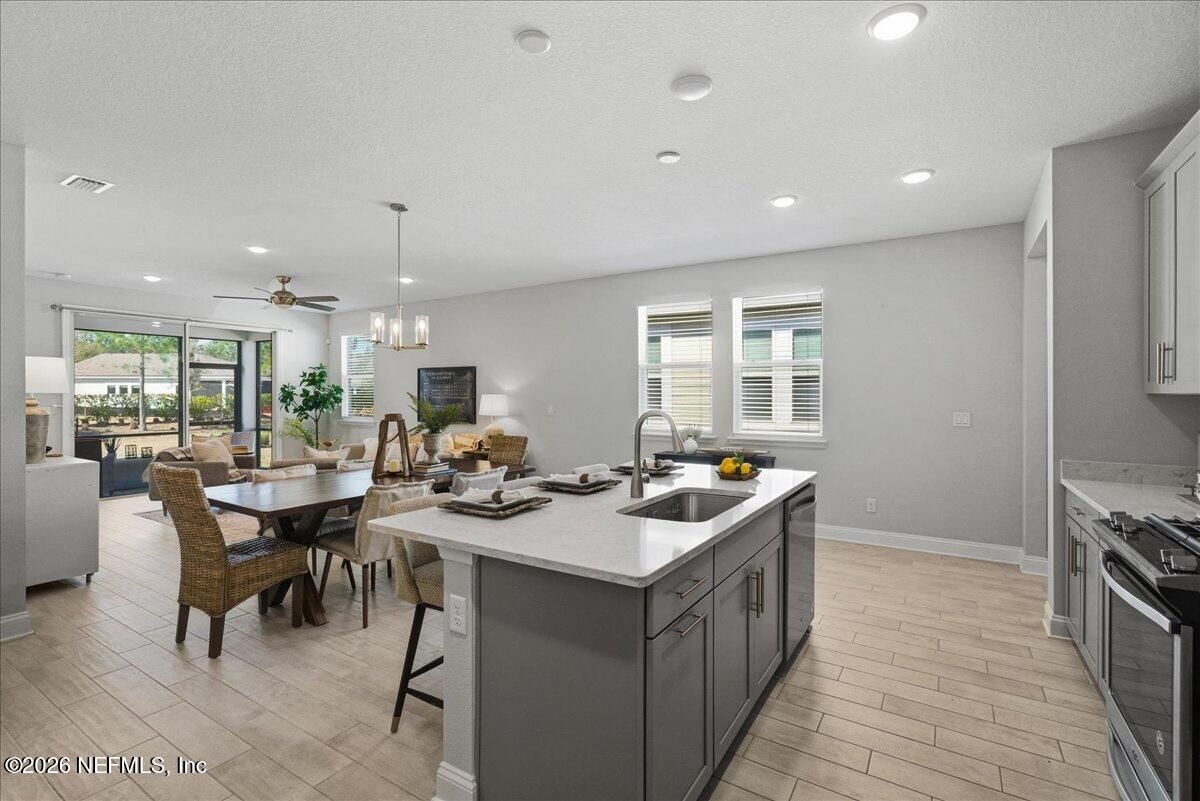 BEST VALUE IN WATERSONG! Tucked behind the gates of the sought-after 55+ WaterSong community in RiverTown, this beautifully designed Ocean Model Villa makes everyday living effortless. Offering 2 spacious bedrooms plus a versatile flex room, ideal for a home office, hobby space, or guest suite, this 1,514 sq ft residence lives far larger than its footprint suggests. Step inside and you'll immediately notice the attention to detail. Wood-look plank tile flooring flows seamlessly through the main living areas, setting a warm and modern tone. The kitchen is a true showpiece with sleek grey Shaker cabinetry, brushed nickel hardware, quartz countertops, stainless steel Whirlpool appliances, a gas range, and a generous island perfect for cooking, casual dining, or entertaining friends. The open-concept great room invites easy gatherings and connects to a screened lanai with a gas bib and outlet ready for your grill and relaxed evenings under the stars. The extended backyard offers space for pets, gardening, or simply enjoying the outdoors. The primary suite is your private retreat with dual sinks, a zero-entry shower, and a spacious walk-in closet. An additional bedroom, full bath, and flex room provide flexibility for guests or your favorite projects. Thoughtful details like recessed lighting and a tankless water heater add comfort and efficiency. Enjoy all the perks of villa-style living, with exterior paint, roof, and landscaping maintained for you. WaterSong isn't just a neighborhood, it's a vibrant, active-living community. Residents enjoy access to a private resort-style pool, lap pool, outdoor spa, pickleball and bocce courts, a lake pavilion, and a lively biergarten all supported by a full-time lifestyle director keeping the social calendar full. Plus, you'll have access to RiverTown's impressive amenities, including the new RiverLodge with lazy river, kayak launch, fitness centers, scenic trails, multiple pools, and the riverfront café. Best of all, you're just minutes from top-rated hospitals, exceptional medical facilities, and major highways, offering peace of mind, convenience, and connection to everything Northeast Florida has to offer.