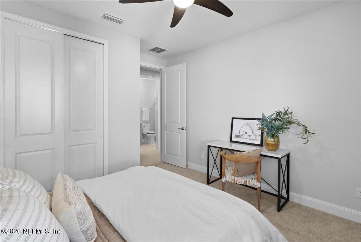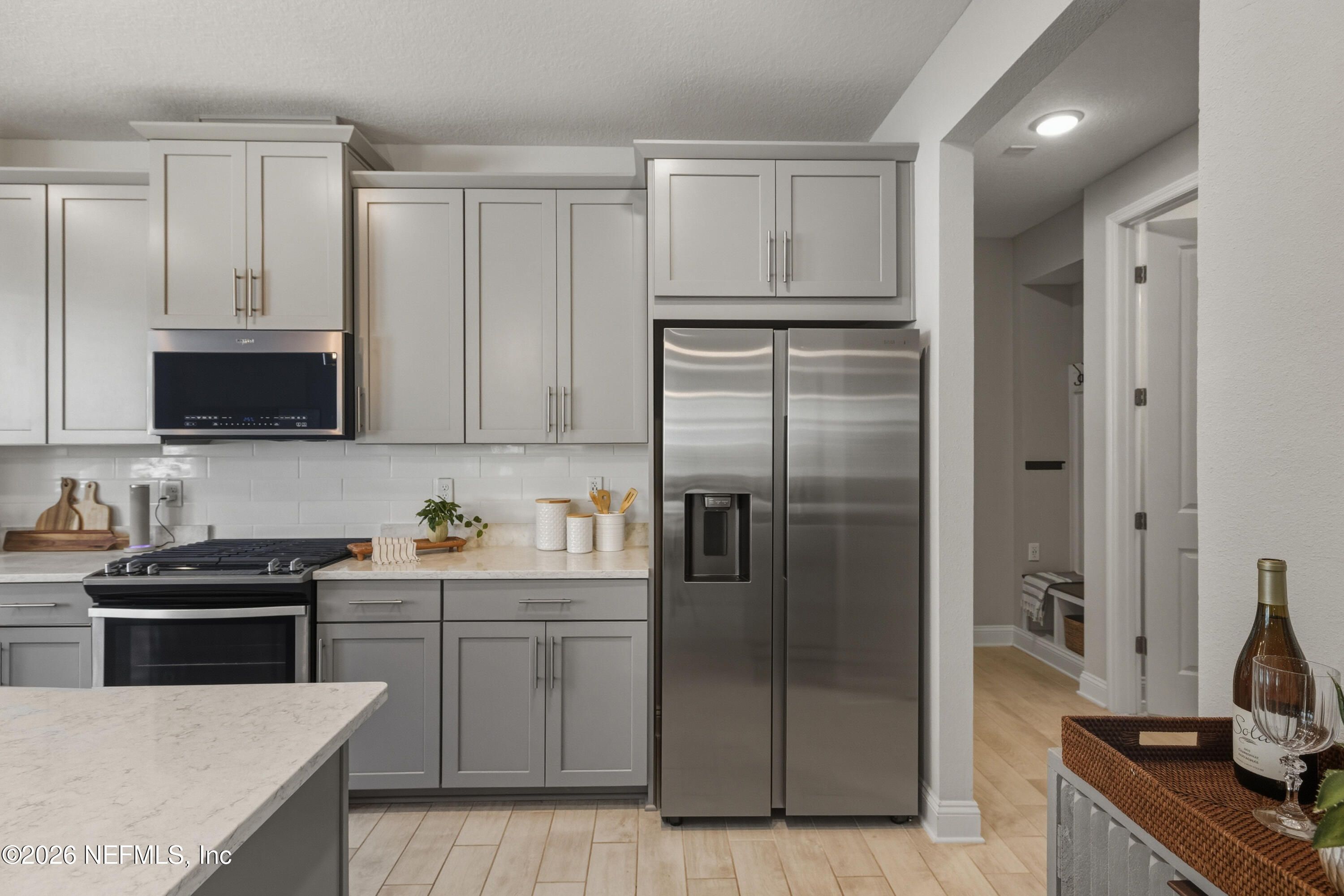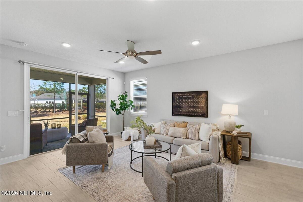 Tucked behind the gates of the highly sought-after 55+ community of WaterSong at RiverTown, this beautifully designed Ocean Model Villa invites you into a lifestyle where comfort, connection, and simplicity come together effortlessly. With 2 spacious bedrooms plus a versatile flex room, this 1,514 square foot home lives much larger than its footprint, offering the flexibility for a home office, hobby room, or welcoming guest space. Step inside and the home immediately sets a warm, coastal tone. Wood-look plank tile flooring flows throughout the main living areas, guiding you into a stunning kitchen designed to be the heart of the home. Here, sleek soft grey Shaker cabinetry pairs beautifully with quartz countertops and a classic white subway tile backsplash, while stainless steel Whirlpool appliances and a gas range make cooking a pleasure. A generous dining island, illuminated by elegant glass pendant lighting, becomes the perfect gathering place for morning coffee, casual meals, or evenings spent entertaining friends and neighbors. The open-concept great room creates a natural flow for everyday living and relaxed gatherings, extending seamlessly to a screened lanai where a gas bib and outlet are already in place for grilling under the stars. Beyond, the extended backyard provides just enough space to garden, let pets roam, or simply enjoy the Florida sunshine and peaceful surroundings. At the end of the day, the primary suite offers a private retreat designed for comfort and ease, featuring dual vanities, a spacious walk-in closet, and a zero-entry shower. A secondary bedroom, full bath, and the flexible bonus room allow the home to adapt beautifully to visiting guests or your favorite creative pursuits. Thoughtful touches such as recessed lighting and a tankless water heater add efficiency and modern convenience throughout. Life here is designed to be effortless. As part of the villa collection, exterior paint, roof, and landscaping are maintained for you, giving you more time to enjoy the lifestyle that makes WaterSong so special. Within the gates, residents enjoy a vibrant active-adult community with a private resort-style pool, lap pool, outdoor spa, pickleball and bocce courts, a scenic lake pavilion, and a lively biergarten, all supported by a full-time lifestyle director who keeps the social calendar full. And just beyond the community, the award-winning amenities of RiverTown await, including the spectacular RiverLodge with its lazy river, kayak launch, fitness centers, scenic riverfront trails, multiple pools, and a waterfront café. All of this is just minutes from top-rated hospitals, exceptional medical care, and major highways, offering both convenience and peace of mind while keeping you connected to everything Northeast Florida has to offer.