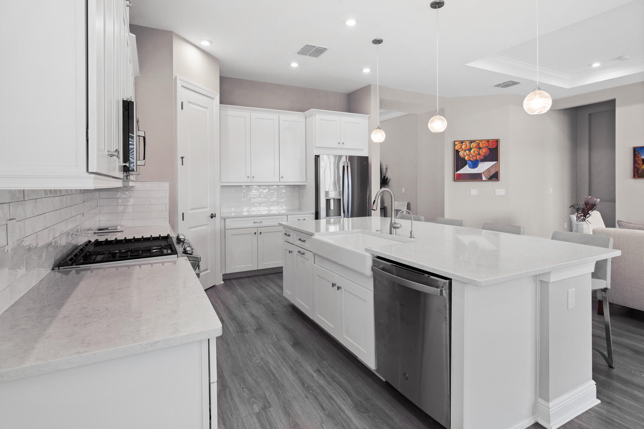 Live the resort lifestyle in Esplanade at Tradition with this spectacular Franese model showcasing $120K + in builder installed upgrades. Featuring 3 bedrooms plus flex room, 3.5 baths, open floor plan, gourmet kitchen with quartz countertops, GE Profile appliances with gas range, laminate flooring, crown molding in tray ceilings, hi-hat lighting, modern fixtures, window coverings and bay window in primary suite. Pocketing sliders with power shades lead to an extended covered lanai with an expanded screen enclosure, pre-wired for pool and plumbed for outdoor kitchen. Added highlights: 4-ft garage extension, glass front door, dimmers and extensive landscaping. Community amenities include a resort clubhouse with pool, cafe', gym, spa event and card rooms, kitchen, outdoor BBQ and more.