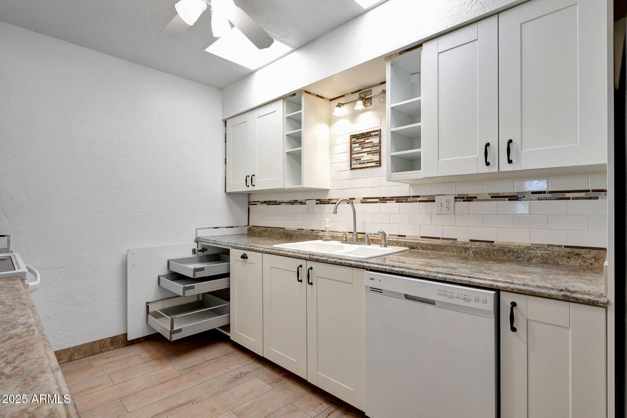 Welcome to this charming and newly refreshed 2-bedroom, 2-bath home in the heart of Sun City. With brand-new interior paint, an open floorplan, and thoughtful updates throughout, this property offers the perfect blend of comfort and low-maintenance 55+ living. Step inside to a bright living space that flows effortlessly into the dining area and kitchen. The white kitchen cabinets add a clean, timeless look, and the refrigerator, washer, and dryer are all included for true move-in convenience. The spacious primary suite features a full master bath with a separate tub and shower, plus beautiful tile surrounds that give it a fresh, updated feel. The secondary bedroom is ideal for guests or a craft/office space, with the second full bath also showcasing upgraded tile showers. Outside, the low-maintenance yard and covered patio create the perfect setting for enjoying quiet mornings, sunset dinners, or the peaceful Sun City lifestyle. Enjoy Arizona living and take advantage of the convenient 1-car garage for parking and extra storage. With close proximity to golf, recreation centers, shopping, and dining, this home checks all the boxes for easy 55+ living. Fresh, clean, and ready for its next chapter this is one you won't want to miss!