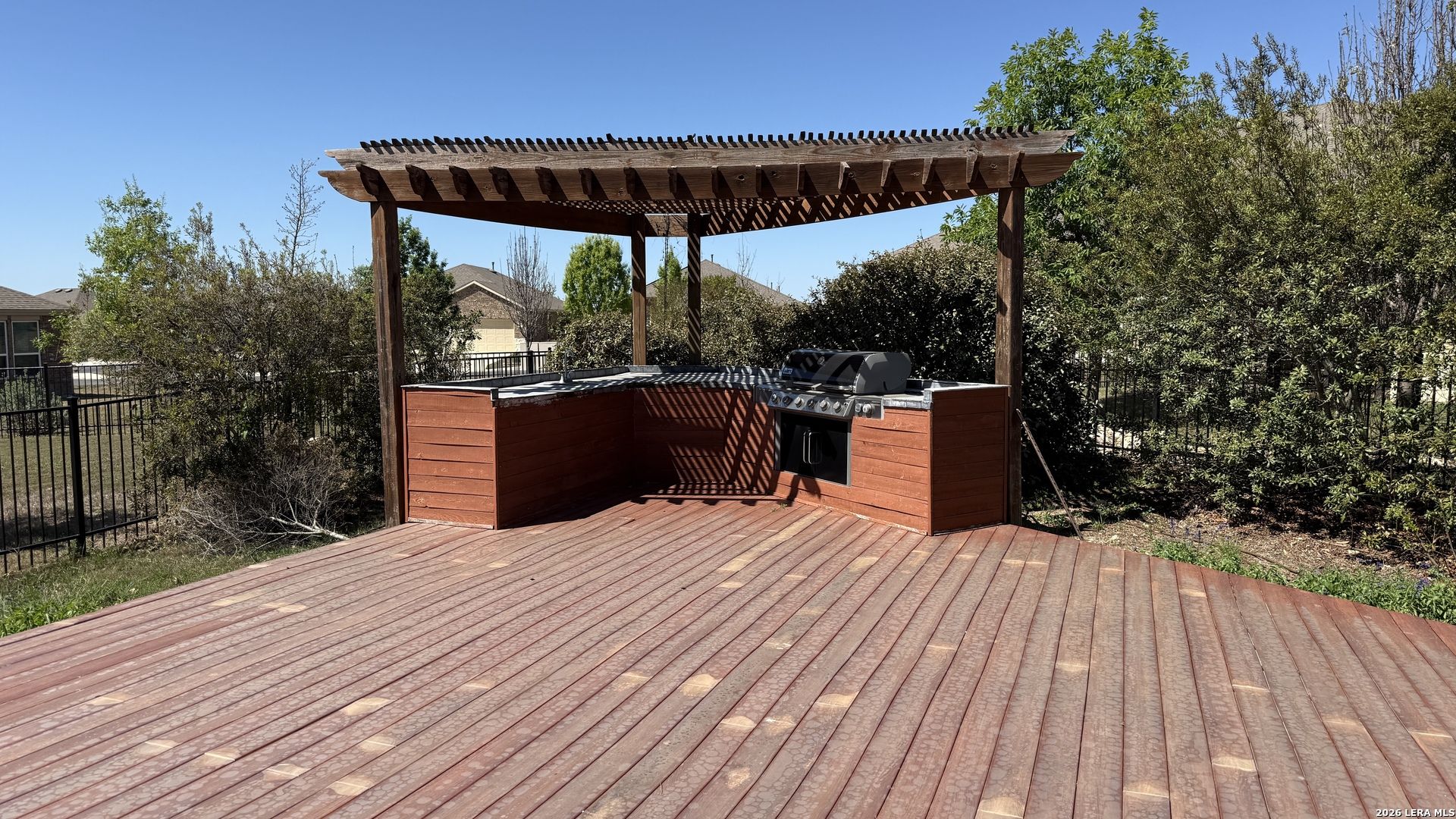 Gorgeous one-story home in the prestigious Del Webb 55+ community in Alamo Ranch! This beautifully maintained 3-bedroom, 2-bath residence features numerous upgrades throughout. Enjoy elegant wood flooring in the main living areas and study. The fully equipped kitchen is perfect for cooking and entertaining. Additional highlights include a water softener system, expansive sliding glass doors leading to the backyard, electric blinds, enlarged walk-in showers, and upgraded lighting with dimmers. Step outside to a fully equipped outdoor BBQ kitchen, seamlessly connected by a full wooden deck-perfect for entertaining and relaxing evenings. This move-in-ready home offers the perfect blend of comfort, style, and convenience, all on one level. Don't miss the opportunity to own this exceptional property!