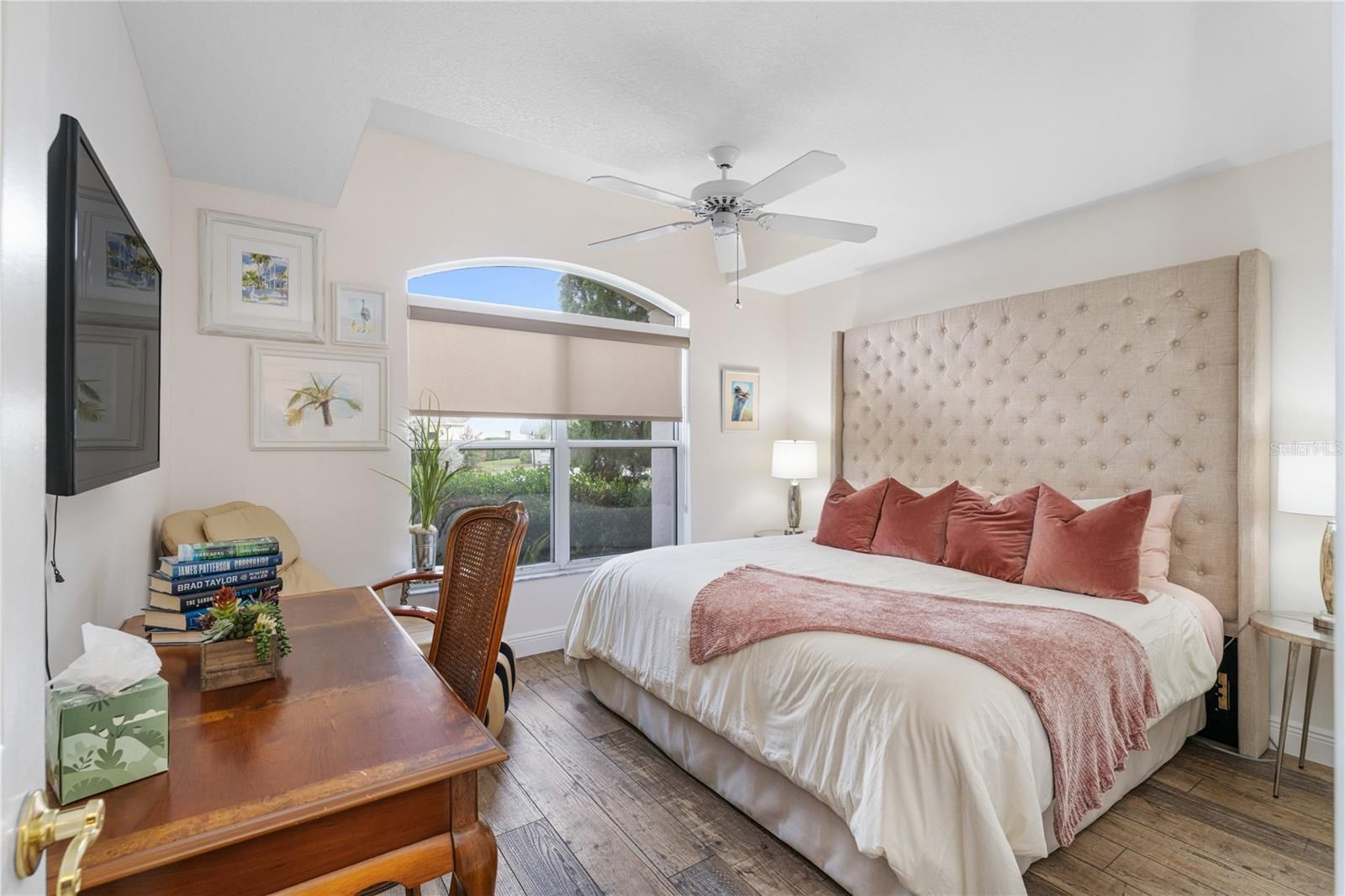 - Ceiling Fan(s), Eat-in Kitchen, High Ceilings, Living/Dining Room, Open Floorplan, Main Level Primary, Solid Surface Counters, Solid-Wood Cabinets, Walk-In Closet(s), Window Treatments