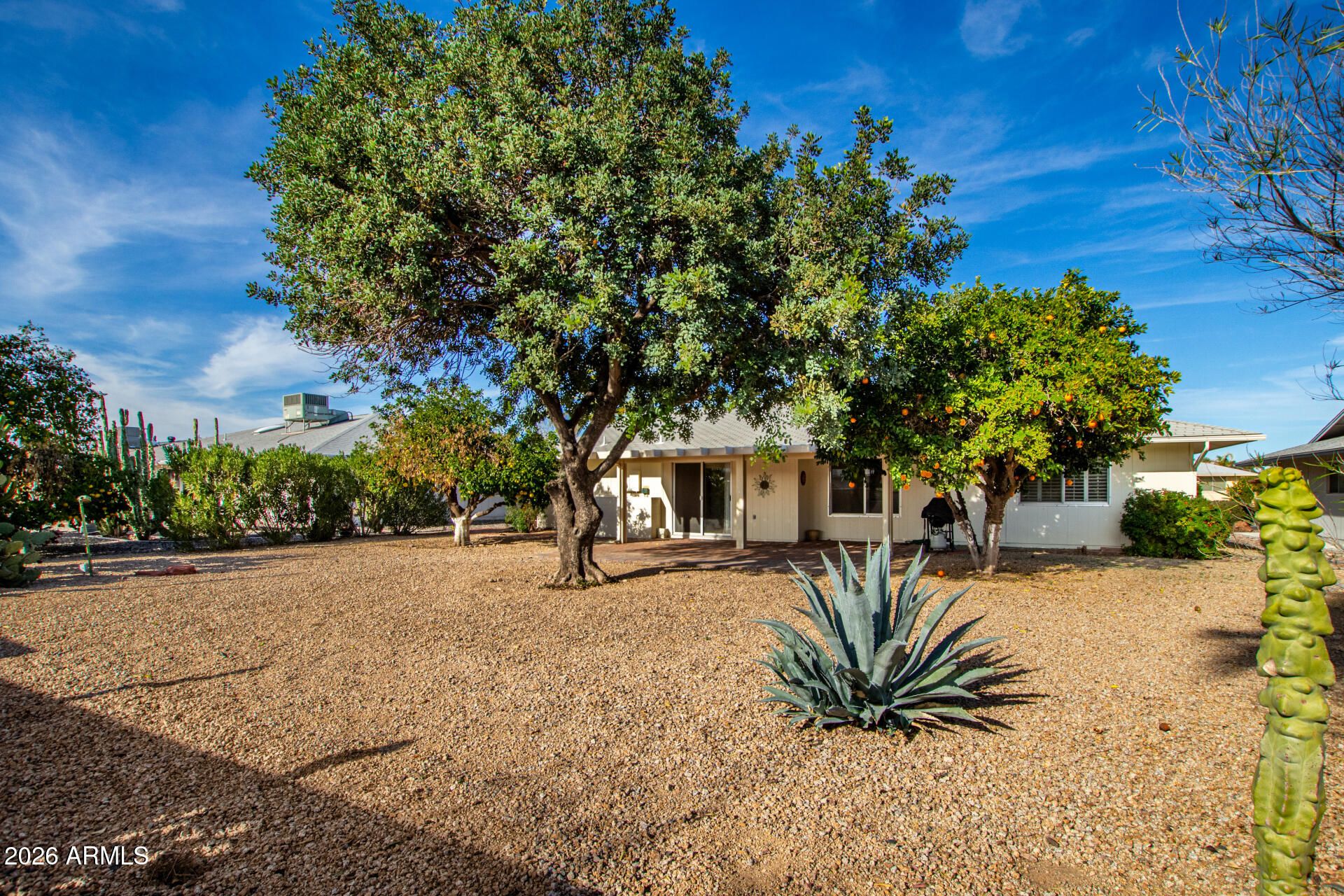 This gorgeous single-story home awaits you in the desirable Sun City West! The manicured landscape and 2-car garage with attached storage are just the beginning. Inside, you'll be charmed with sizable living areas displaying wood-look flooring, contemporary lighting, plantation shutters, and neutral paint that complements any decor style. The well-appointed kitchen is equipped with ample cabinetry, granite countertops, a pantry, and stainless steel appliances. Get a good night's rest in the main suite, offering a spacious closet and an ensuite bathroom. The den is a perfect flex room for an additional living space, craft space or whatever suits your needs. The backyard is complete with a covered patio with citrus trees, well-laid pavers and a relaxing landscape.