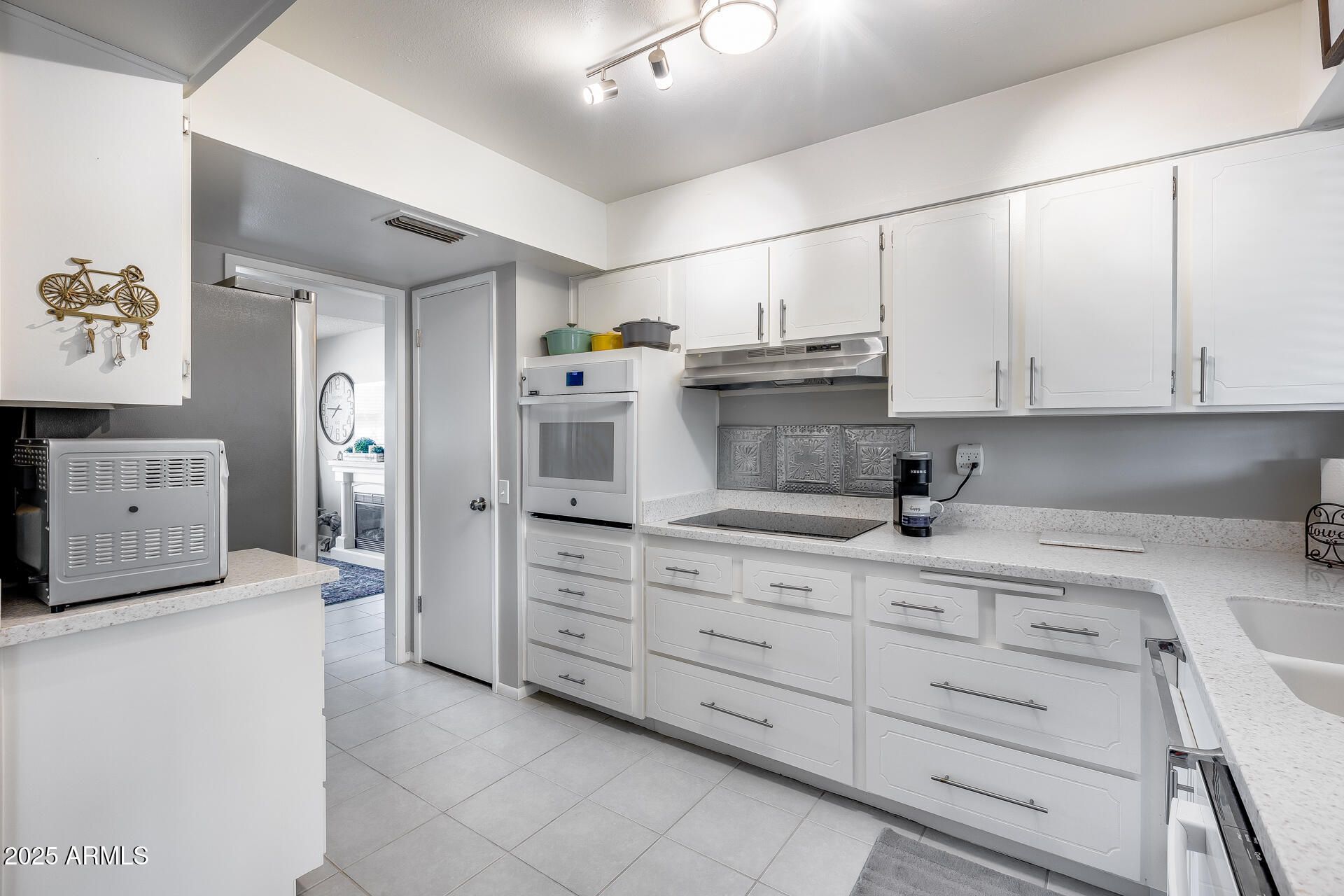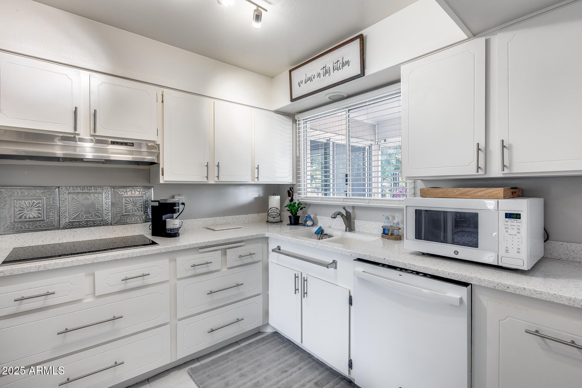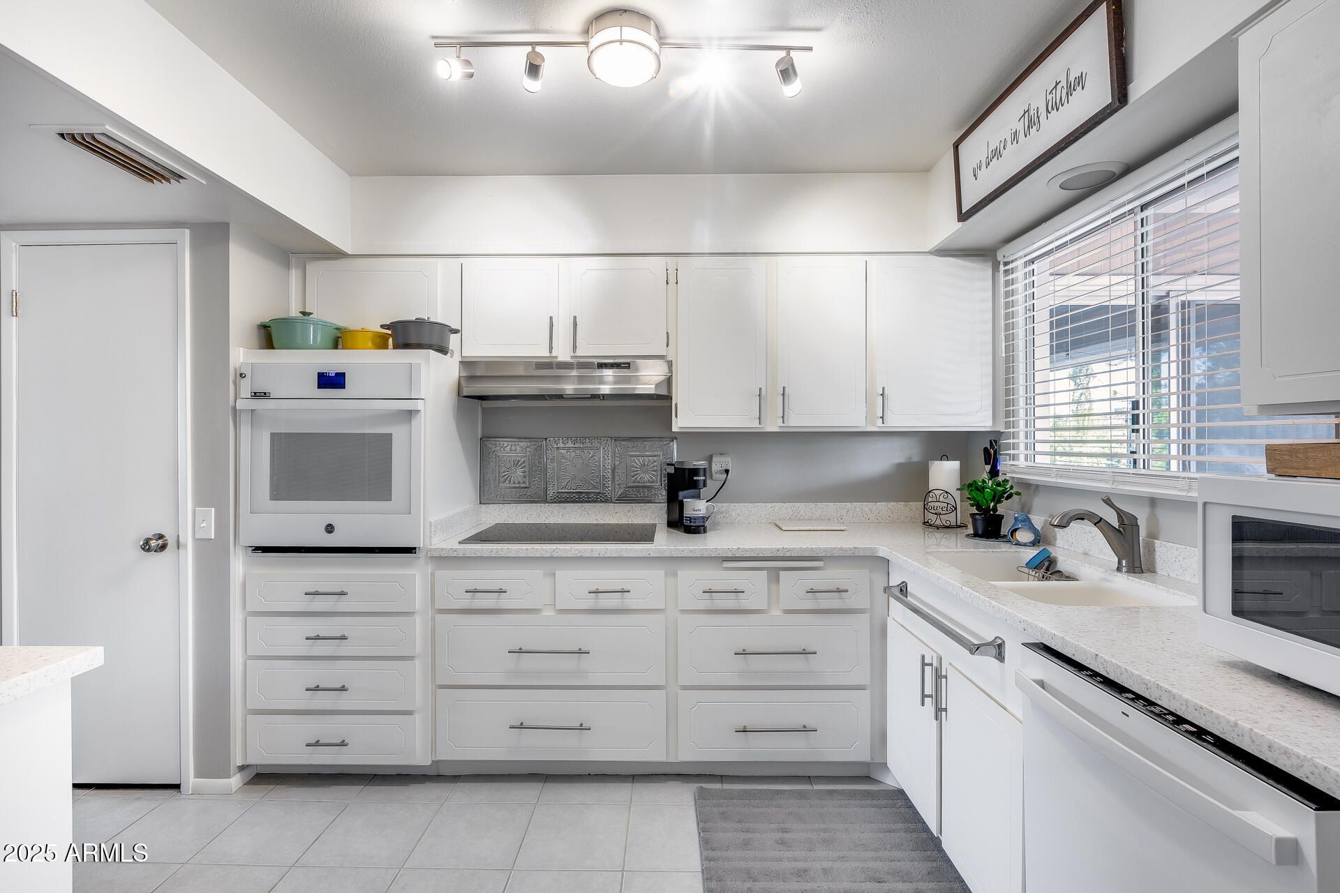 Welcome to this beautifully maintained and tastefully updated Sun City West home featuring fresh interior and exterior paint, a brand new AC system, and an inviting open layout perfect for comfortable living and entertaining. Step inside to find bright, welcoming living spaces with neutral tones, dual living areas, and upgraded finishes throughout. The gourmet kitchen is a true highlight, boasting sleek quartz countertops, ample cabinetry with modern hardware, built-in appliances, and plenty of storage — ideal for anyone who enjoys cooking and entertaining. The dining area flows seamlessly into the cozy Arizona room, providing the perfect transition between indoor and outdoor living. The spacious bedrooms offer comfort and style, while the bathrooms feature upgraded vanities, lighting, and finishes for a clean, modern look. The primary suite includes a dressing area with a built-in vanity and an updated walk-in shower. Step outside to your private backyard retreat a large covered patio surrounded by mature trees and desert landscaping for easy maintenance and year-round enjoyment. Perfect for morning coffee, evening gatherings, or simply relaxing under the Arizona sky. Additional upgrades include newer dual-pane windows, ceiling fans throughout, a two-car garage, and energy-efficient features. This home combines comfort, functionality, and style in one of Sun City West's most desirable locations close to golf courses, recreation centers, and shopping.