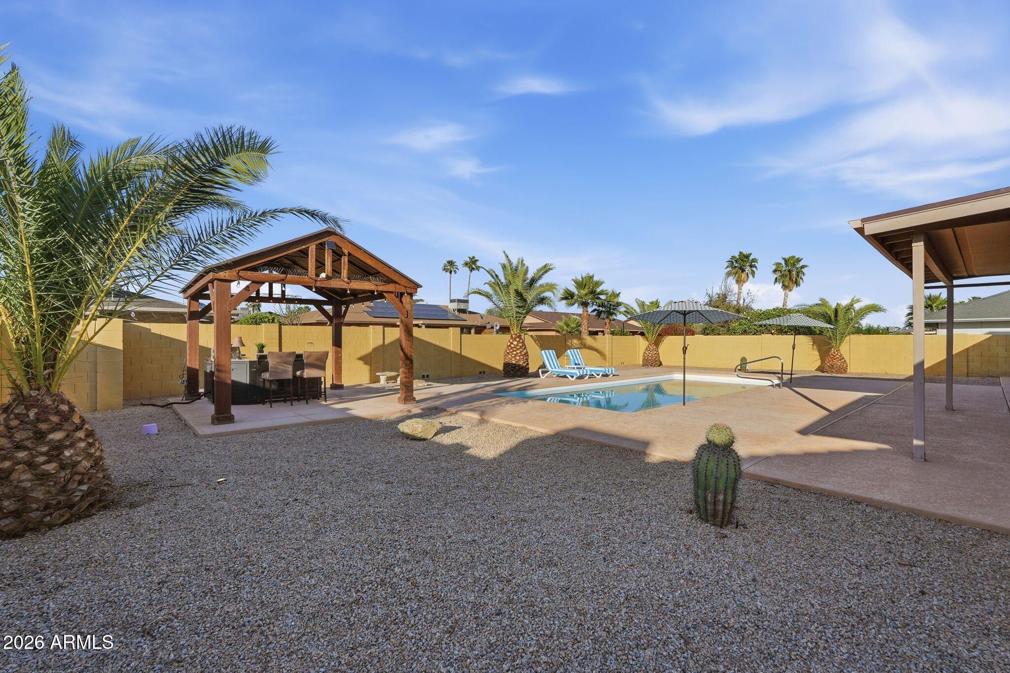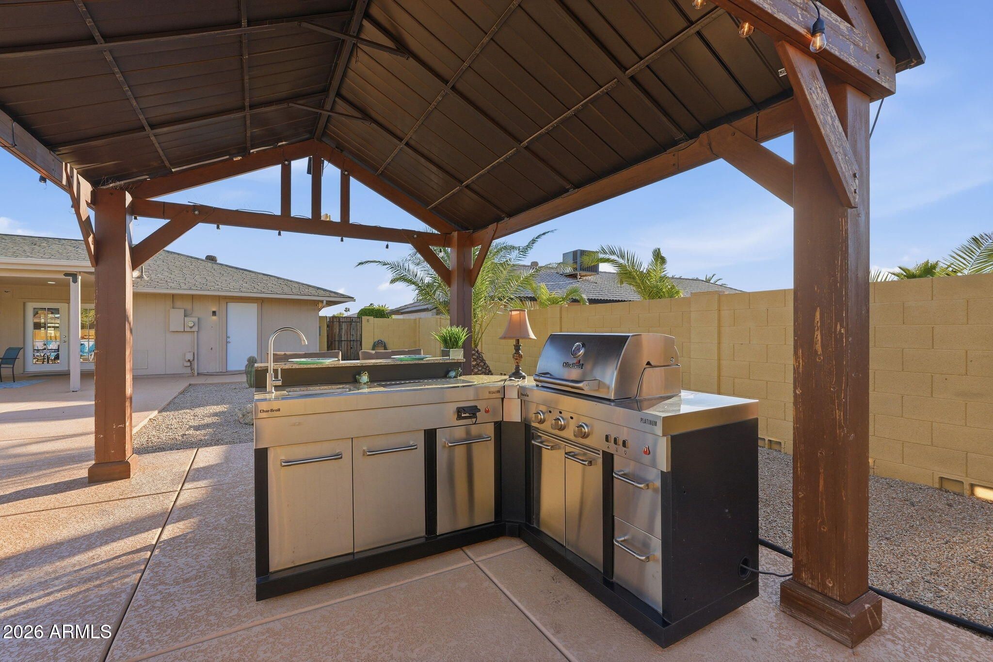 Great home with an amazing backyard! Heated, salt water pool (2019), huge patio, gazebo with a metal roof, landscape lighting, a Char-Broil Medallion outdoor kitchen & a 6' block wall. The interior features all-tile floors, dual pane windows, plantation shutters & plenty of natural lighting. The kitchen has recessed lighting, a smooth cooktop, breakfast bar, tons of cabinets & the stainless frig is included. Both bedrooms have walk-in closets & ceiling fans. Extra insulation has been added in the attic & the water heater has a recirculation pump. The extended depth garage has room for your golf cart! W&D are included. All furniture & TV's may also be included. Amazing community with 4 rec centers, 7 golf courses, gym, pickleball, tennis, racquetball, pool, bocce & many more activities!