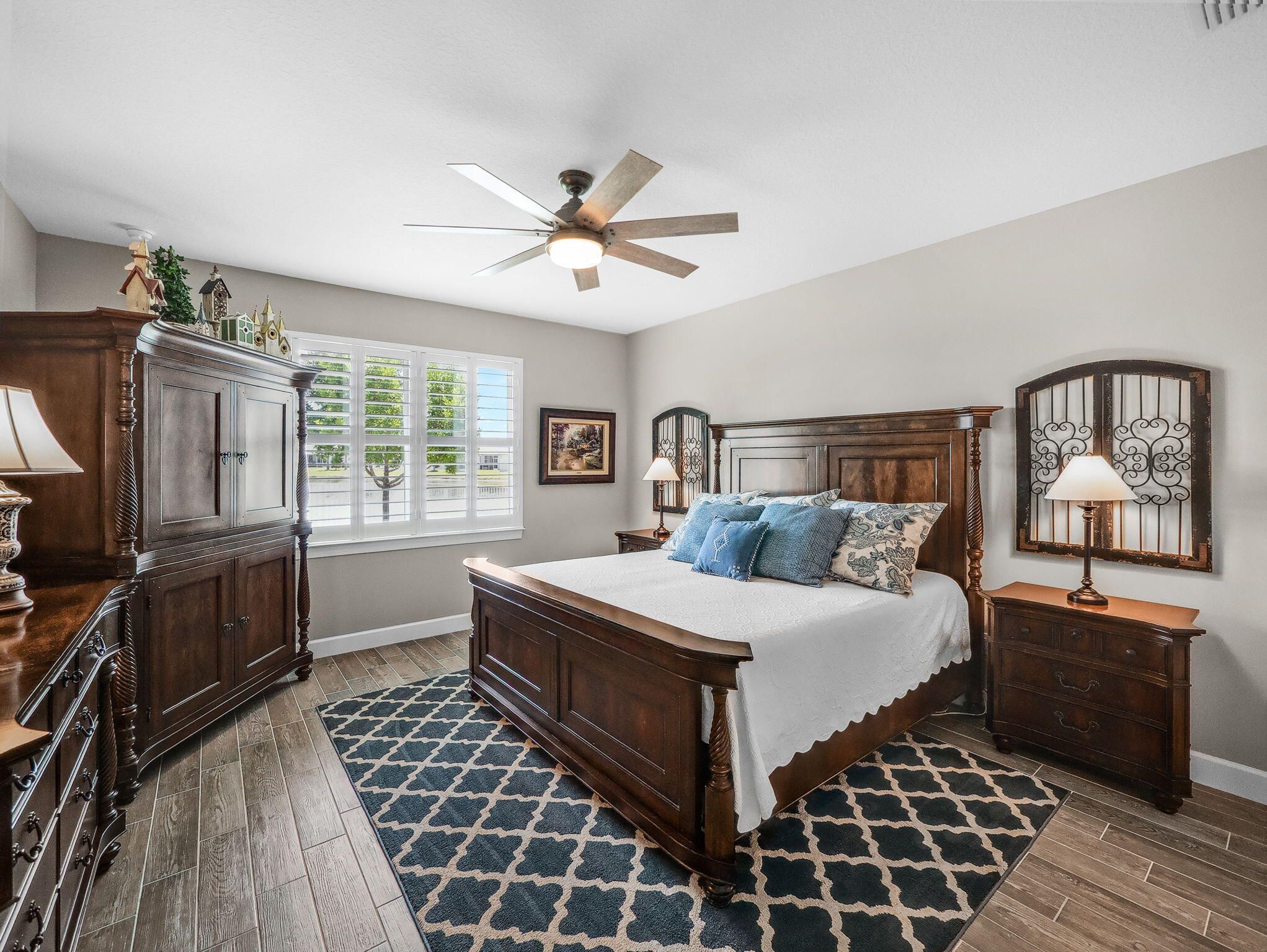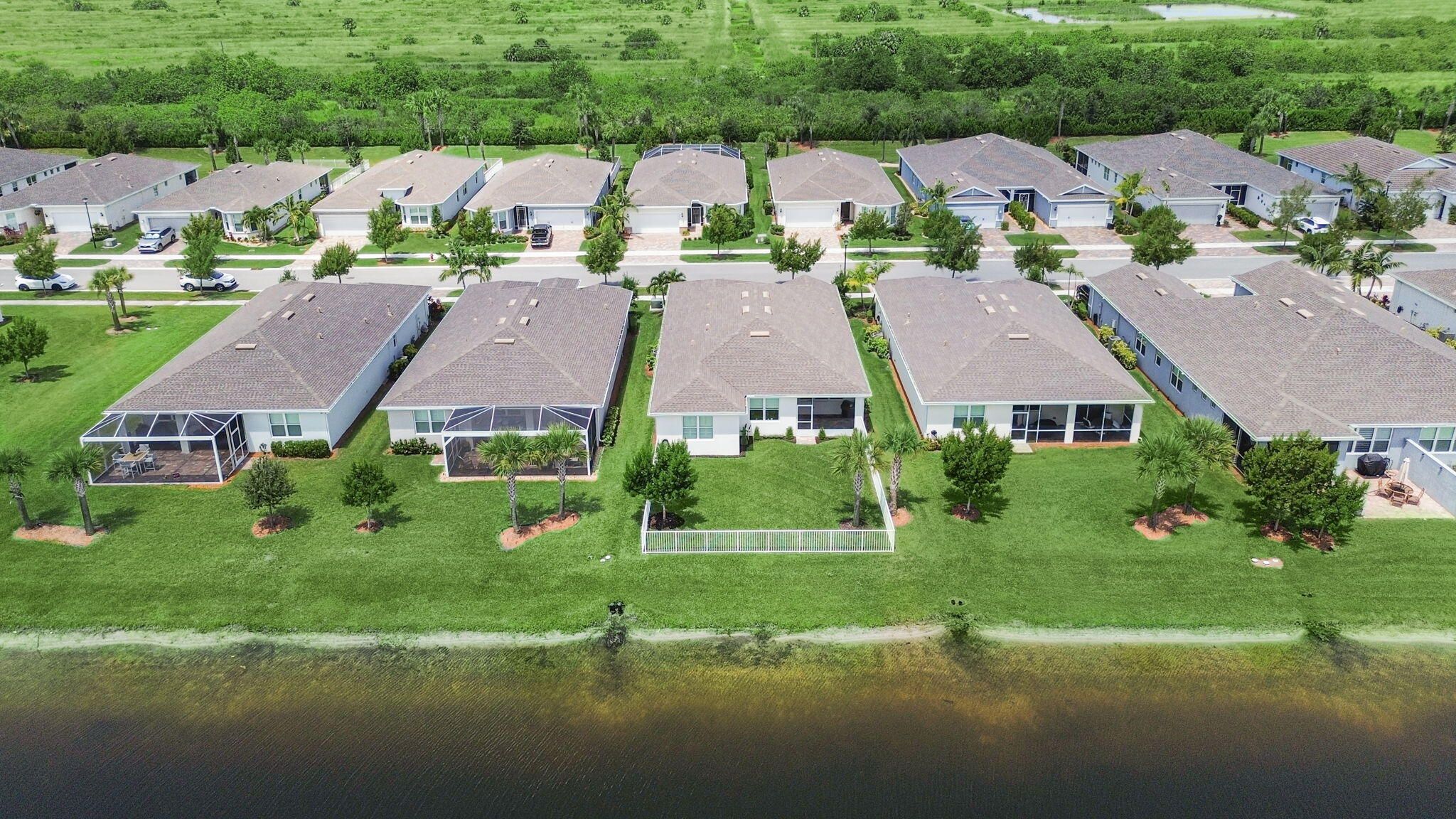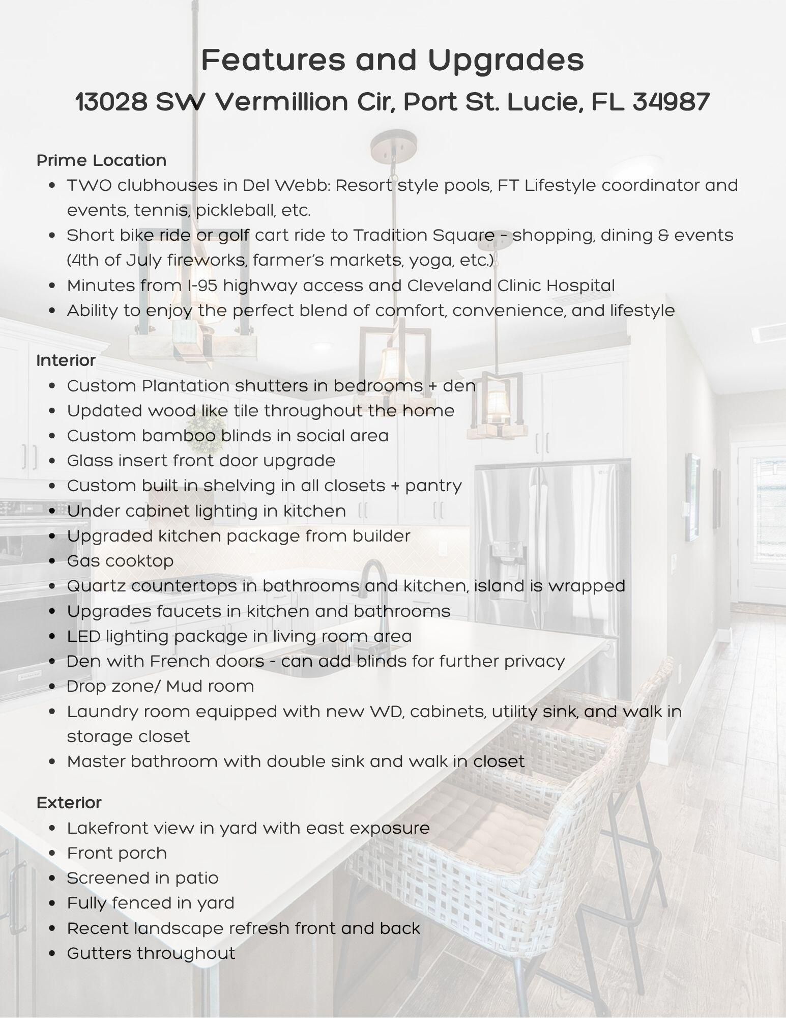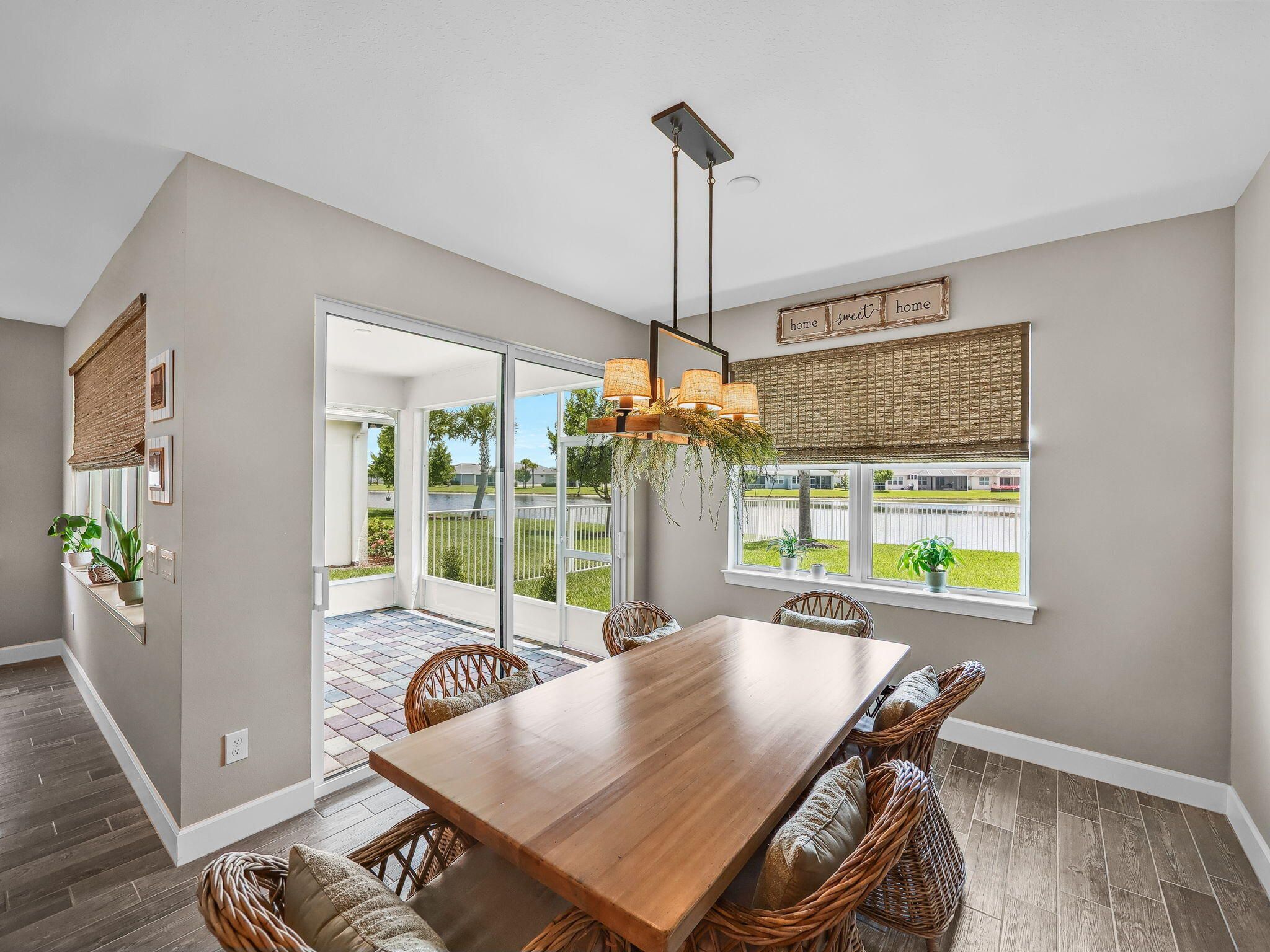 Perfectly positioned on a tranquil, east-facing lake, this impeccably appointed 2-bedroom residence with a private den and 2 baths showcases elevated design, thoughtful upgrades, and effortless elegance. Wood-look tile flooring flows seamlessly throughout, complemented by quartz countertops and a chef-inspired kitchen featuring an upgraded appliance package with gas cooktop—ideal for both everyday living and entertaining. French doors enclose the den, offering a flexible space well suited for a sophisticated home office, media lounge, or guest retreat. The interior is further enhanced by custom closet built-ins, plantation shutters, bamboo blinds, under-cabinet lighting, an LED living room package, and a glass-insert front entry that adds architectural character and natural light. The expansive mud and laundry room is as functional as it is refined, complete with new washer and dryer, custom cabinetry, a utility sink, and a walk-in storage closet. Outdoors, the screened patio provides a serene setting to enjoy sunrise lake views, while the fully fenced yard offers privacy and peace of mind. Residents of Del Webb at Tradition enjoy a truly resort-inspired lifestyle, with access to an elegant clubhouse, state-of-the-art fitness center, resort-style pool, tennis and pickleball courts, and an impressive calendar of social clubs and curated events. Ideally situated in the heart of Tradition, this home is moments from upscale shopping, dining, entertainment, the Cleveland Clinic Tradition Medical Center, and offers convenient access to I-95.