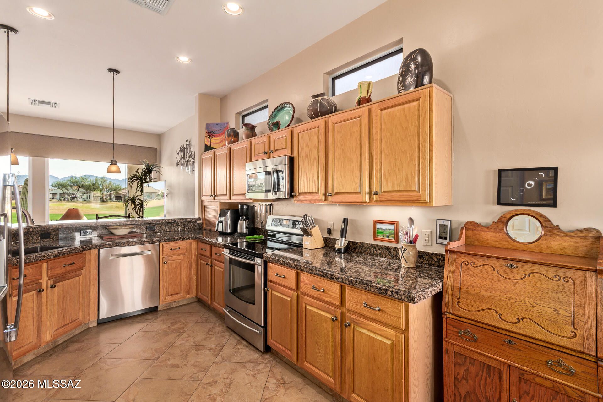 Sundrenched and move-in ready, this Extended Keystone model sits on the fairway just short of the 6th green, offering spectacular golf course and mountain views. Enjoy an east-facing backyard for perfect morning light and gorgeous sunrises.. Home features newer tile floors in living areas, carpeted bedrooms, an extended 2nd bedroom, and a versatile bonus room with built-in desk and laundry closet. Kitchen boasts bay windows and granite counters. Full wall of windows and sliders, plus a covered patio with post removed for unobstructed views! Updated primary bath. Resort-style amenities: 24-hr security, clubhouse, restaurant/bar, pickleball, tennis, pool, spa & more! Close to many hiking and biking trails, down the road from the Ritz Carlton-Dove Mountain.