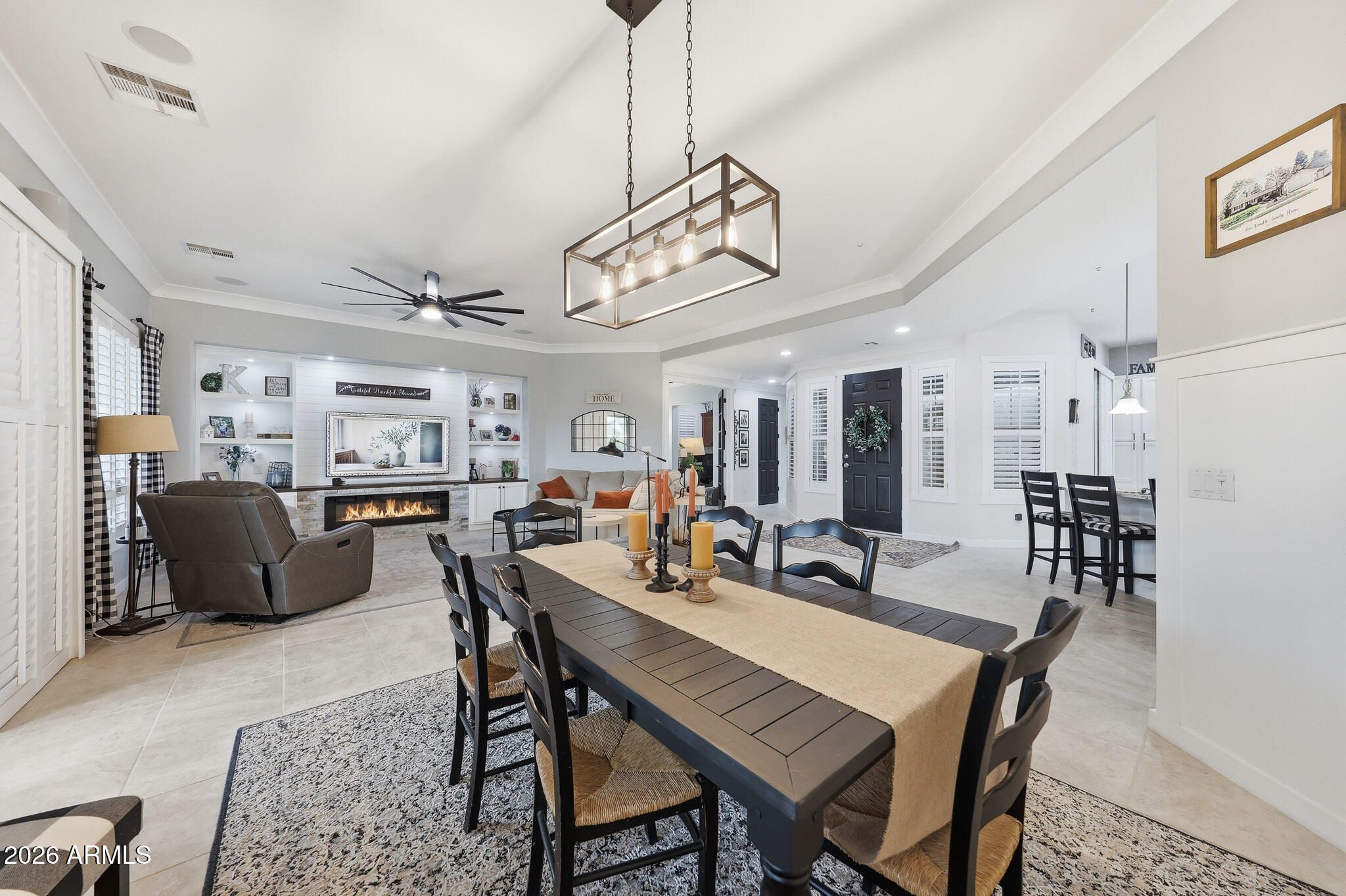 Located behind the prestigious gates of Trilogy at Vistancia, this extensively upgraded Civitas Model is ideally situated on an oversized corner lot with desirable north/south exposure, offering refined elegance and resort-style living. With over $100,000 in upgrades and features, this home showcases quality enhancements, 9 ft ceilings & plantation shutters T/O. A private gated courtyard with a statement fountain and custom pergola welcomes you into a beautifully appointed interior featuring an open-concept great room with a custom designer entertainment wall, crown moulding, fresh interior paint, surround sound, fireplace, and expansive windows overlooking the covered patio and sparkling pool. The upgraded chef's kitchen features painted cabinetry, updated countertops, and backsplash, pull out roller drawers, newly installed gas stovetop (2025), updated sink and plumbing fixtures, built-in stainless appliances, and a generous breakfast bar. The private primary suite offers carpeted floors and a fully remodeled spa-inspired shower with dual sinks and a spacious closet. Guest bath is also remodeled. Secondary bedroom is privately located, ideal for visitors. A dedicated den with built-in desk and cabinetry functions perfectly as an office or flex space. The laundry room includes extensive cabinetry and a utility sink. Step outside to your private resort-style backyard oasis featuring a sparkling pool with variable-speed pump, built-in Coyote Outdoor Living gas grill, outdoor speakers, ceiling fans, misters, roll-down shades, conversation area and covered patio creating the ultimate setting for relaxation and entertaining. The extended garage offers epoxy floors and overhead storage racks, providing exceptional space and organization. Major upgrades include: Two new A/C units (2025) with Ecobee thermostats; soft water system & reverse osmosis; central vacuum system with new kit (2025); Enphase Energy solar inverter; Interior and Exterior Paint. Energy-efficient owned solar helps keep electric bills low. Exceptional opportunity to enjoy luxury living in one of Peoria's premier 55+ gated communities.