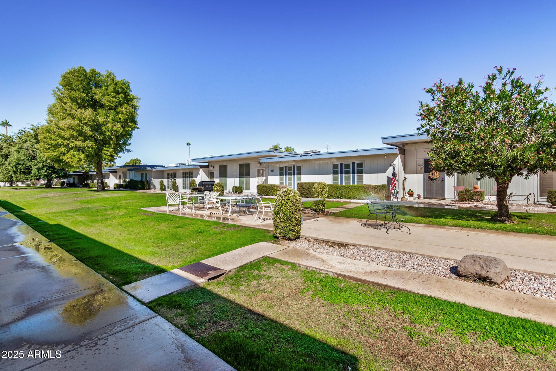 Experience vibrant adult living in Sun City with this charming 2-bedroom unit in a coveted location! You're welcomed by a serene living room with high ceilings, a fresh palette, blinds, and attractive wood-look flooring. The well-appointed kitchen comes with crisp flat-panel cabinetry, essential built-in appliances, and a center island for added prep space. You'll also find a bright sunroom, perfect for enjoying the warm Arizona weather year-round. The primary bedroom showcases a private bathroom and a walk-in closet for an organized wardrobe. The practical garage provides a laundry area and attached cabinets for additional storage. Unwind at the end of a long day on the cozy patio, perfect for enjoying a good book or a refreshing drink. Make it yours today!