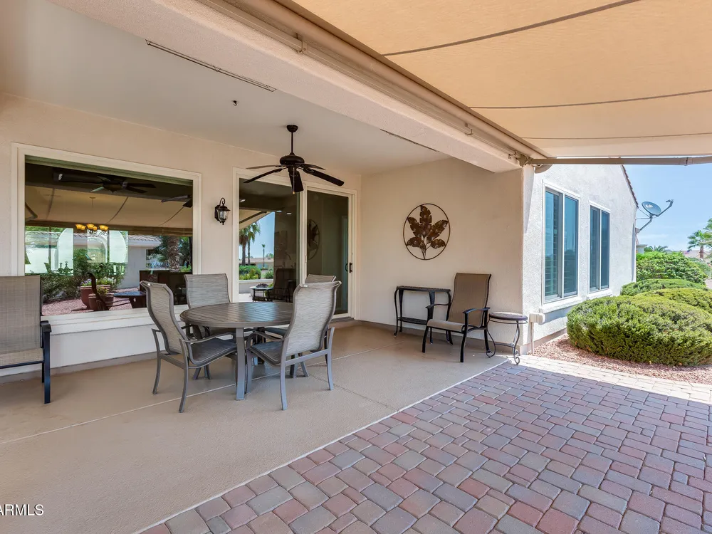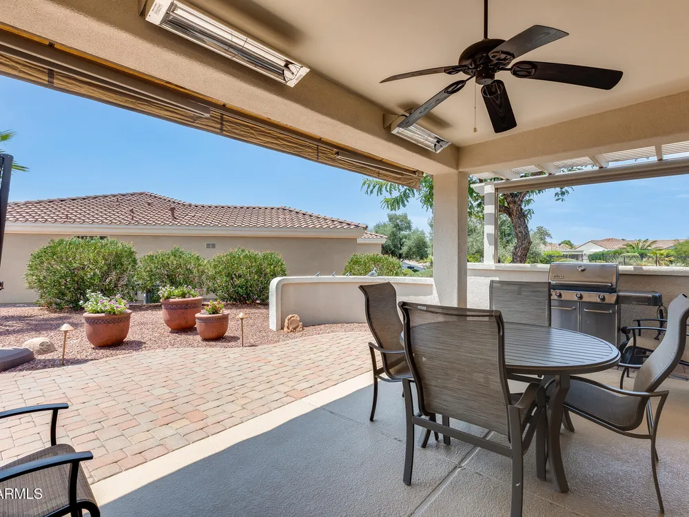 Enjoy resort-style living in the gated Corte Bella Country Club! This beautifully maintained home offers stunning fairway views from the patio, perfect for relaxing evenings by the fire pit under the stars or gathering with friends. Watch hummingbirds over morning coffee in the private courtyard. Inside, the open kitchen flows into the dining and great room, ideal for entertaining. The split master layout ensures privacy. Features include new Anderson Renewal windows, retractable patio shades, owned solar, and a new H2O whole-house water system—no softener needed. Breathtaking sunrises and sunsets complete this perfect retreat. Paid off solar panels provide energy savings right away with summer bills as low as $89!
